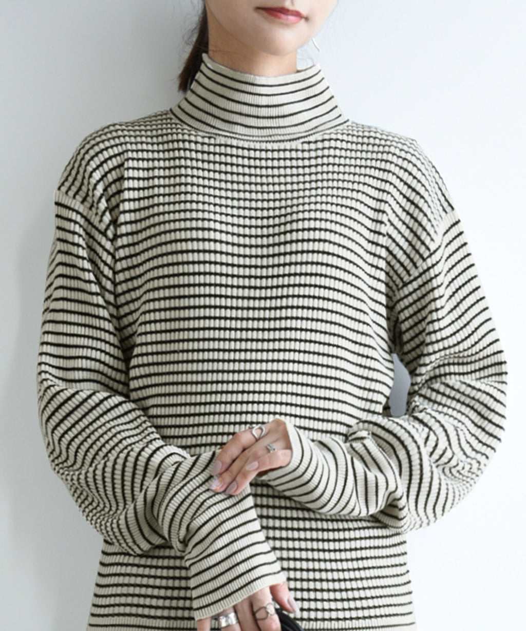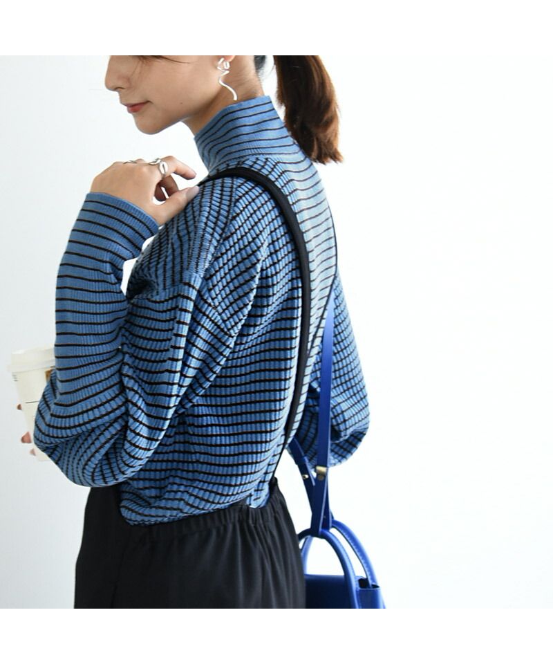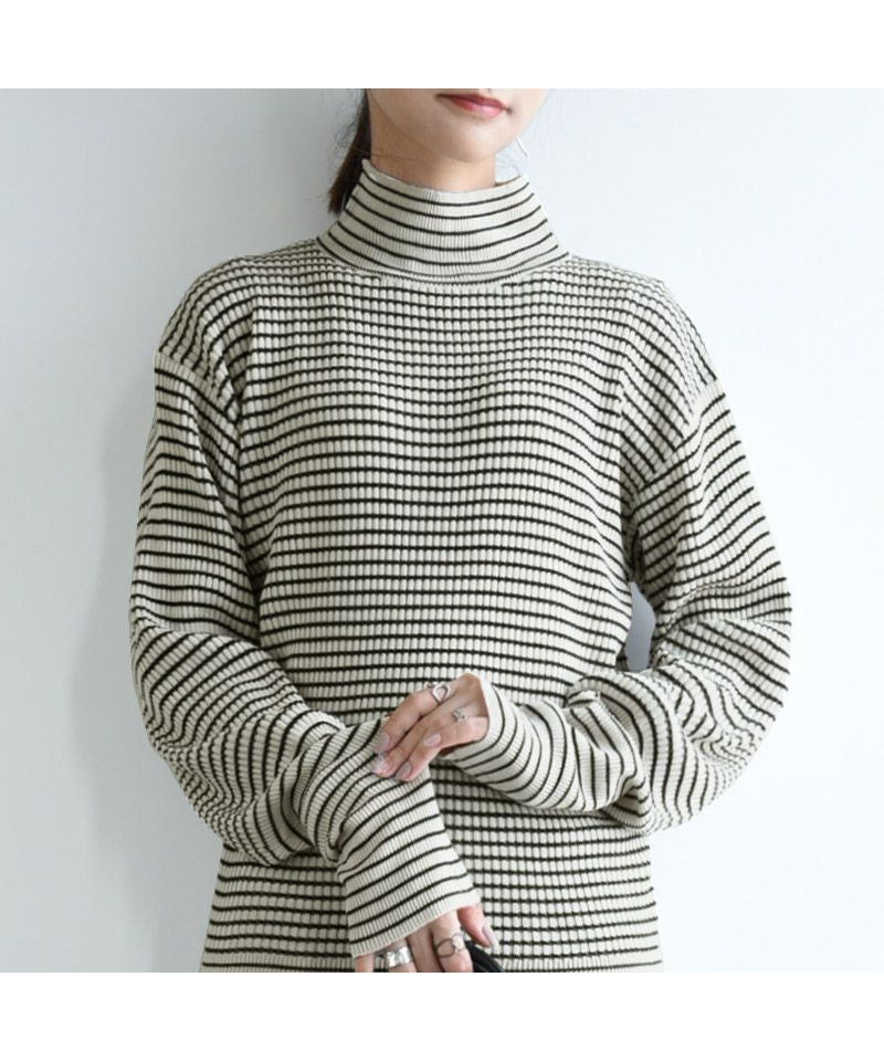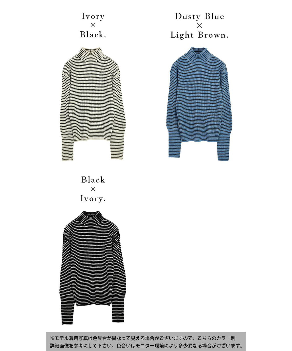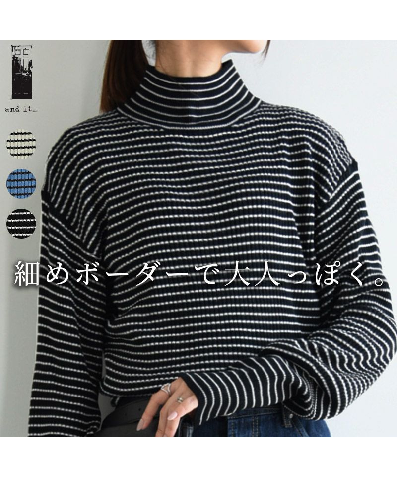 And it_ Balloon Sleeve Turtle Neck Border Rib Knit Knit Women's Rib Border Turtle Neck Balloon Sleeve Fabric Volume Sleeve Acrylic Thin Stripe Long Sleeve Lightweight