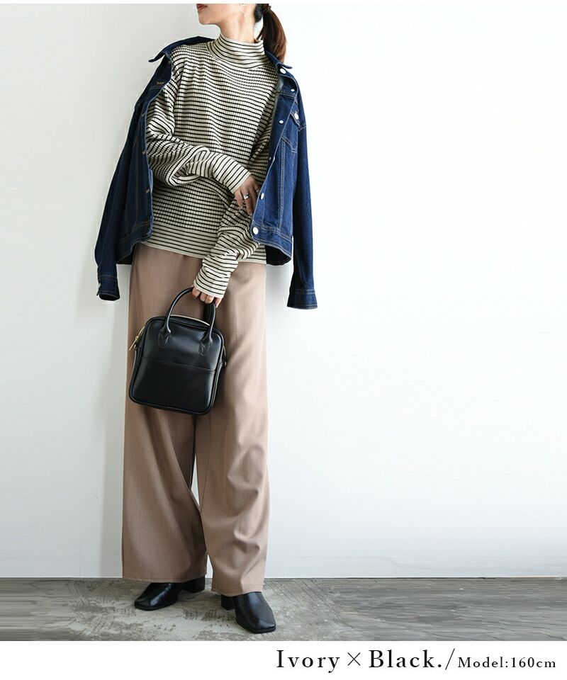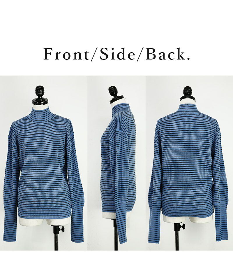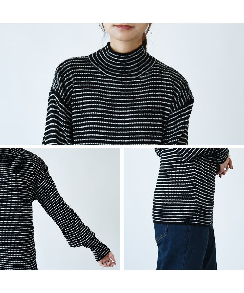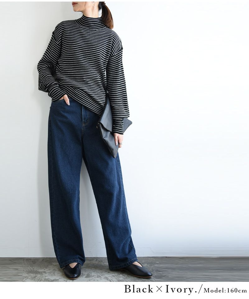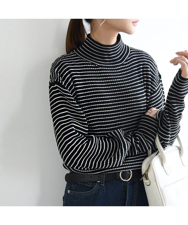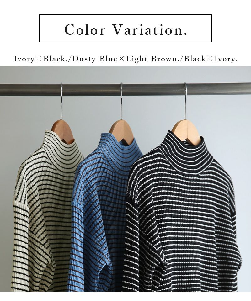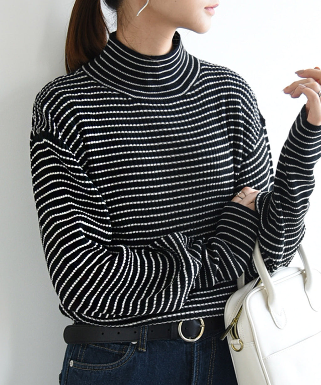 And it_ Balloon Sleeve Turtle Neck Border Rib Knit Knit Women's Rib Border Turtle Neck Balloon Sleeve Fabric Volume Sleeve Acrylic Thin Stripe Long Sleeve Lightweight
