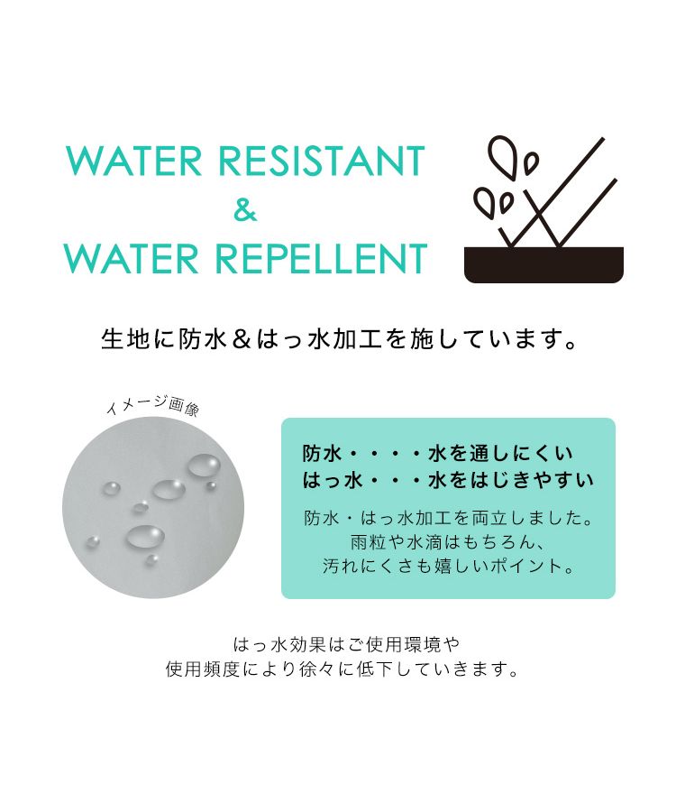 The fabric has been treated with a water-repellent finish. It has been treated to resist not only water droplets and raindrops but also dirt. *Please note that the water-repellent effect may gradually decrease depending on the usage environment and frequency of use. There may be some types of stains, such as oil-based ones, that are difficult to remove, so please be aware of this in advance.