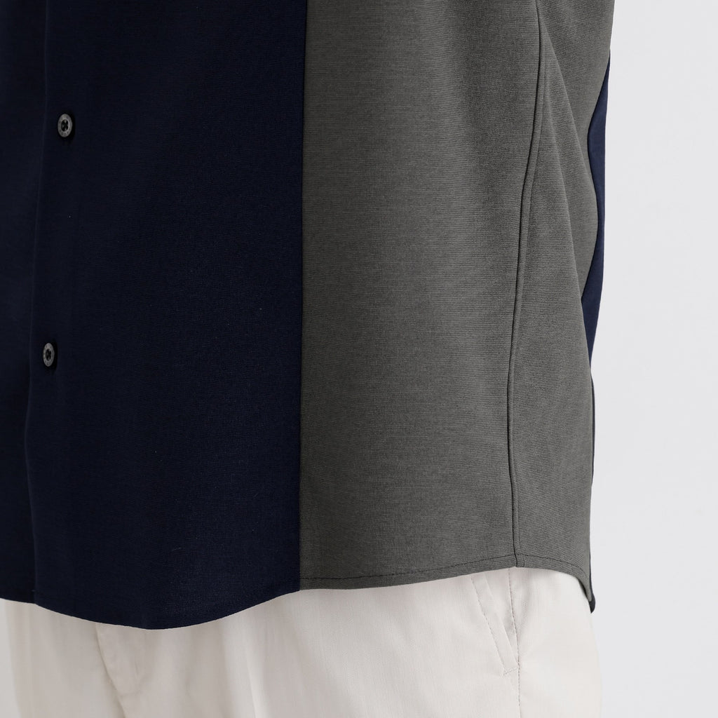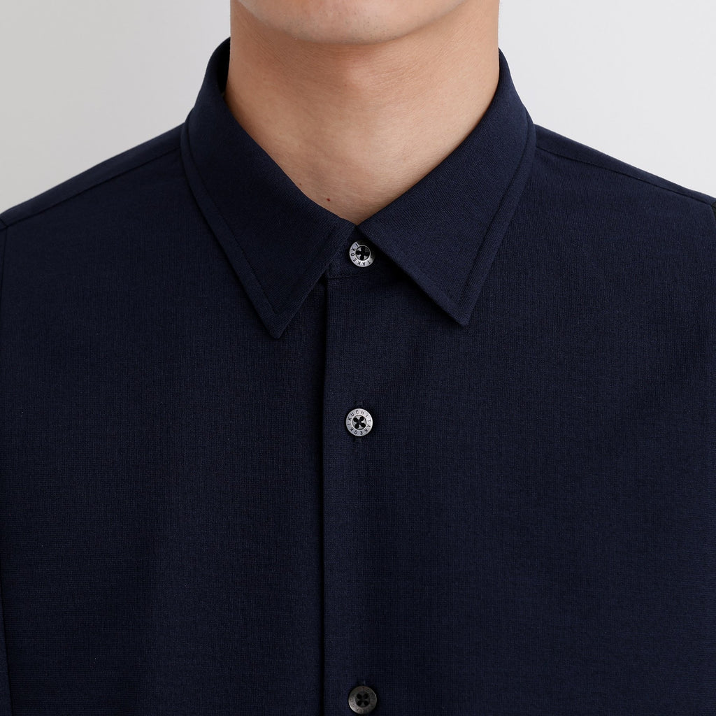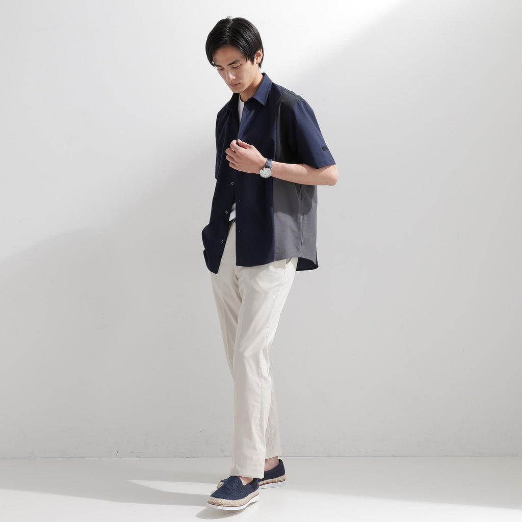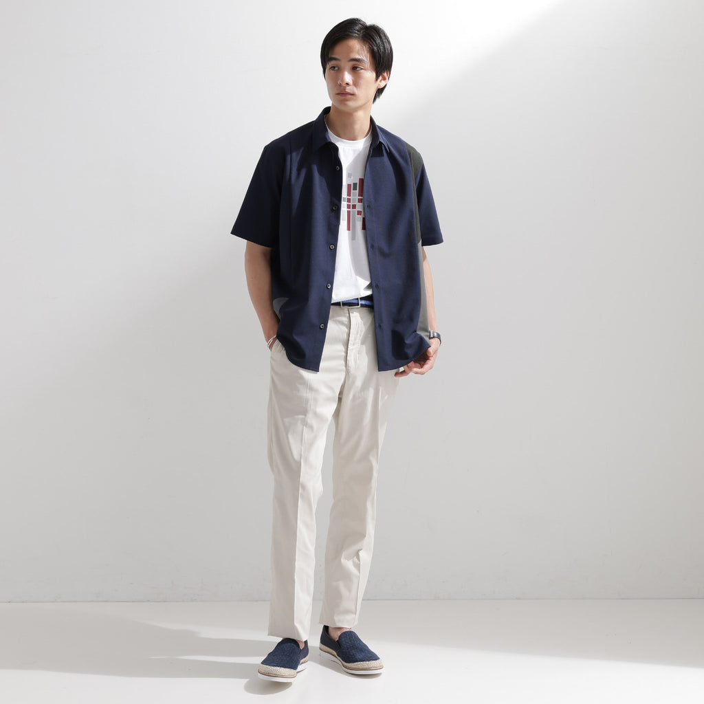 This garment combines the best features of cut-and-sew and shirt fabric, offering a tailored look similar to that of a shirt while possessing the stretchiness of cut-and-sew. It is characterized by a dry touch and lightweight material. It also has a moderate firmness, making it less clingy and helping to minimize the appearance of body lines, which is a nice point.