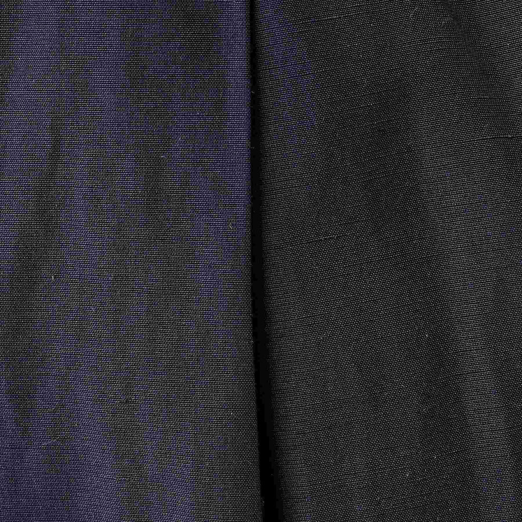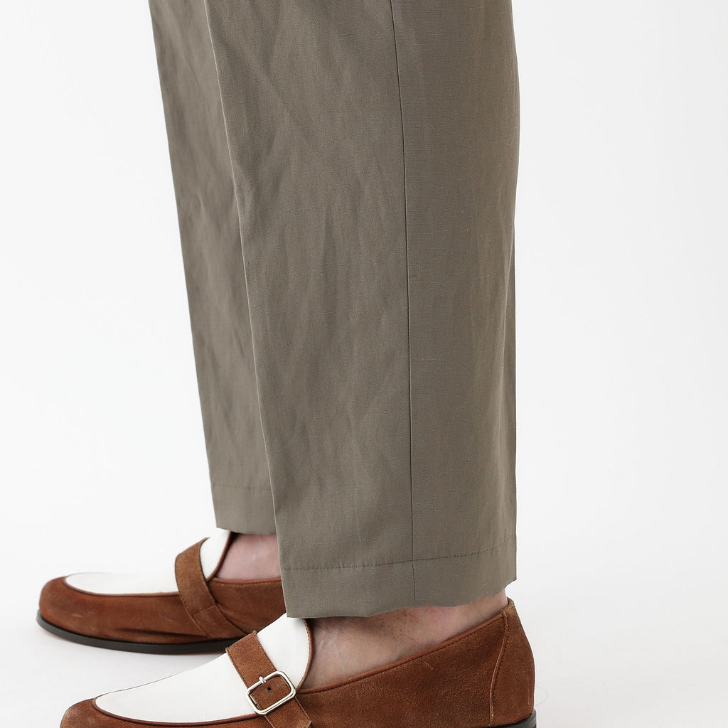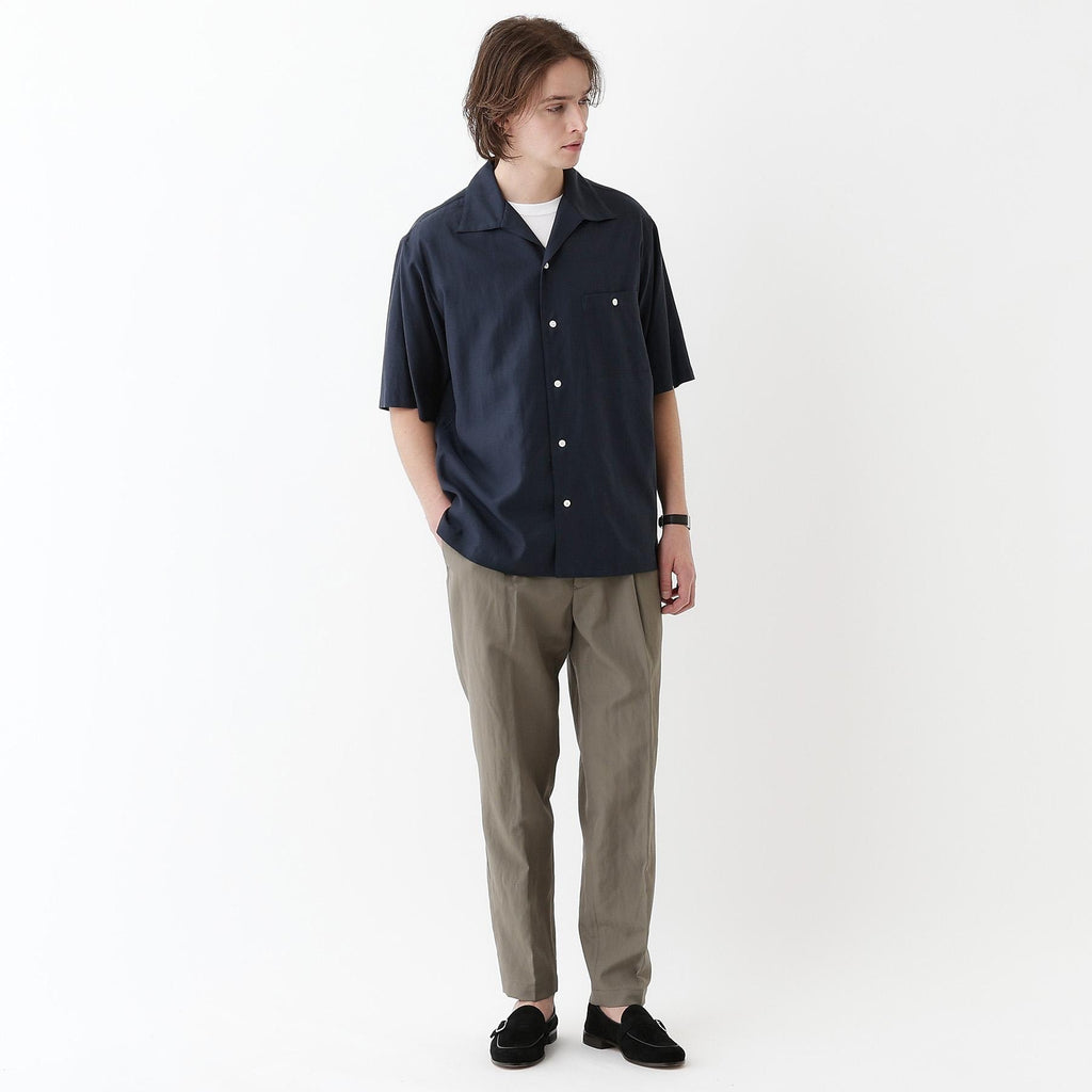 The high-density taffeta made of polyester and linen, woven in the Hokuriku region, known for its synthetic fabric production, is characterized by a moderately elegant subtle sheen, a suitable crispness of linen, the natural texture of slub, and a natural wrinkled feel that evokes lightness and freshness.
