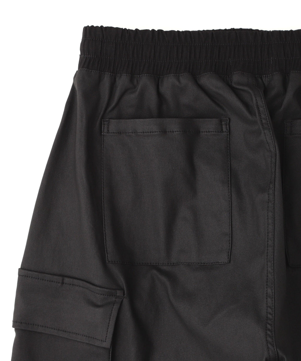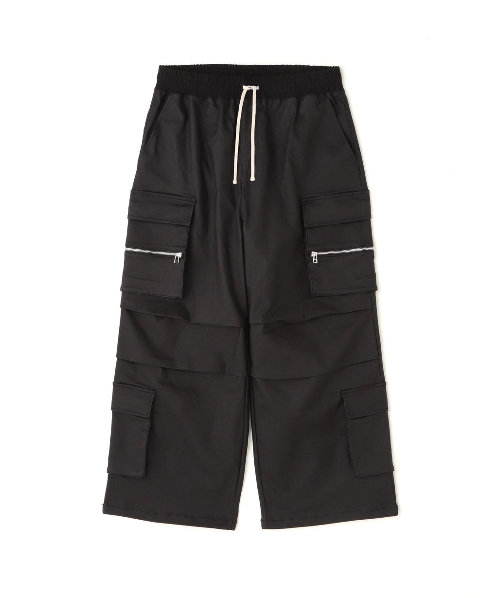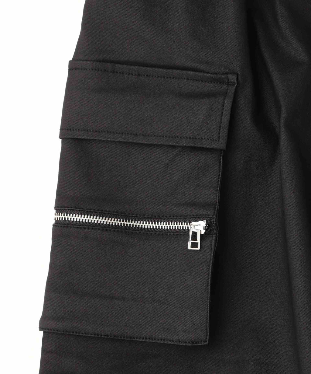 The silver zipper on the outside of the cargo pocket stands out against the black body.