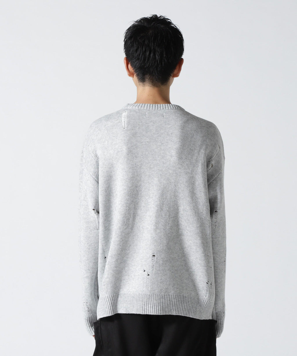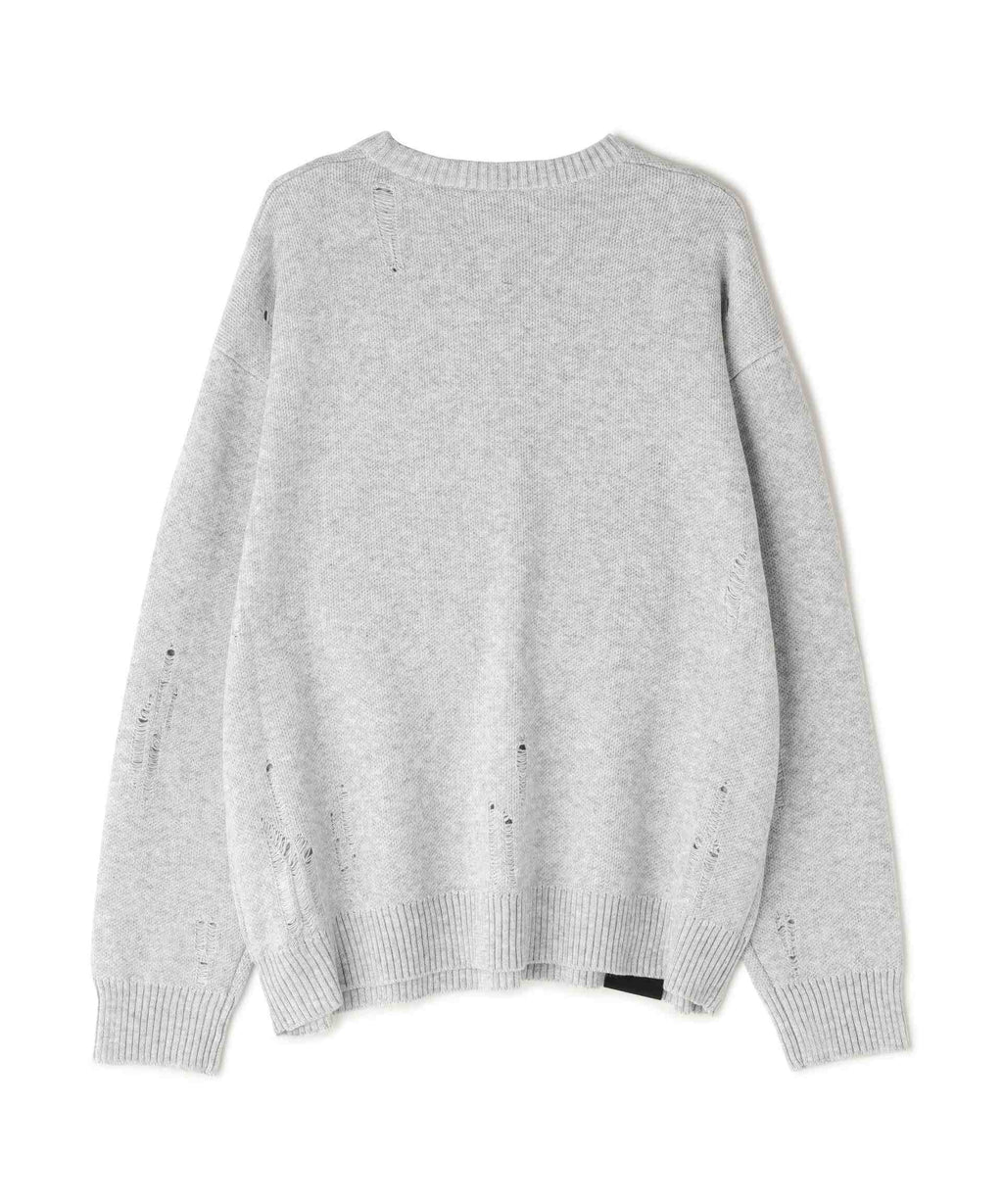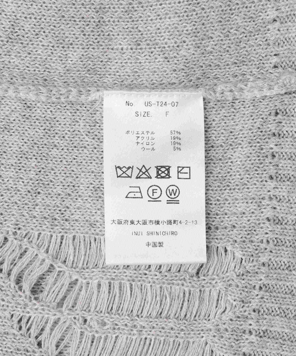Partially damaged processing is applied, with a wide width, drop shoulder, and overall comfortable fit.