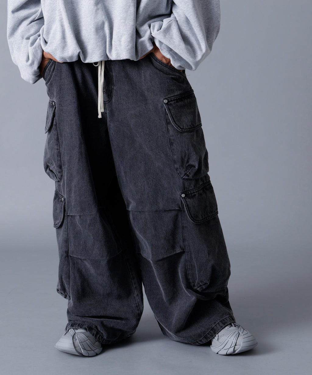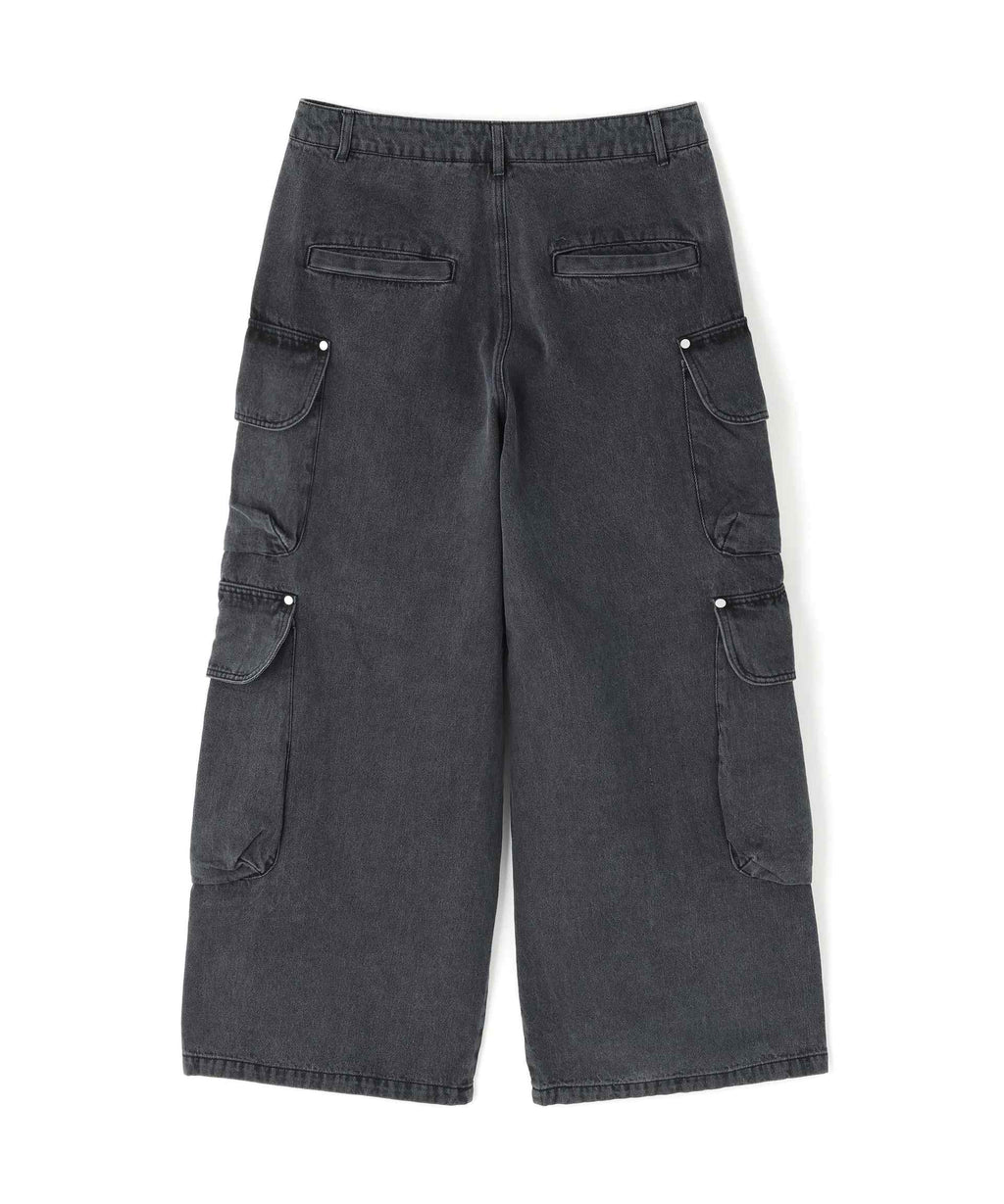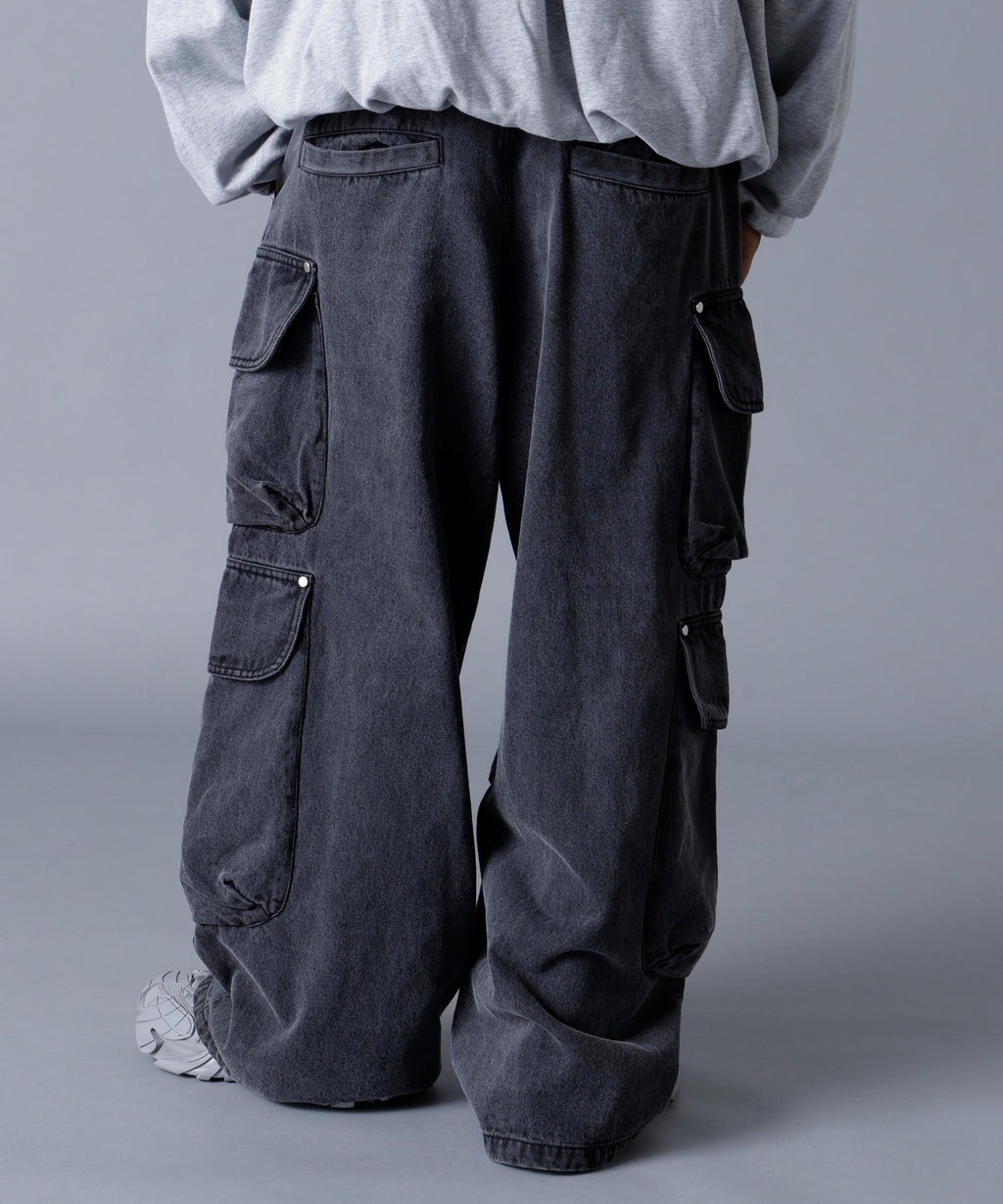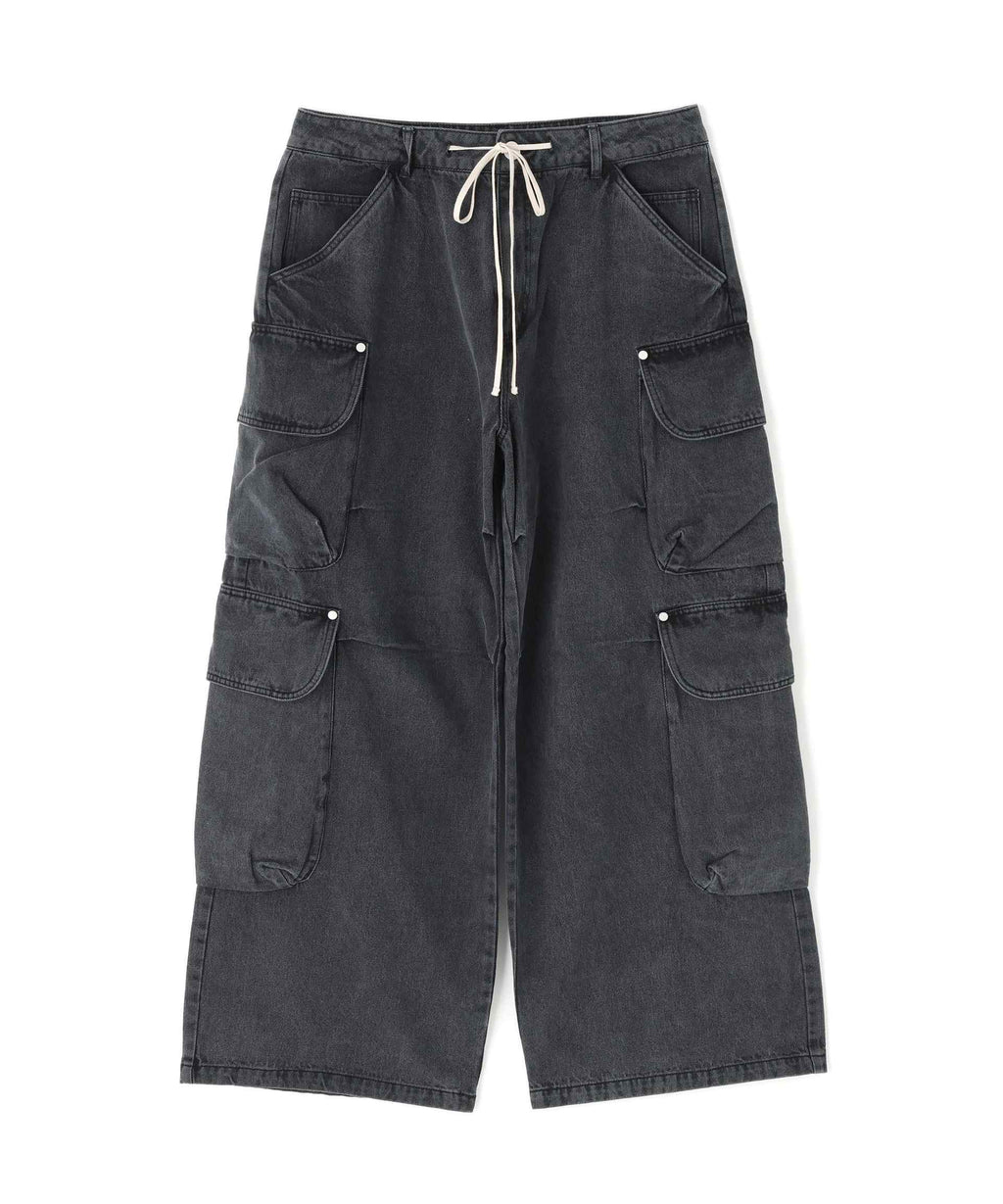 Eye-catching denim cargo pants with a vintage feel, finished with chemical wash processing.