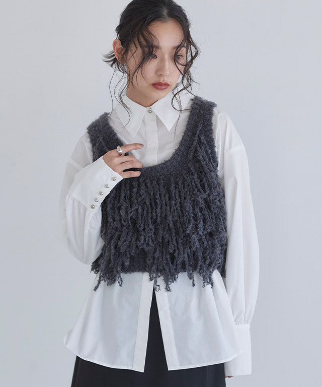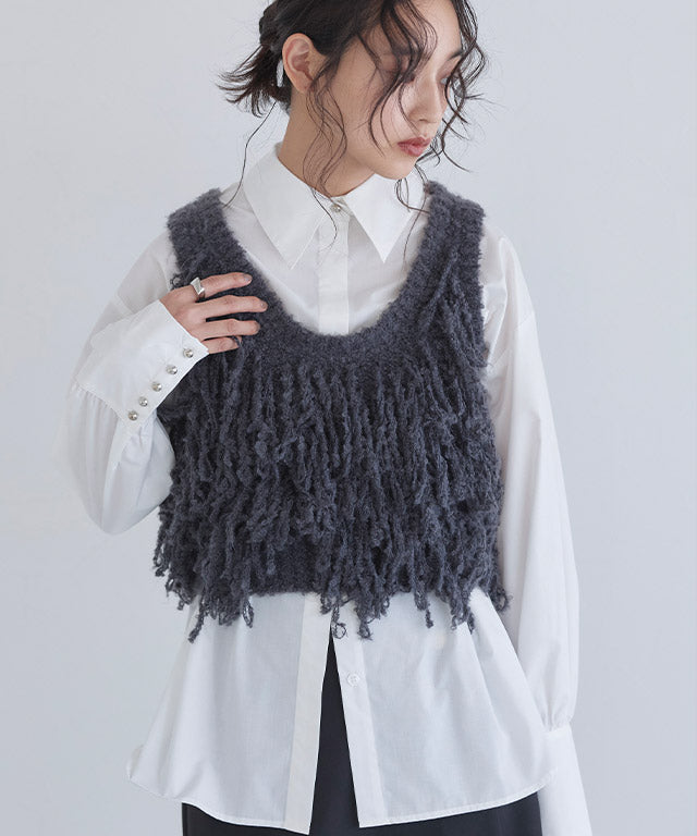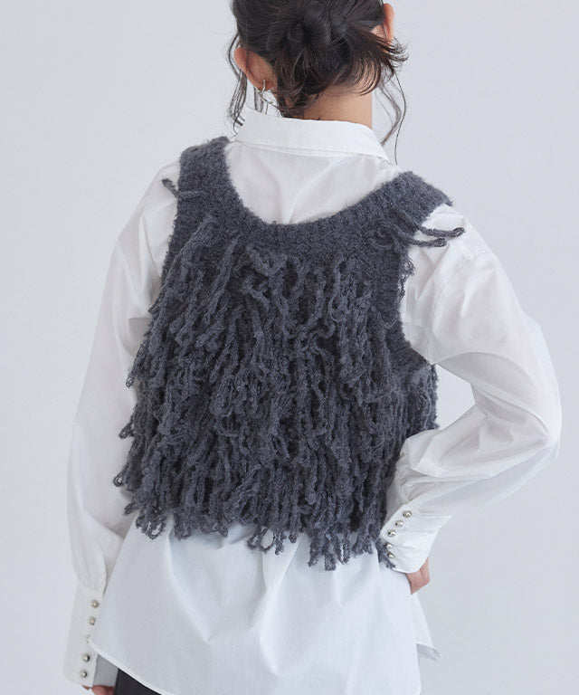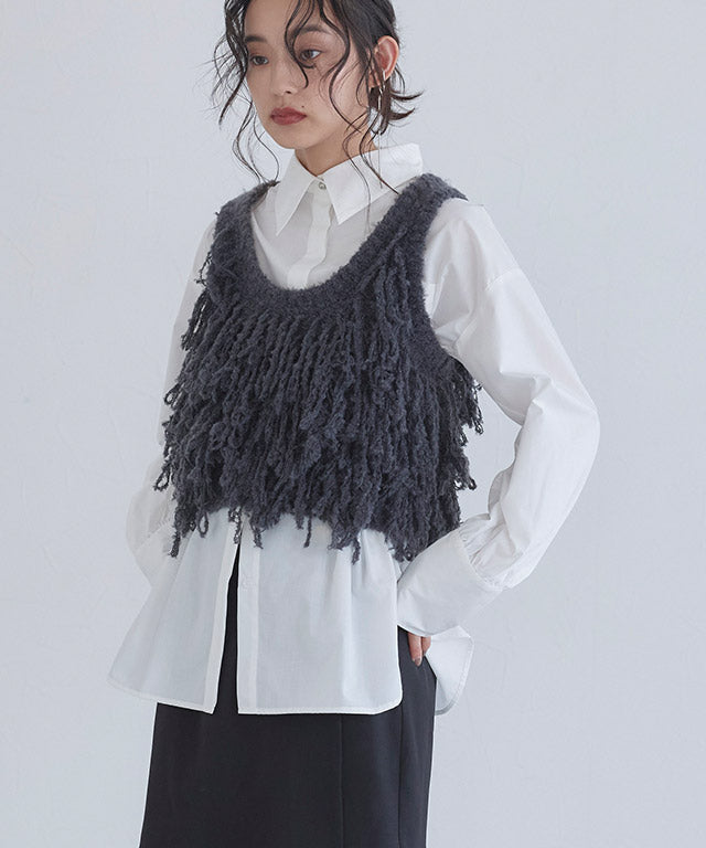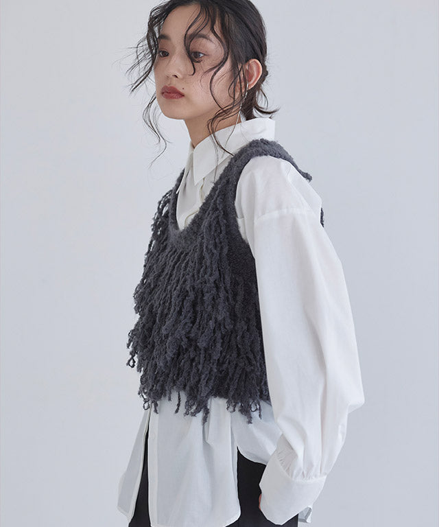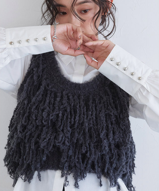 A knit vest with a luxurious use of expressive loop yarn that has a strong presence. Its fluffy three-dimensional texture is characteristic, and just incorporating one into a simple coordinate creates a trendy look. The relaxed U-neckline enhances a sense of ease and femininity.