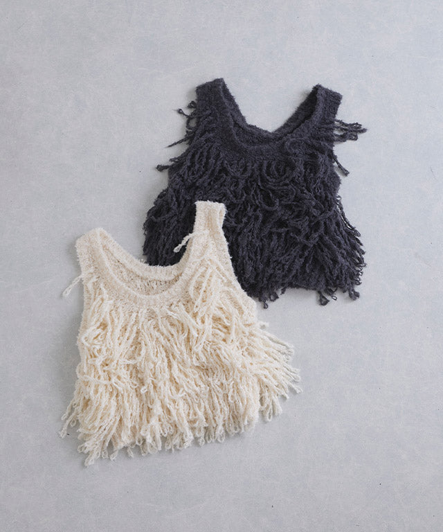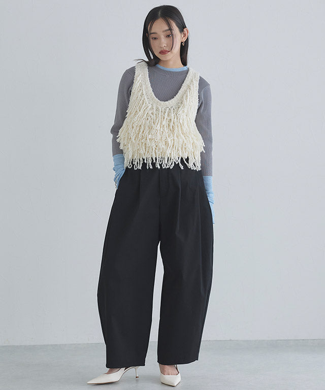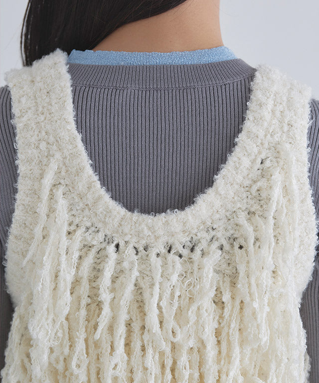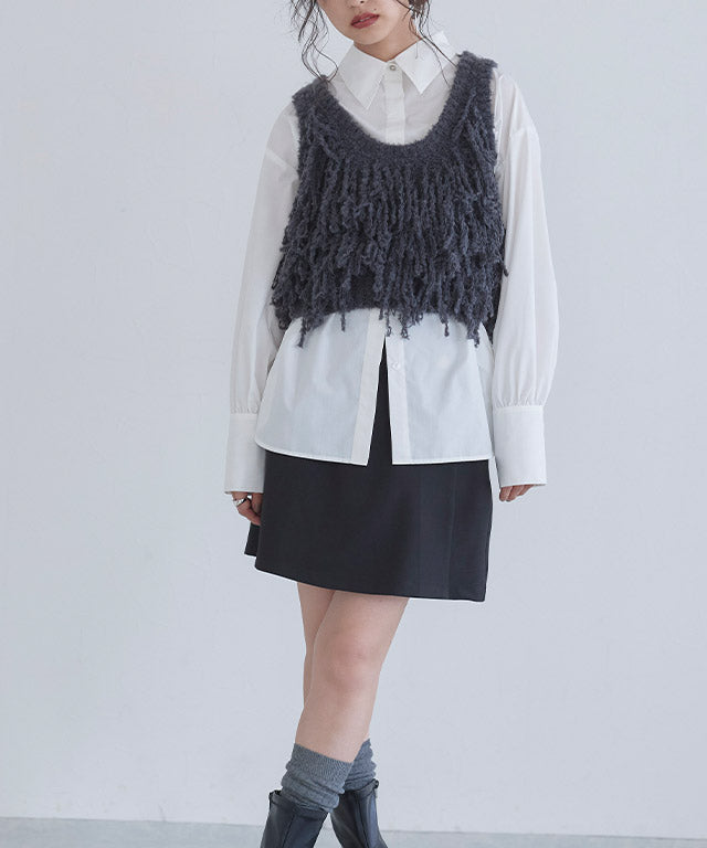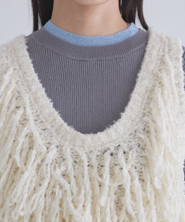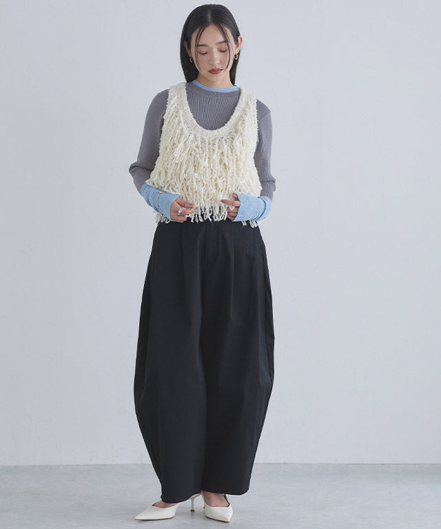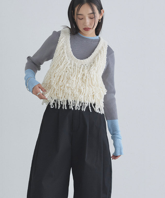 A knit vest with a luxurious use of expressive loop yarn that has a strong presence. Its fluffy three-dimensional texture is characteristic, and just incorporating one into a simple coordinate creates a trendy look. The relaxed U-neckline enhances a sense of ease and femininity.