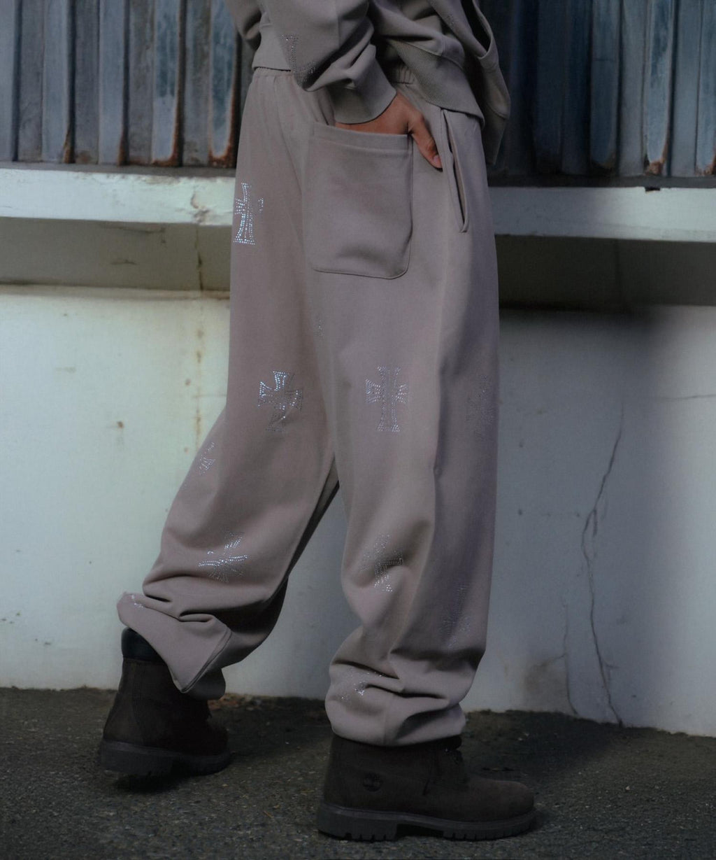 Sweatpants adorned with the cross motif with rhinestones, which can be said to be a trademark of UNKNOWN LONDON.