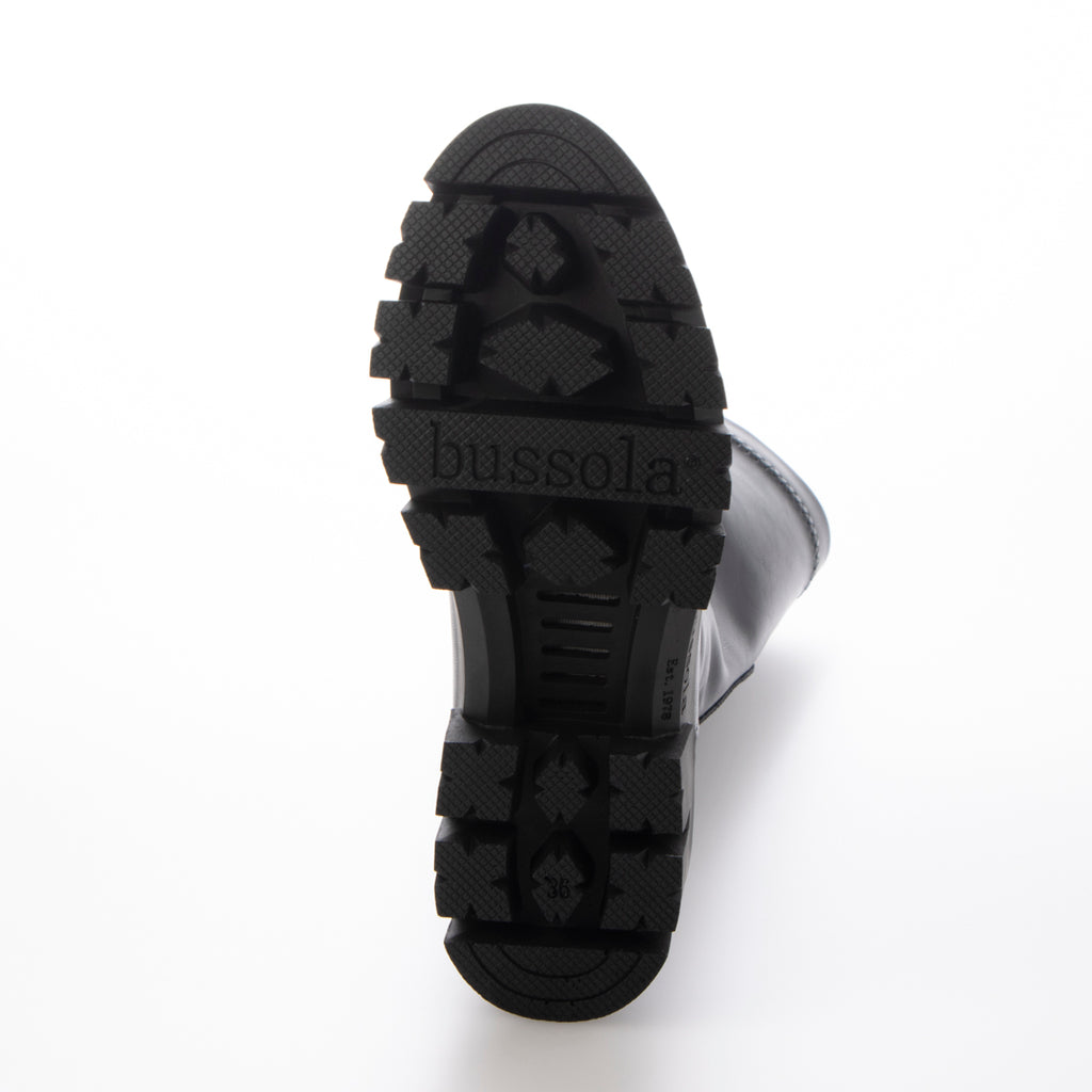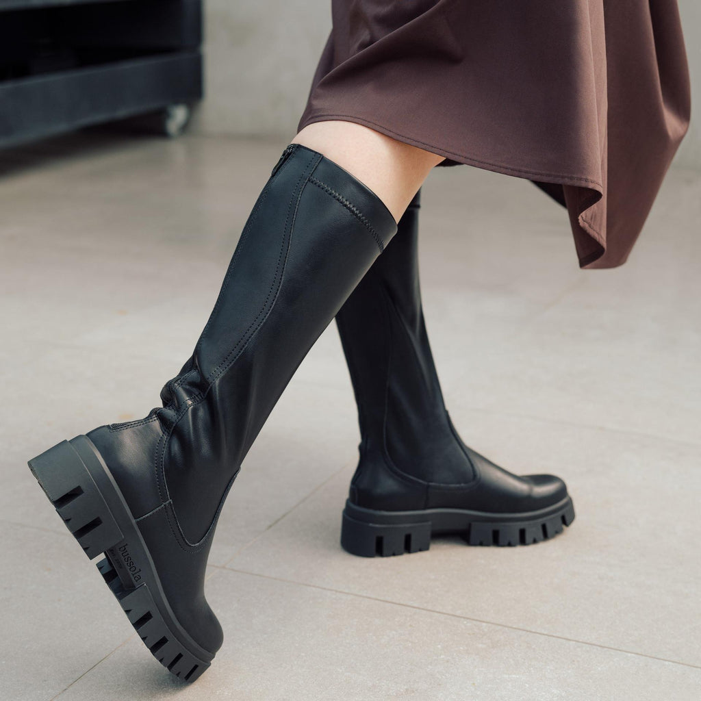 Water-repellent processed thick-soled long boots made of genuine leather and synthetic leather.