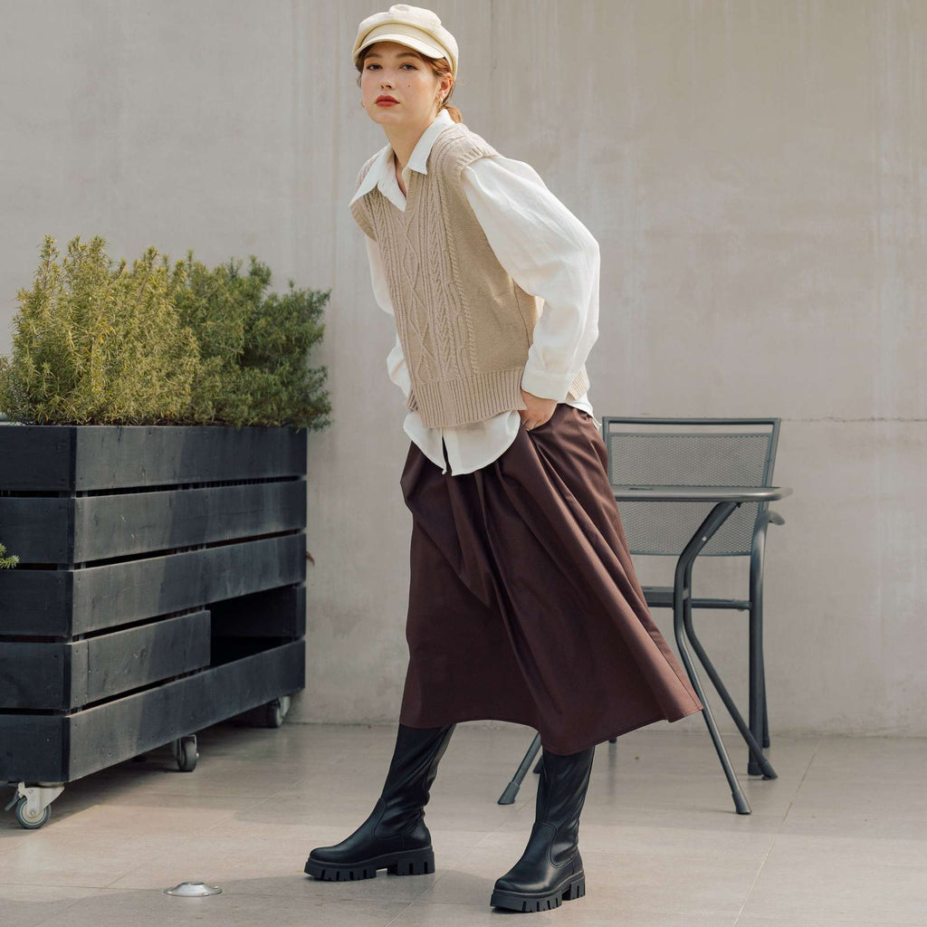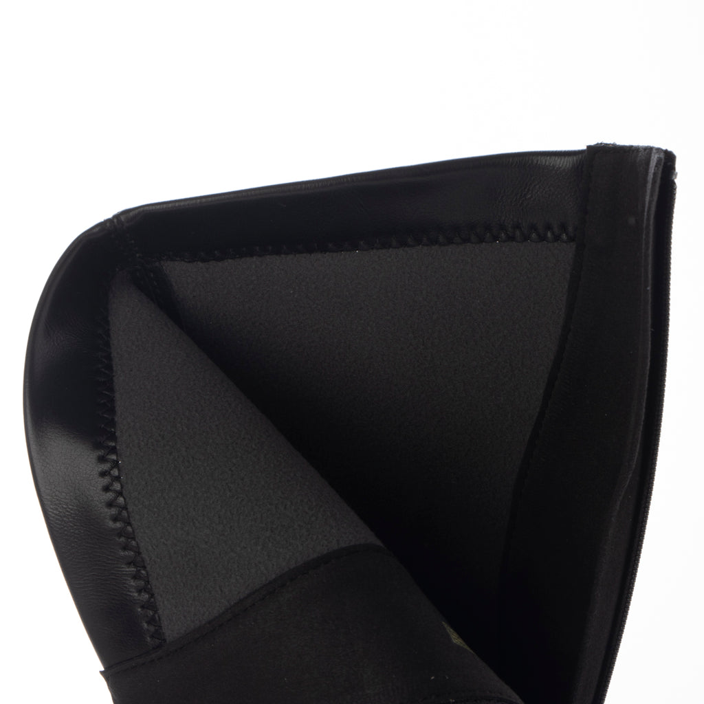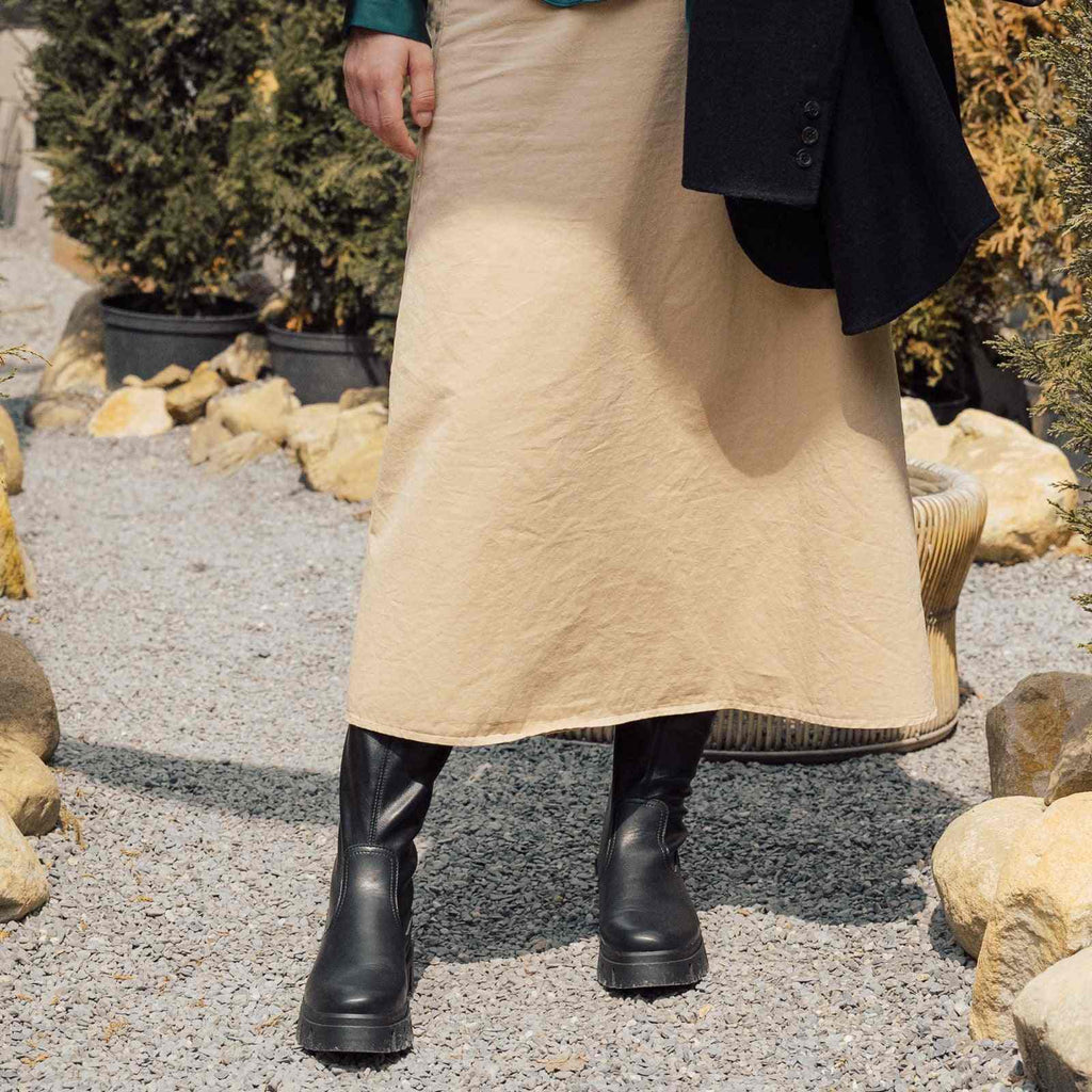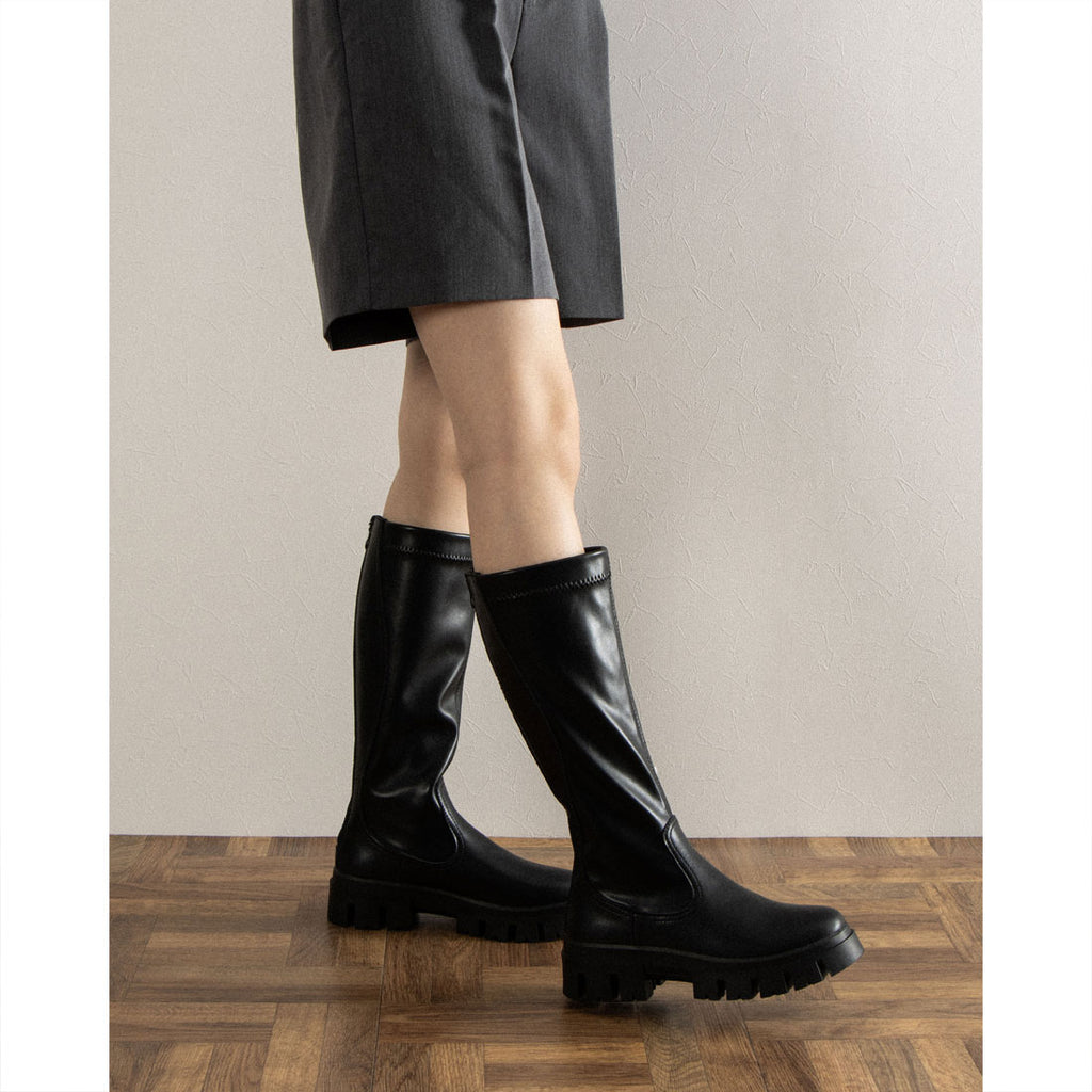 The shaft part uses elastic synthetic leather, providing a soft fit that gently conforms to the leg.