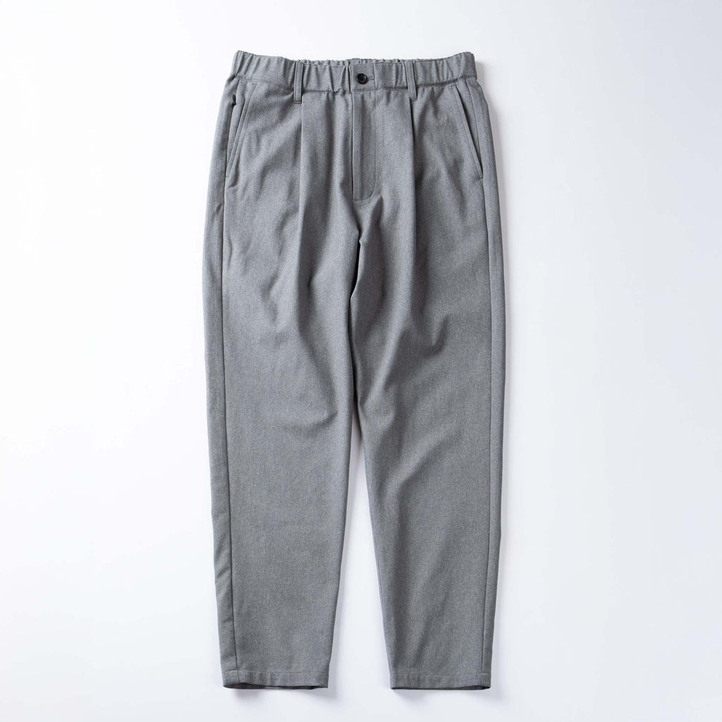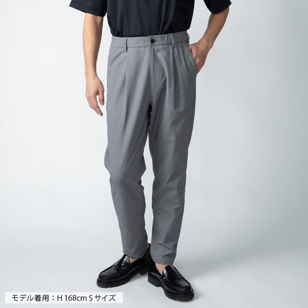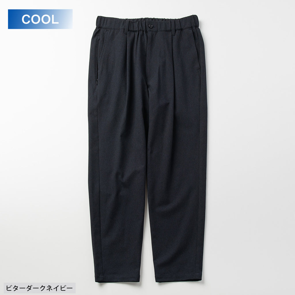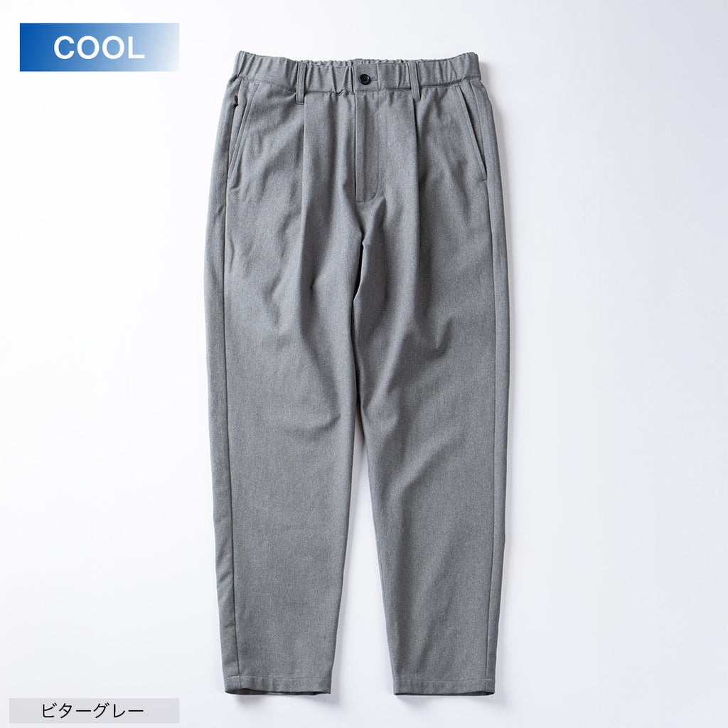 Pants with a tapered silhouette featuring tucks, achieving a summer-like clean and fresh style.