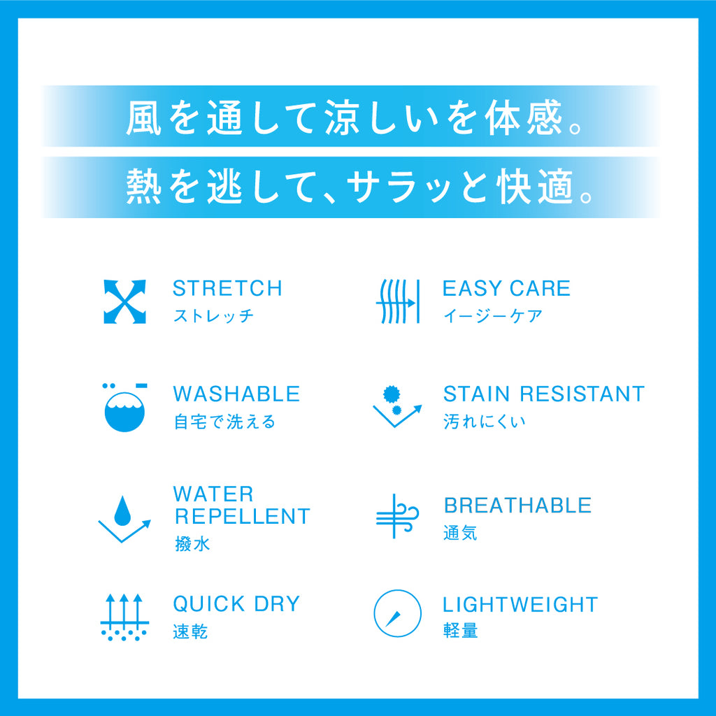 "Washable function" that can be washed every day at home and "tough durability." The "ultimex" has a wealth of features that are great for everyday use, such as "stretch, water-repellent, quick-drying, resistant to dirt, and wrinkle-resistant." It also has fine ventilation holes that do not compromise the appearance, adding "breathability." It eliminates the "sheerness" typical of summer suits. The quick-drying property eliminates stickiness, achieving a light and comfortable feel against the skin. This is an original fabric specialized for hot and humid summers. (100% polyester)