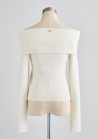 An off-shoulder top that beautifully and delicately enhances women's appearance has been created with soft knit. The carefully adjusted opening allows the collarbone and shoulders to look elegantly beautiful, while the longer sleeve length emphasizes femininity and creates a delicate look. The length is also designed for ease of tucking in.