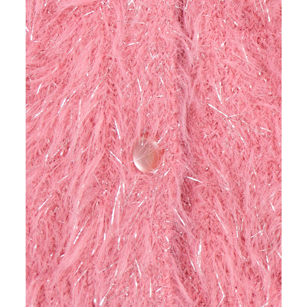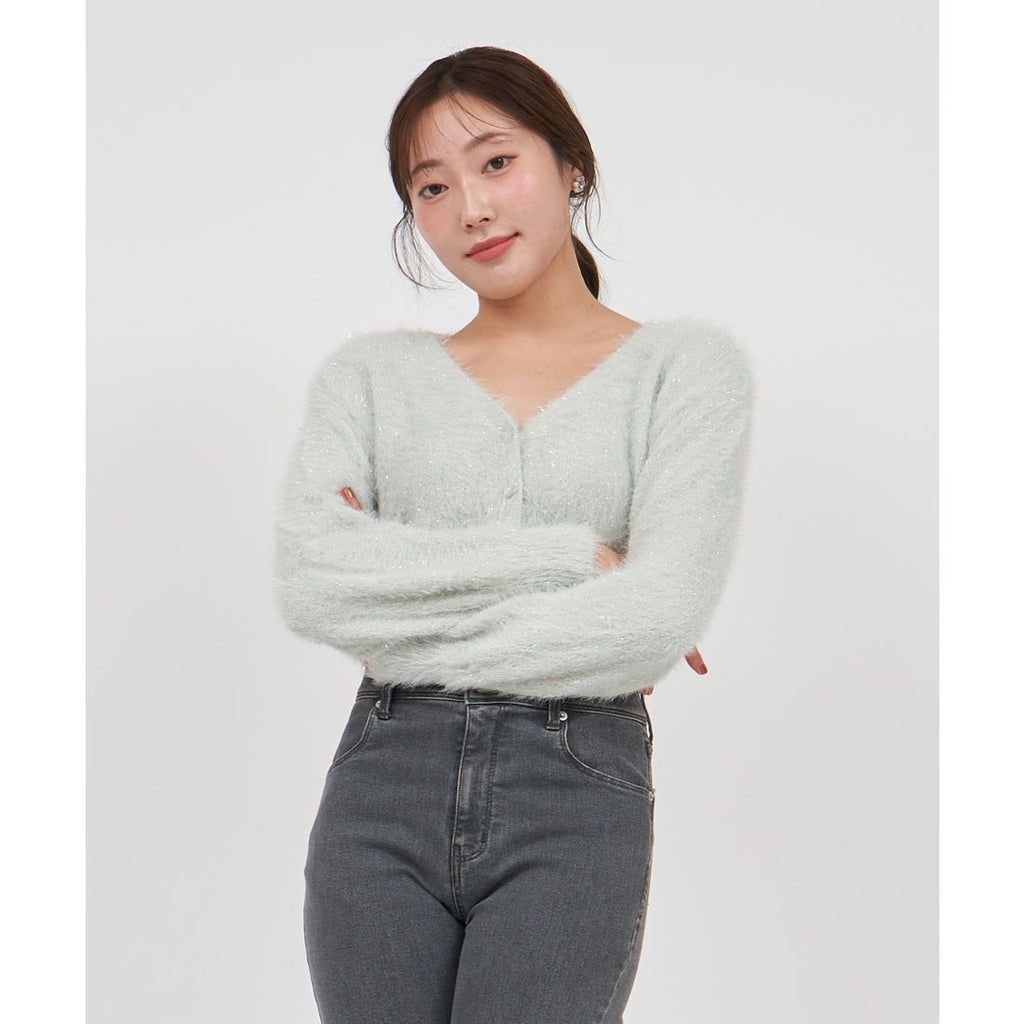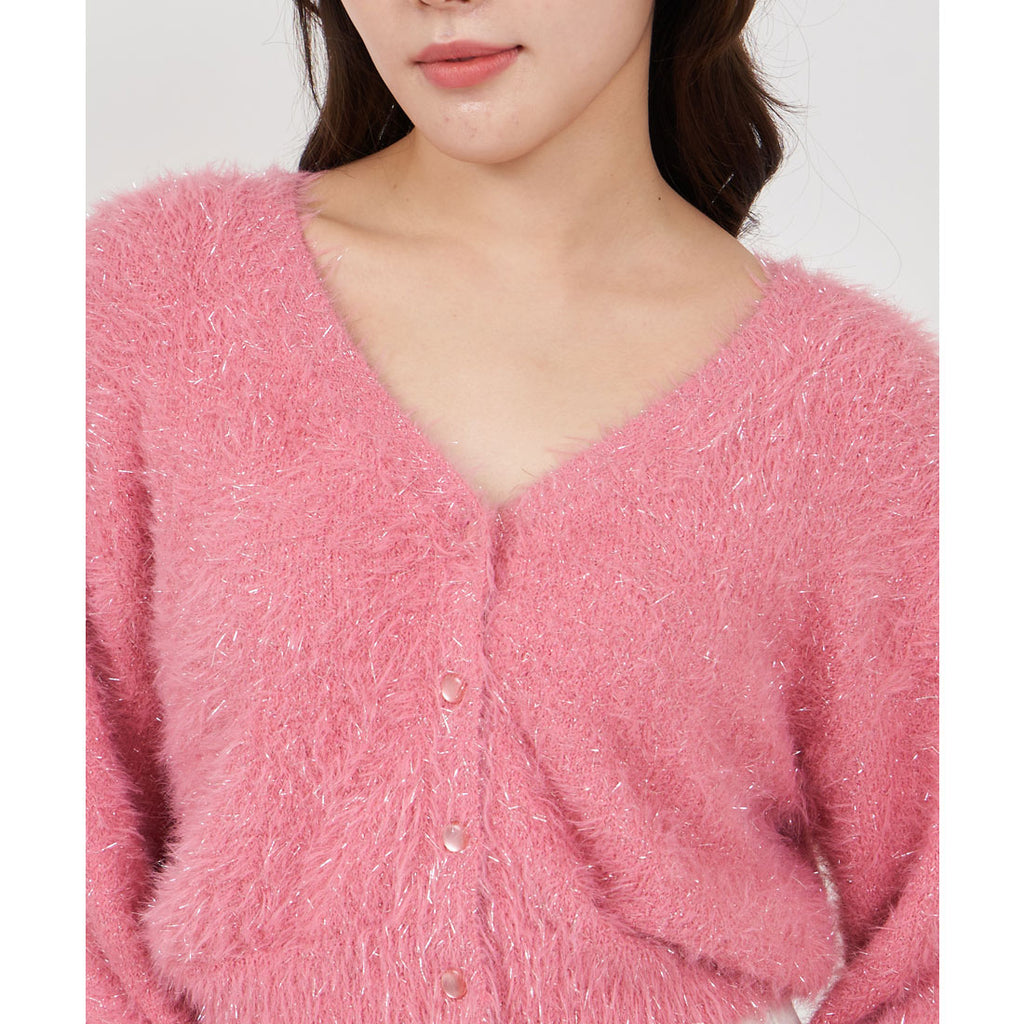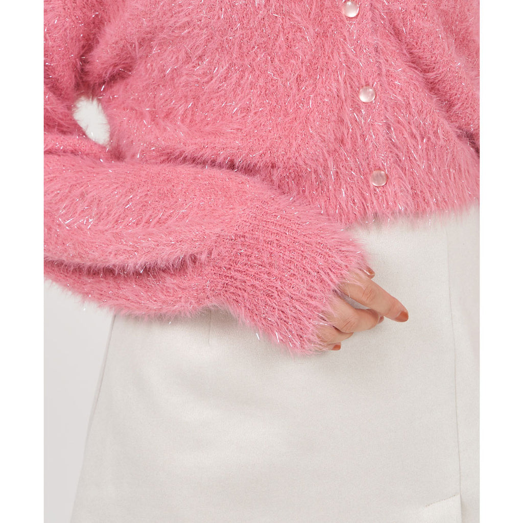 A women's shaggy knit cardigan with a sophisticated sparkle from the lamé thread and a moderate volume that is appealing.