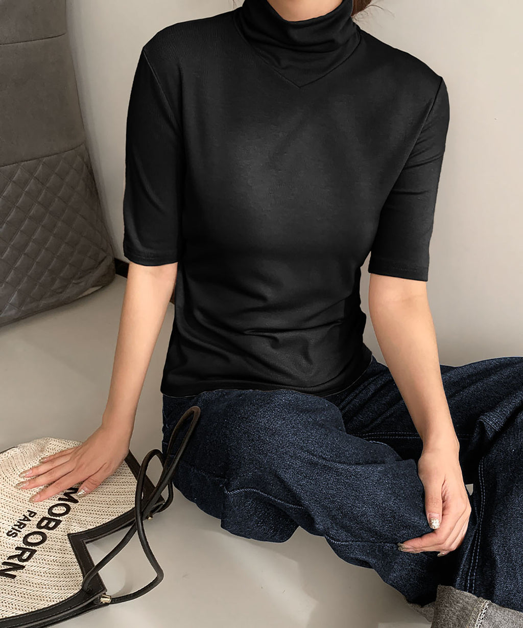 A charming short-sleeve cut-and-sew with an elegant high-neck design.
