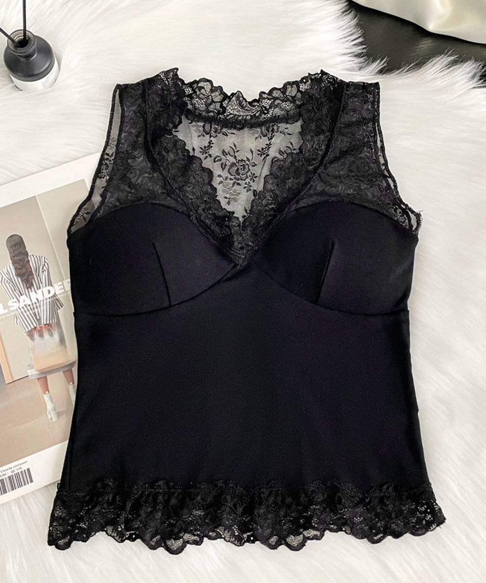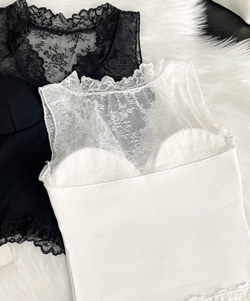 The lace design applied to the shoulders, chest, and hem combines cuteness and sexiness in this bra top with cups.