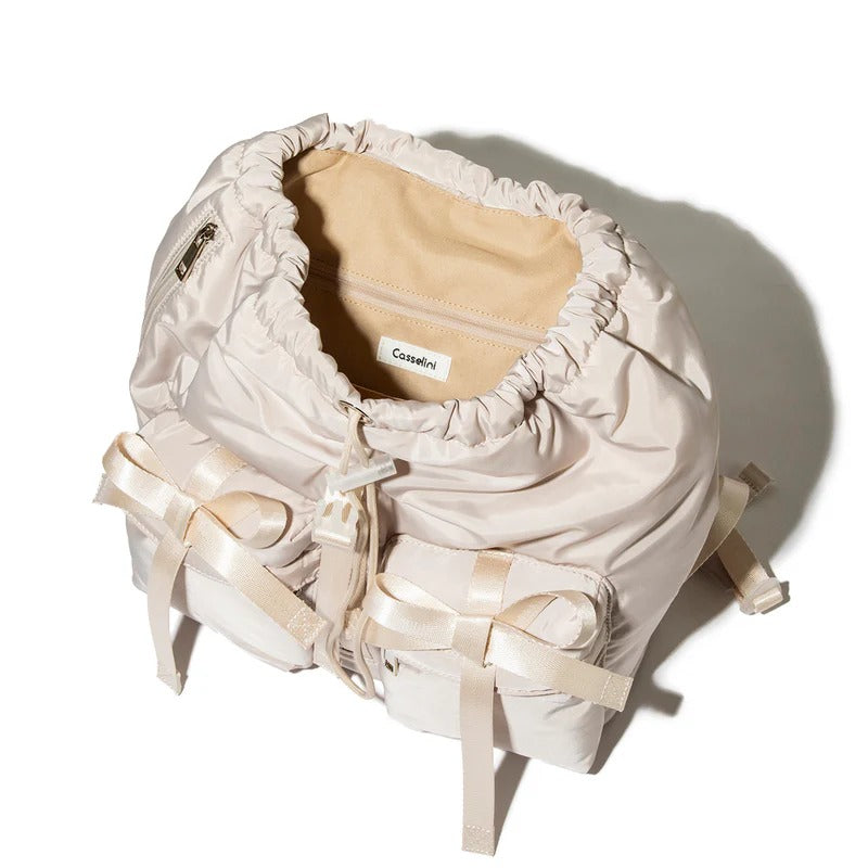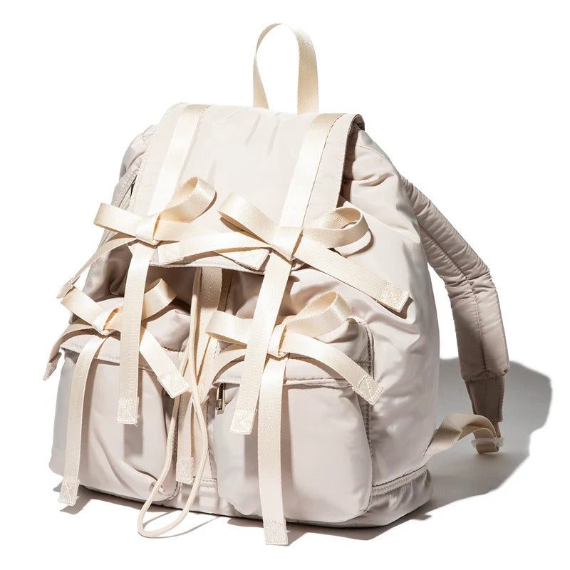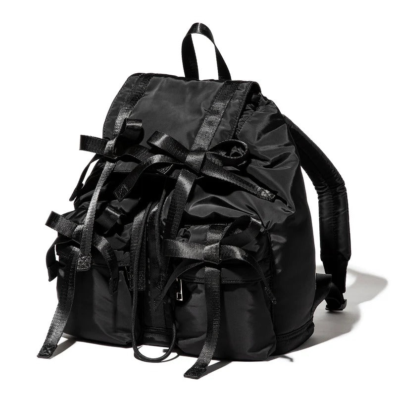 A backpack with multiple ribbons that are a trend.