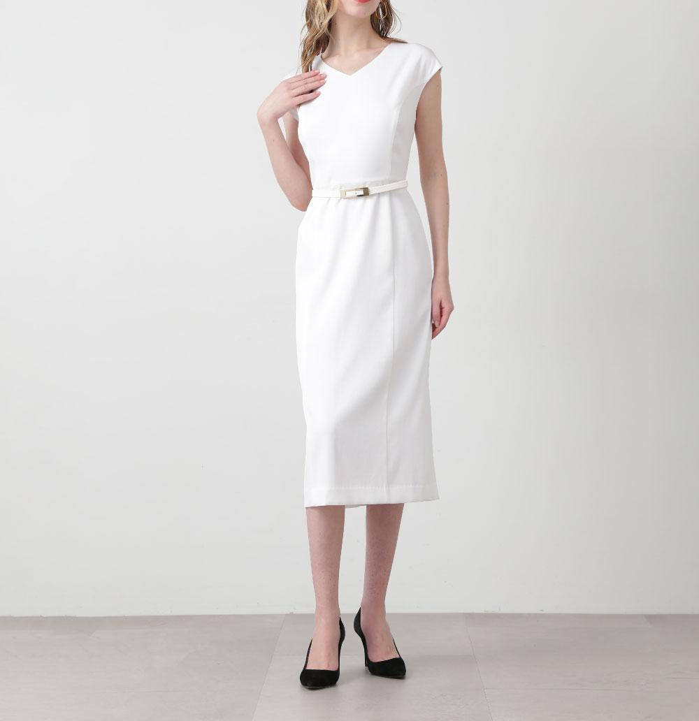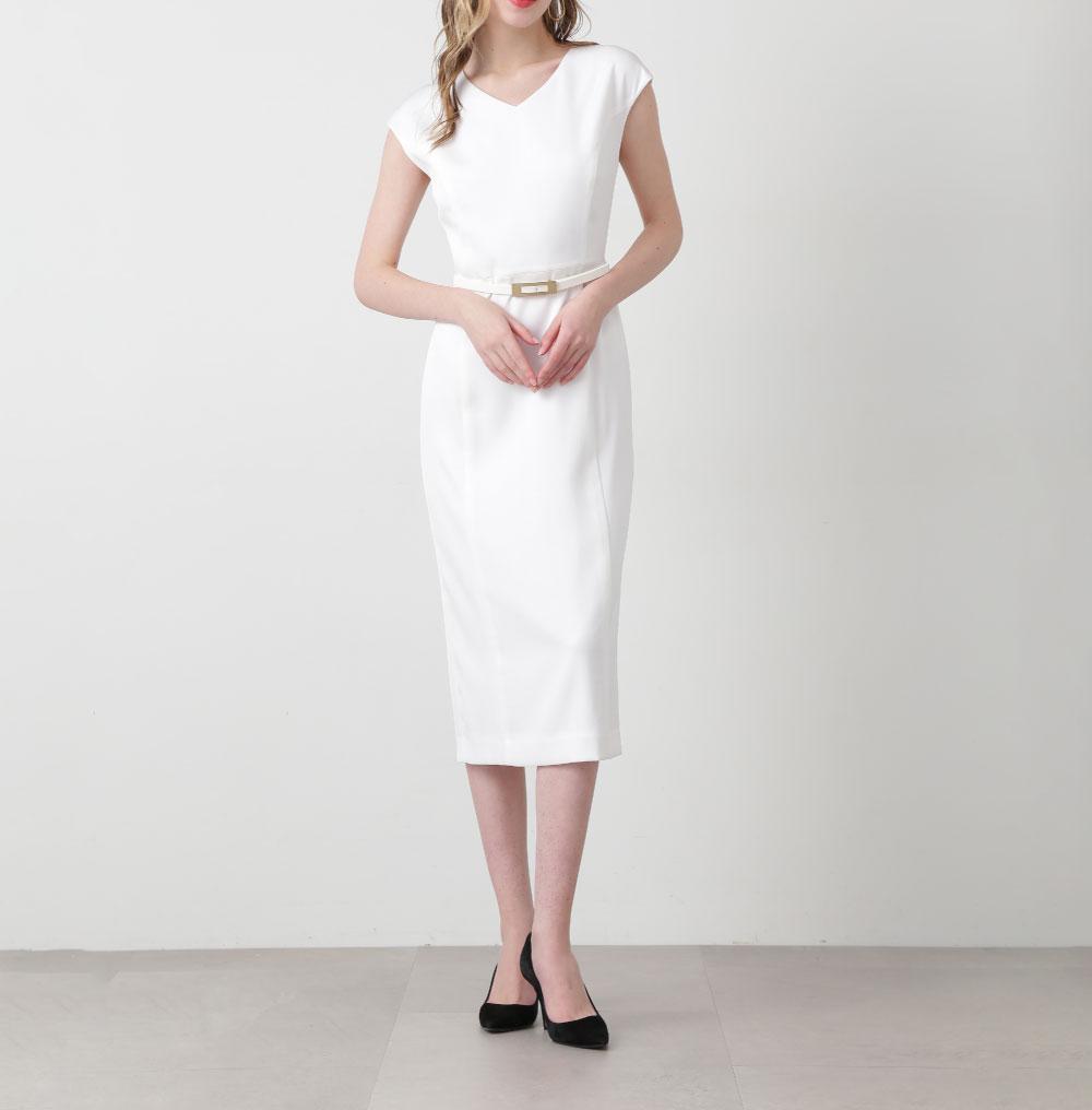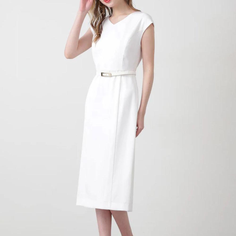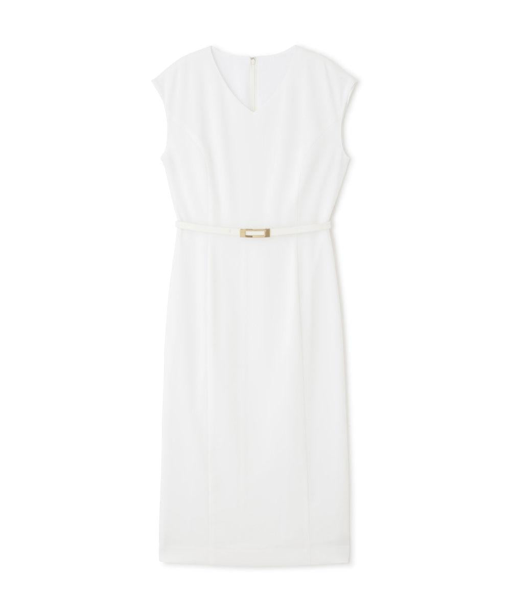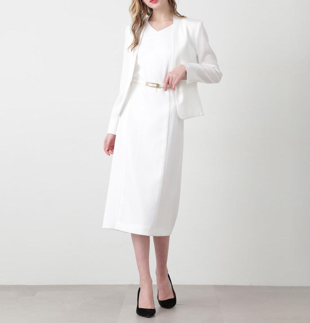 The moderately body-hugging silhouette makes the woman's body look beautiful, and it is a dress that is easy to use for both occasions and daily wear. It features a length that covers the shoulders and a cutting that makes the arms look slimmer. Paired with a jacket of the same fabric, it is a versatile knee-length dress suitable for suits, workwear, and stylish everyday scenes.
