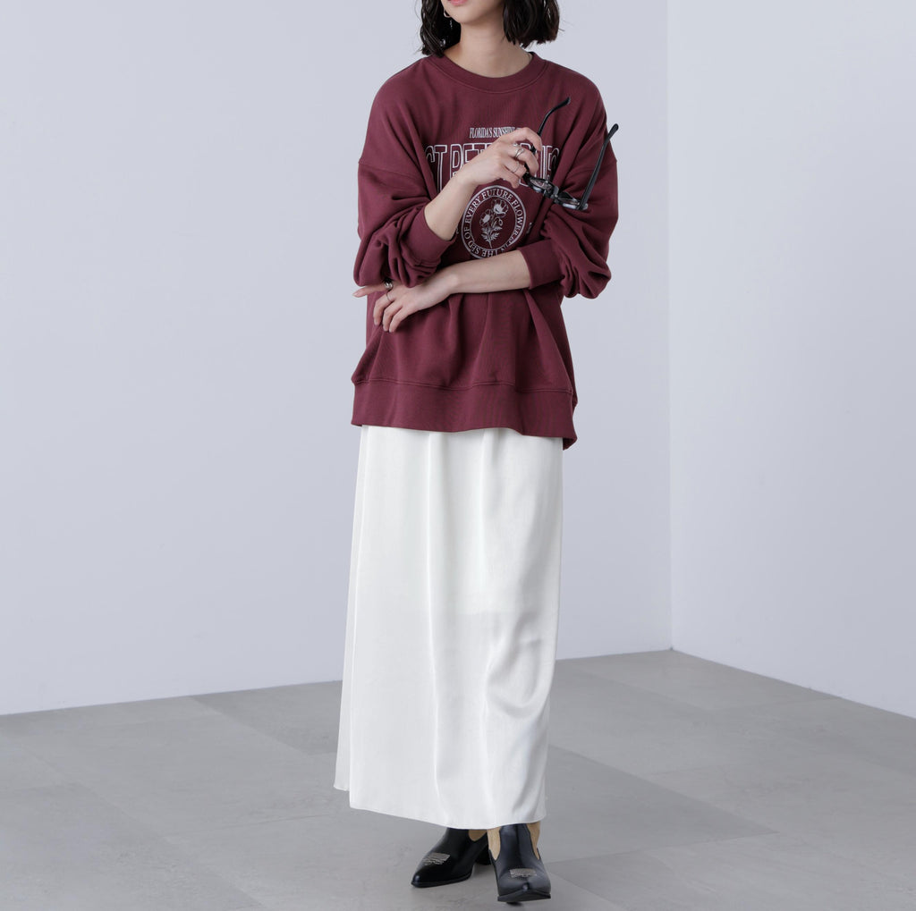 A long narrow skirt with a longer hem. Made from matte satin fabric with a subdued sheen and a moderate wash treatment. The waist features an elastic band for a stress-free fit. The hem is finished with a meringue stitch for a light, delicate detail. It can be styled with various tops for long seasons. In autumn and winter, pairing it with textured knitwear creates an airy look that balances out the heavier seasonal outfits.