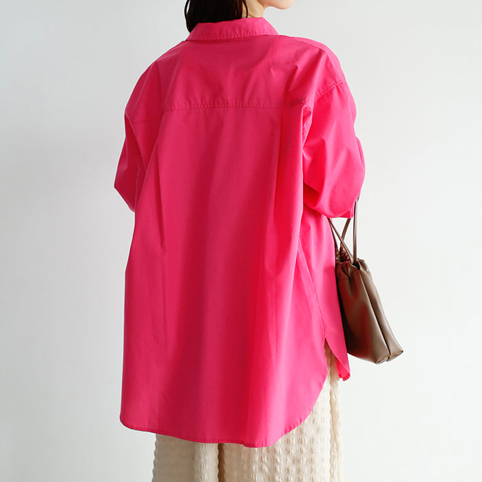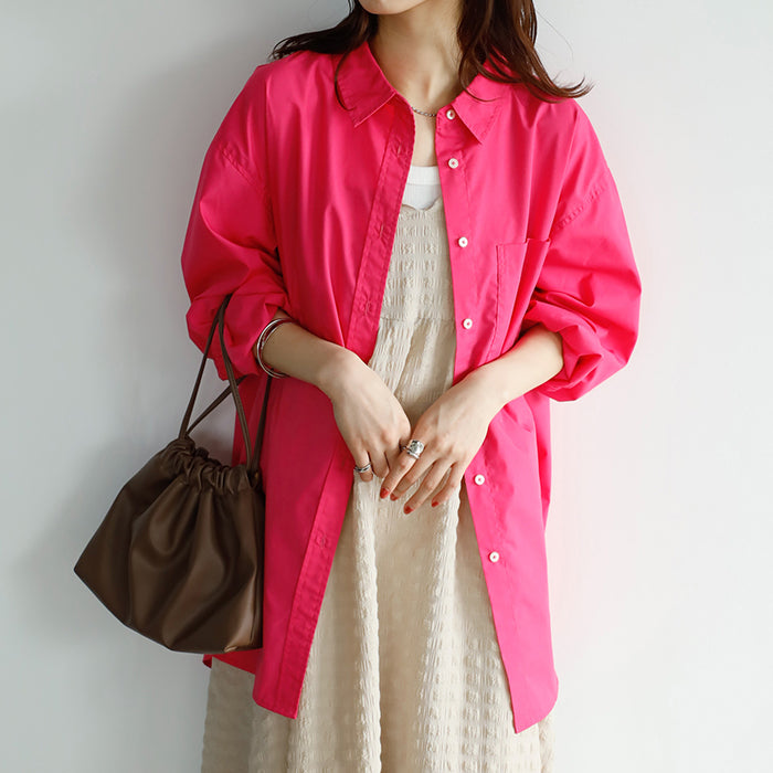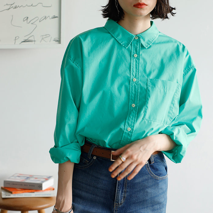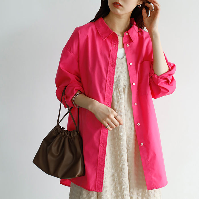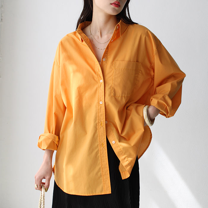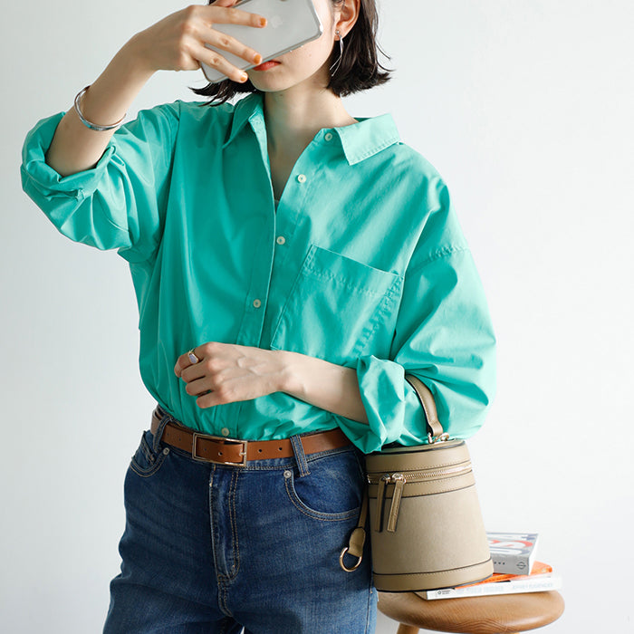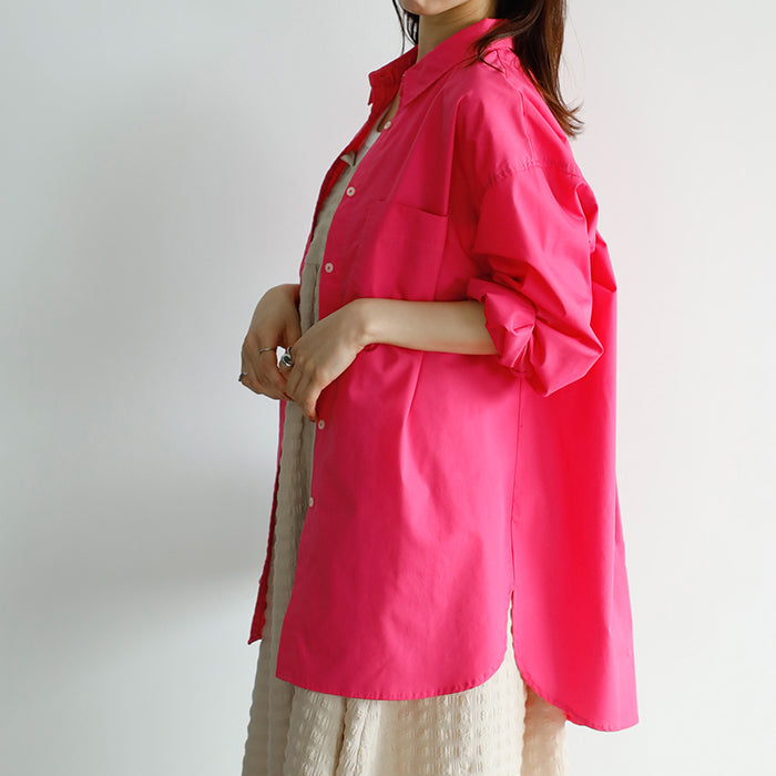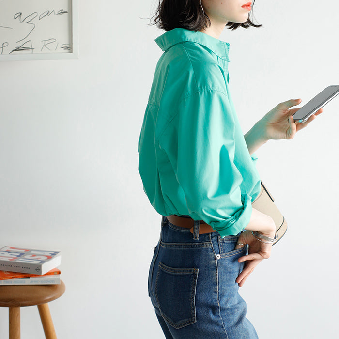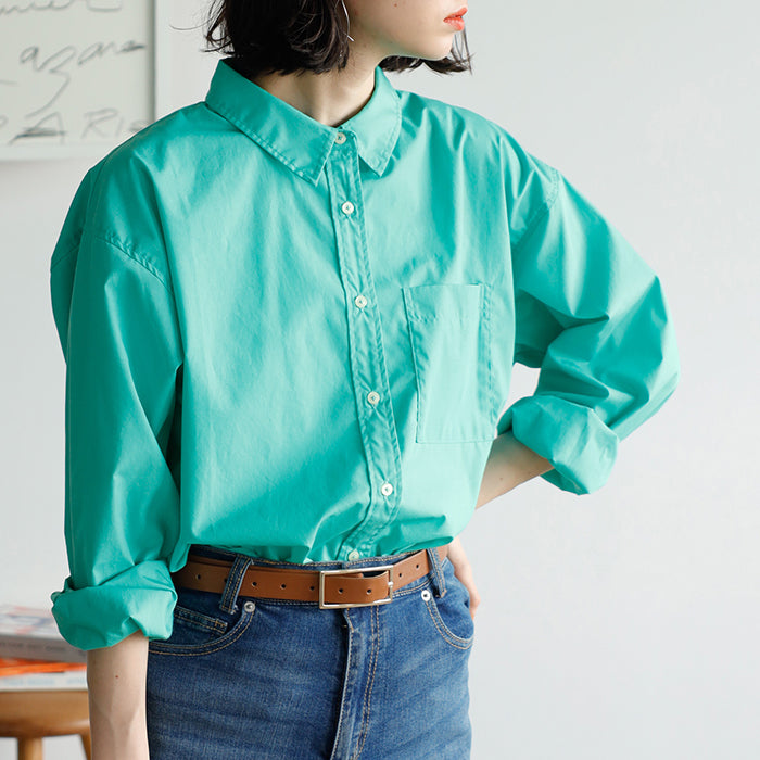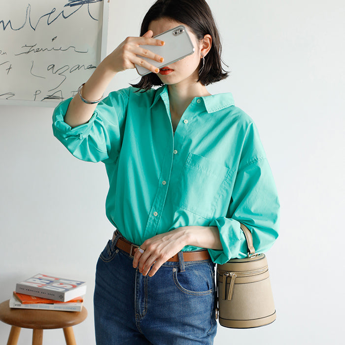 A color shirt with a moderately loose silhouette that is versatile and easy to style.