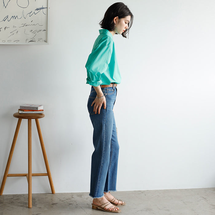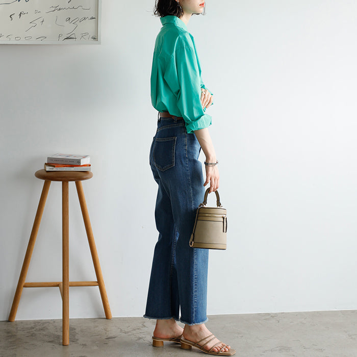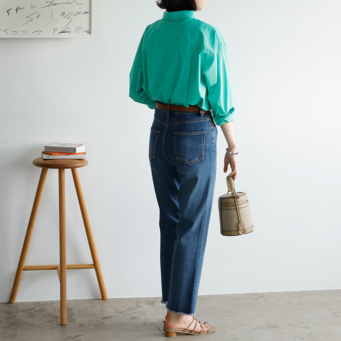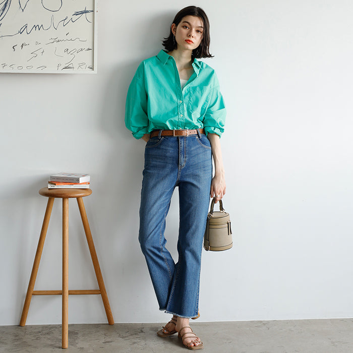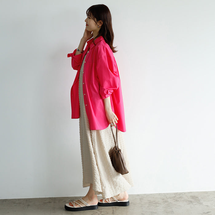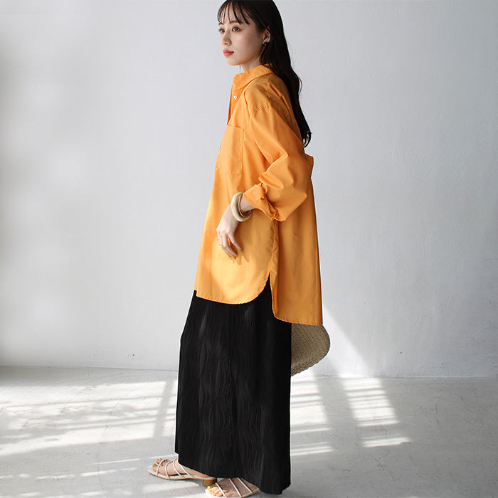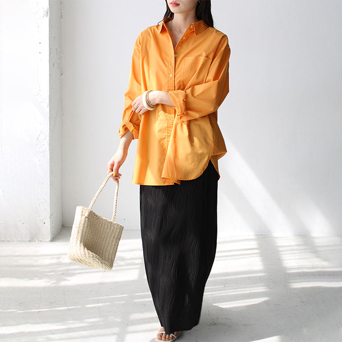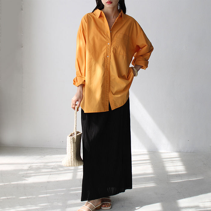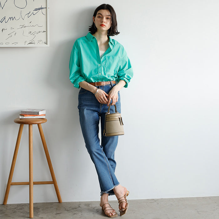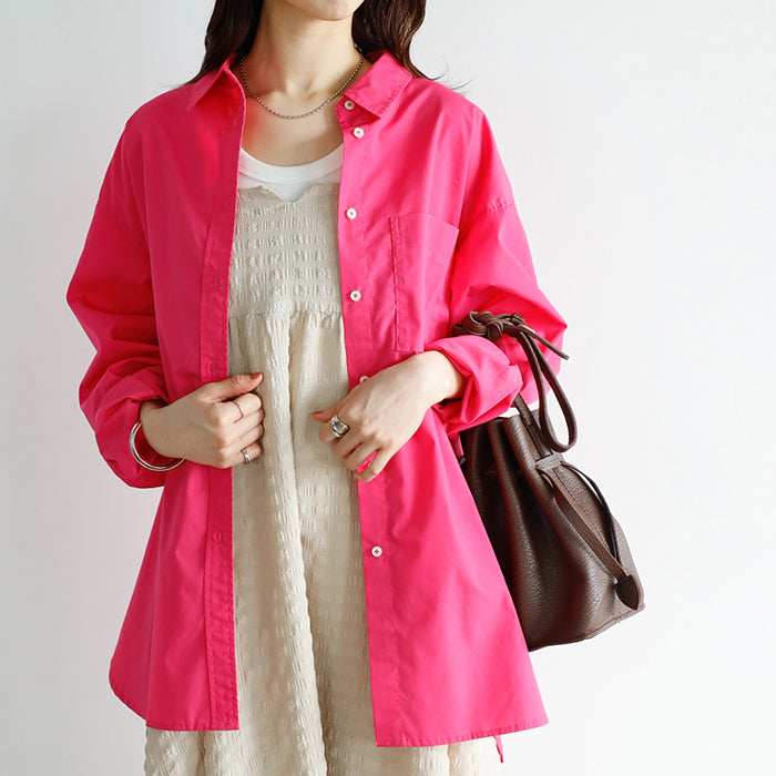 A color shirt with a moderately loose silhouette that is versatile and easy to style.