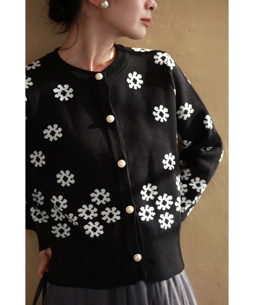The elegant look is achieved with a flower motif and pearl buttons in a slimming color, making it easy to match with simple bottoms.