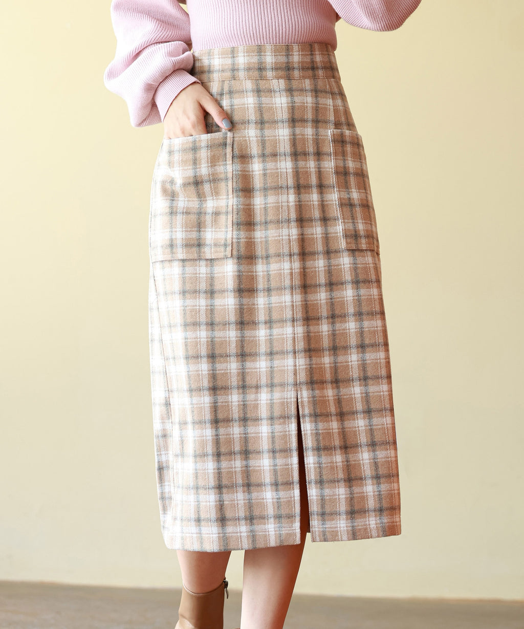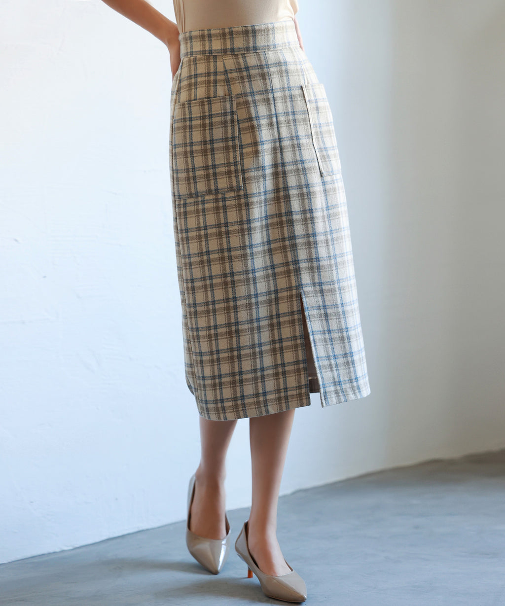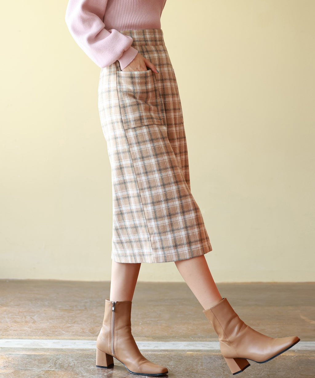 すっきりと縦長が協調されるミモレ丈のチェック柄ナロースカート。