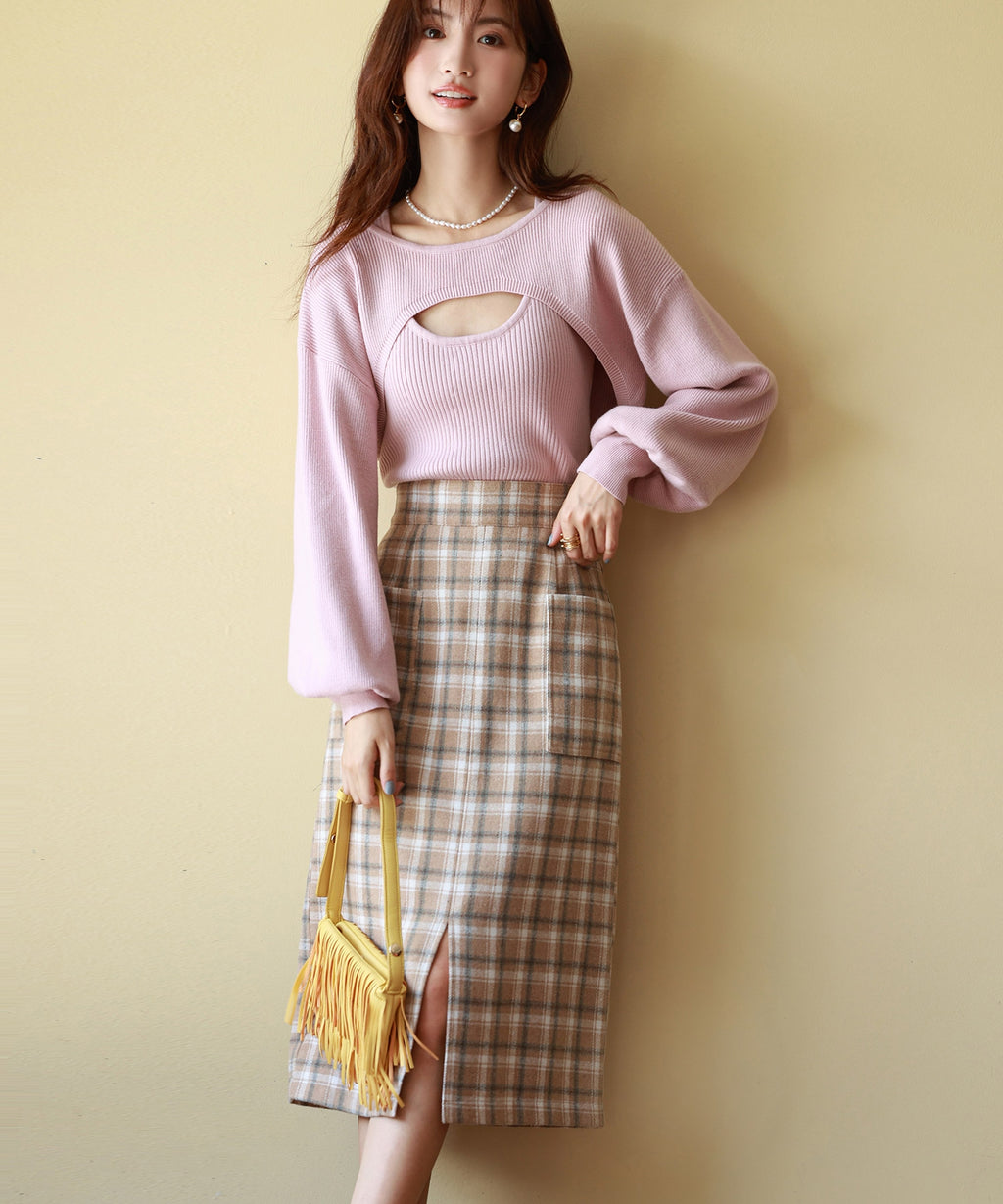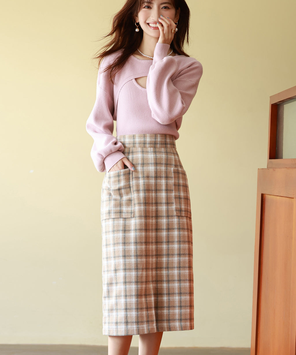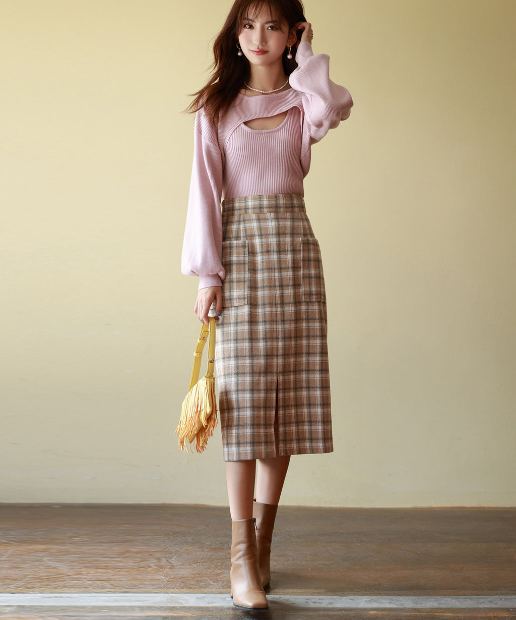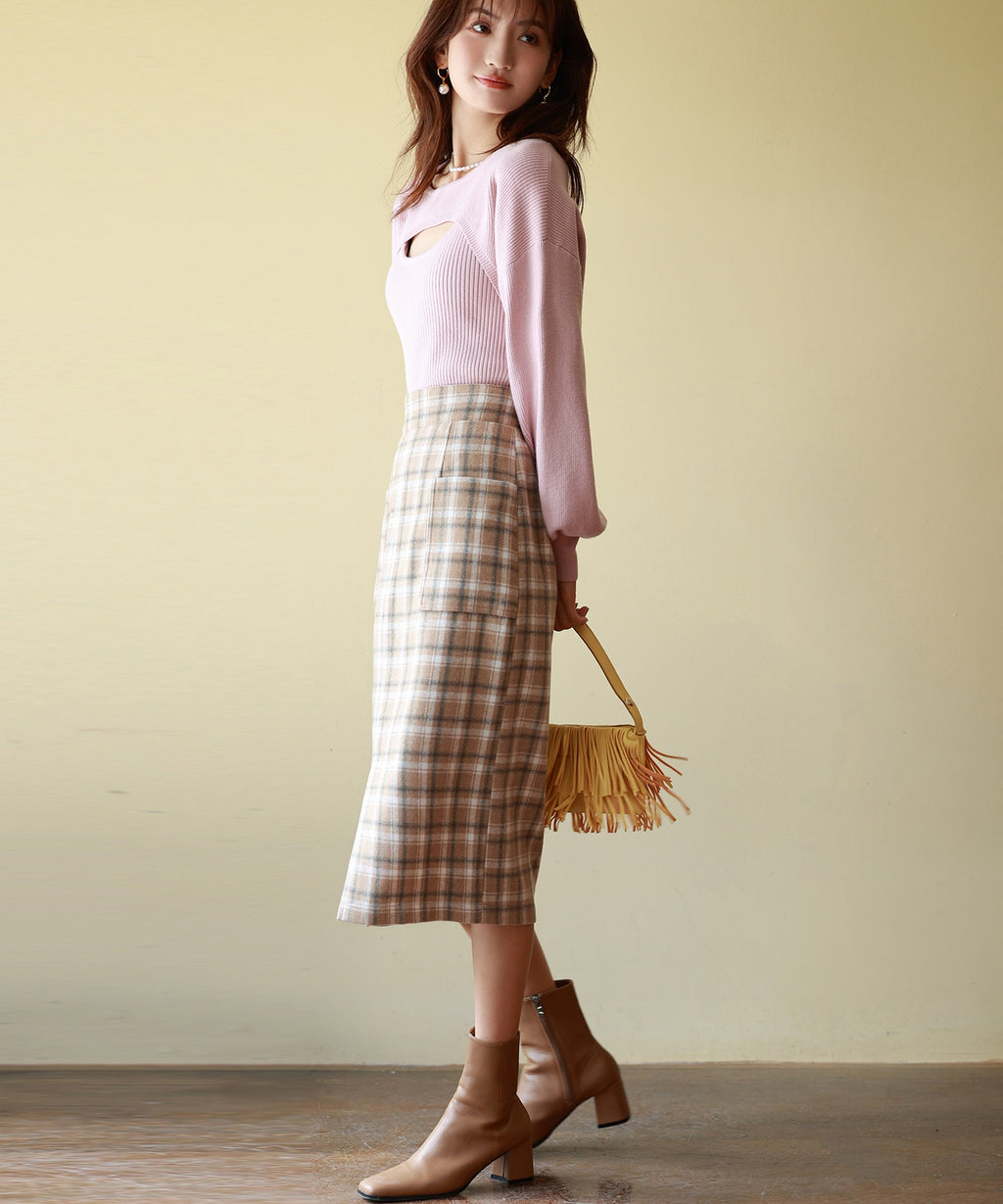 すっきりと縦長が協調されるミモレ丈のチェック柄ナロースカート。