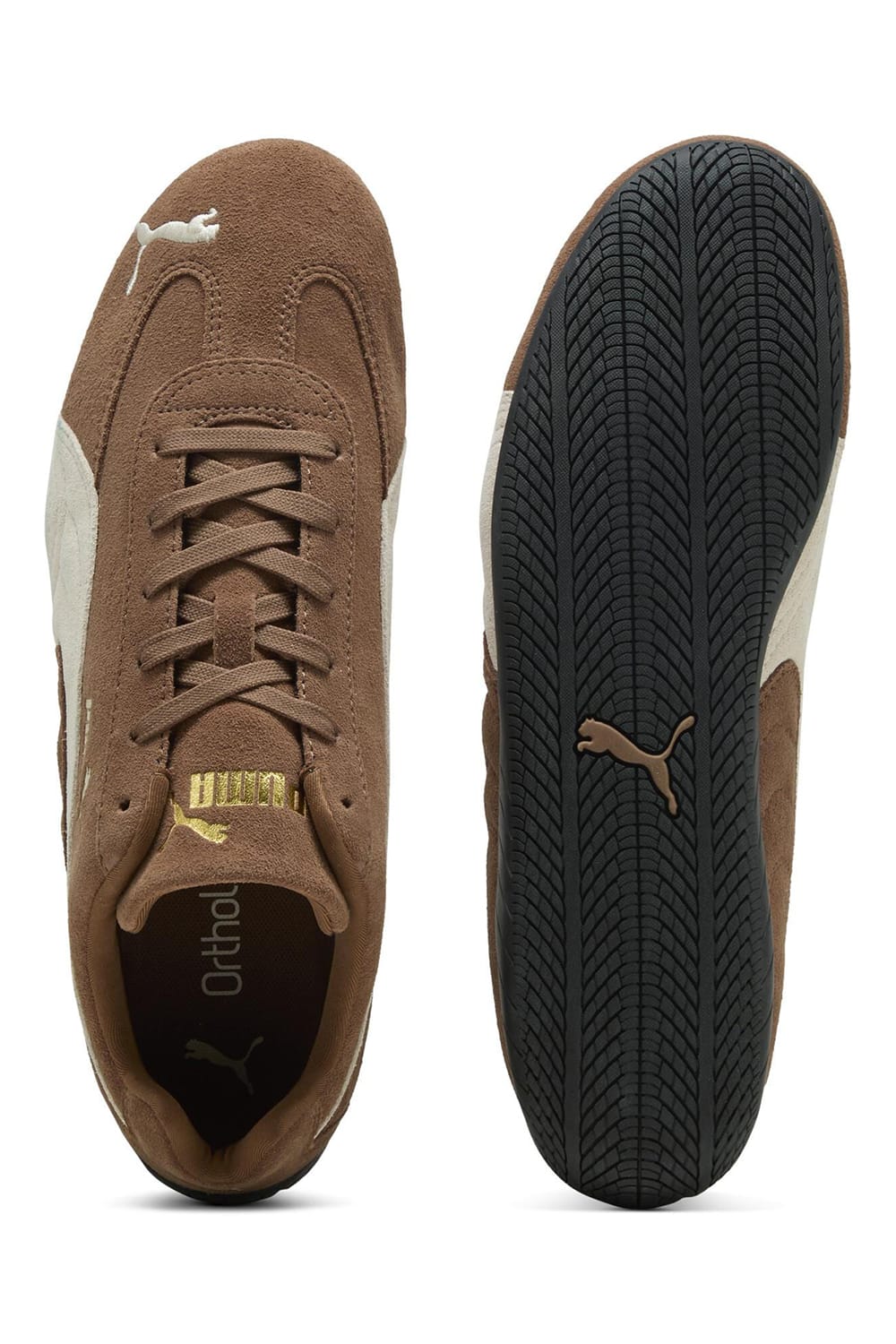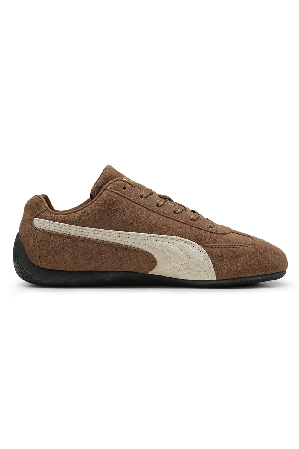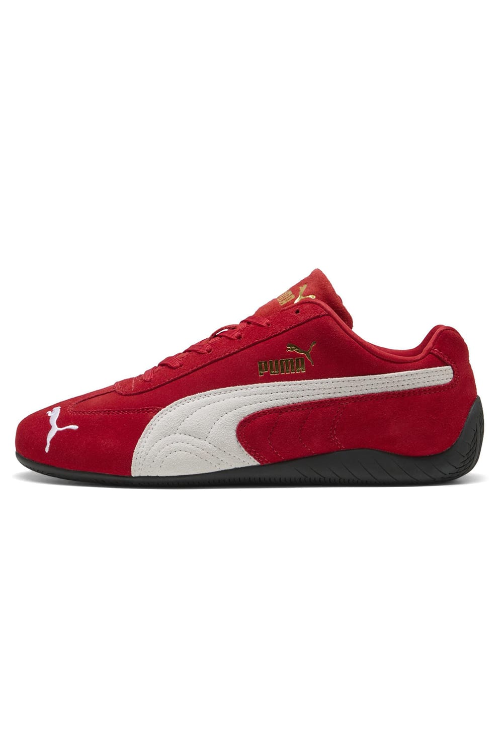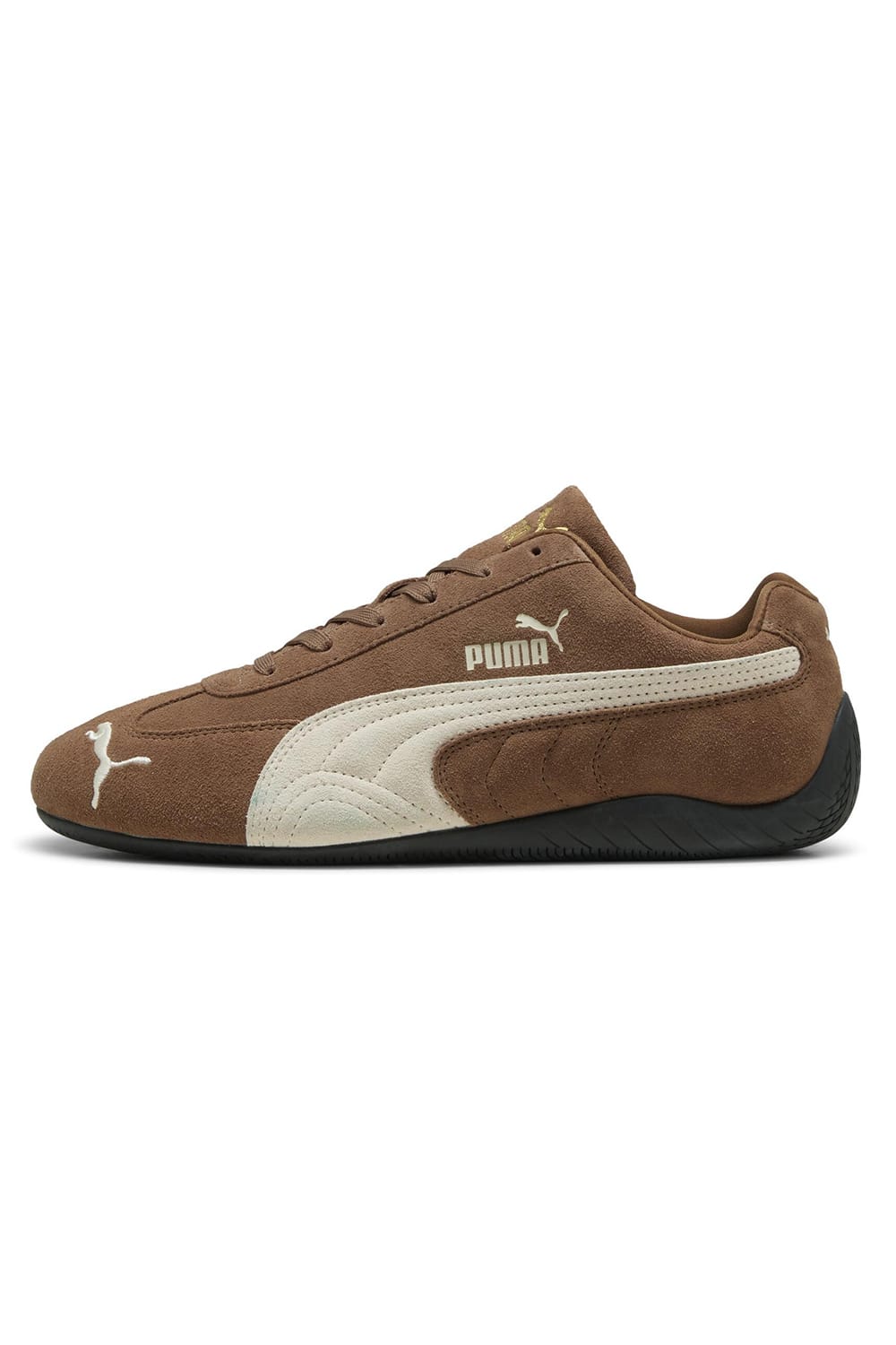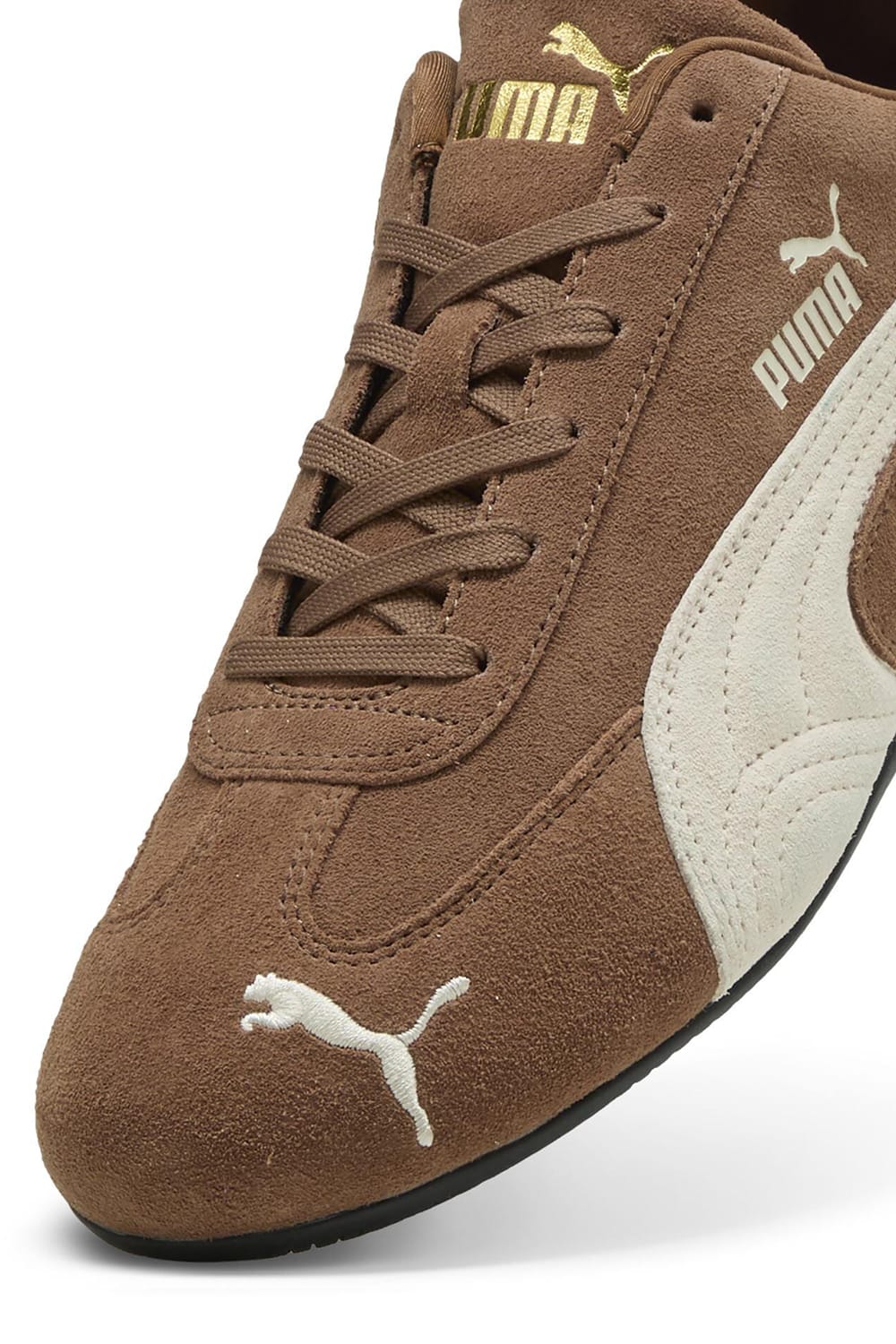 The toe features an embroidered "Puma Cat," and a gold logo is designed on the shoe tongue and foam strip.