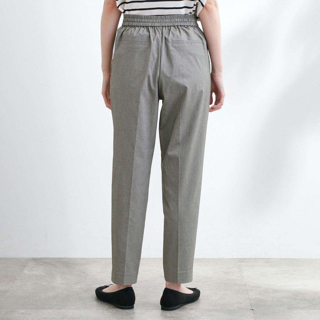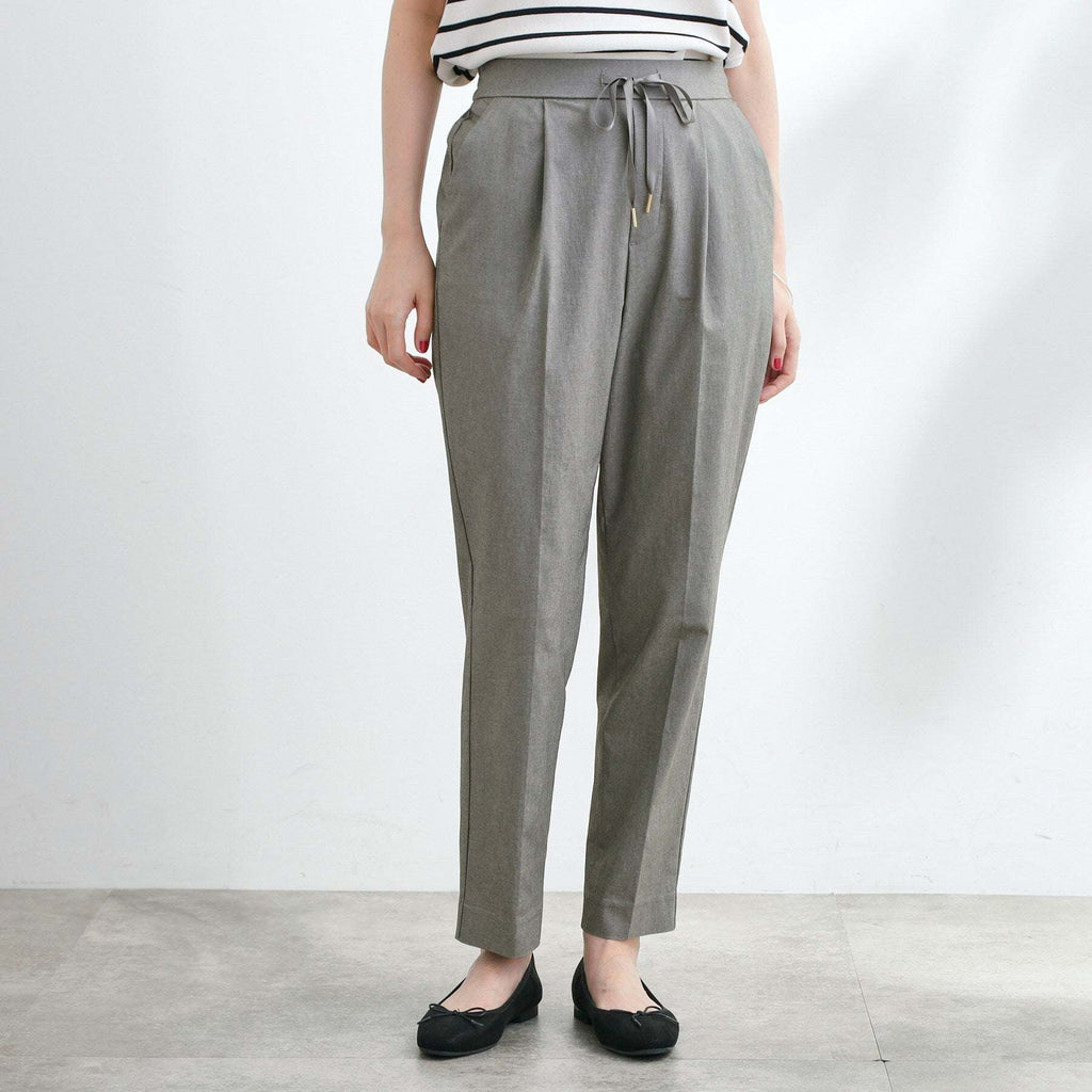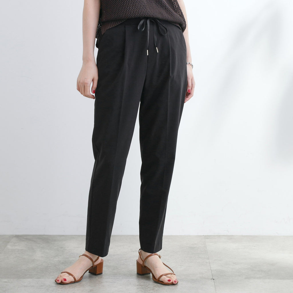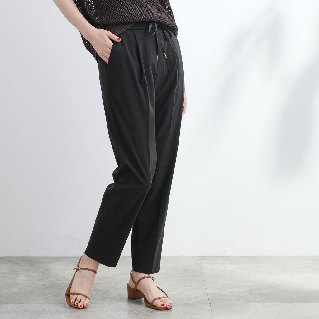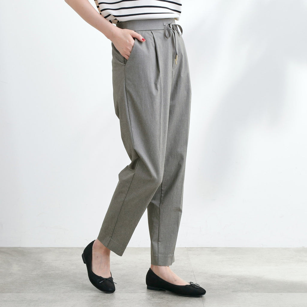The tapered silhouette narrows towards the hem, and the design with center pleats makes the legs appear straight.