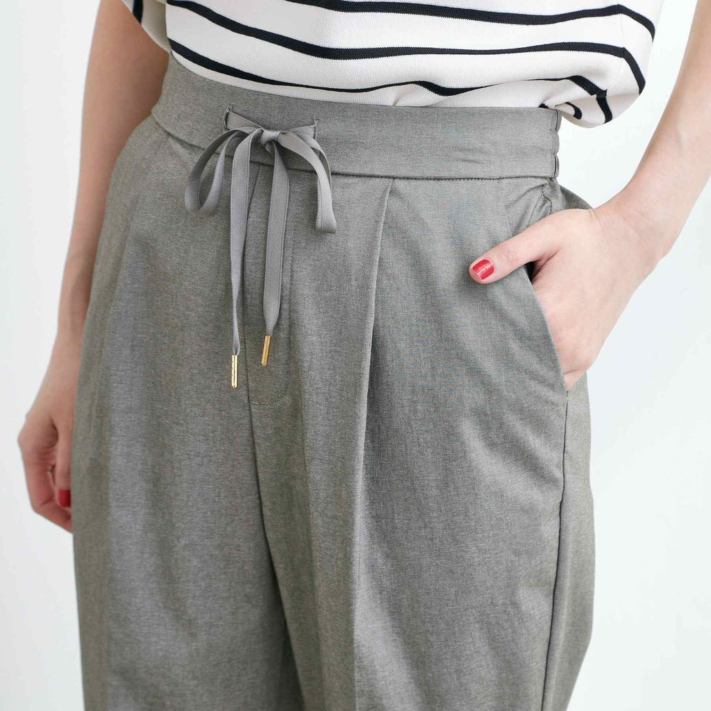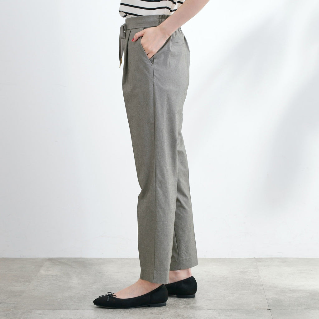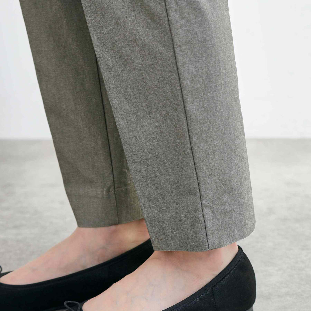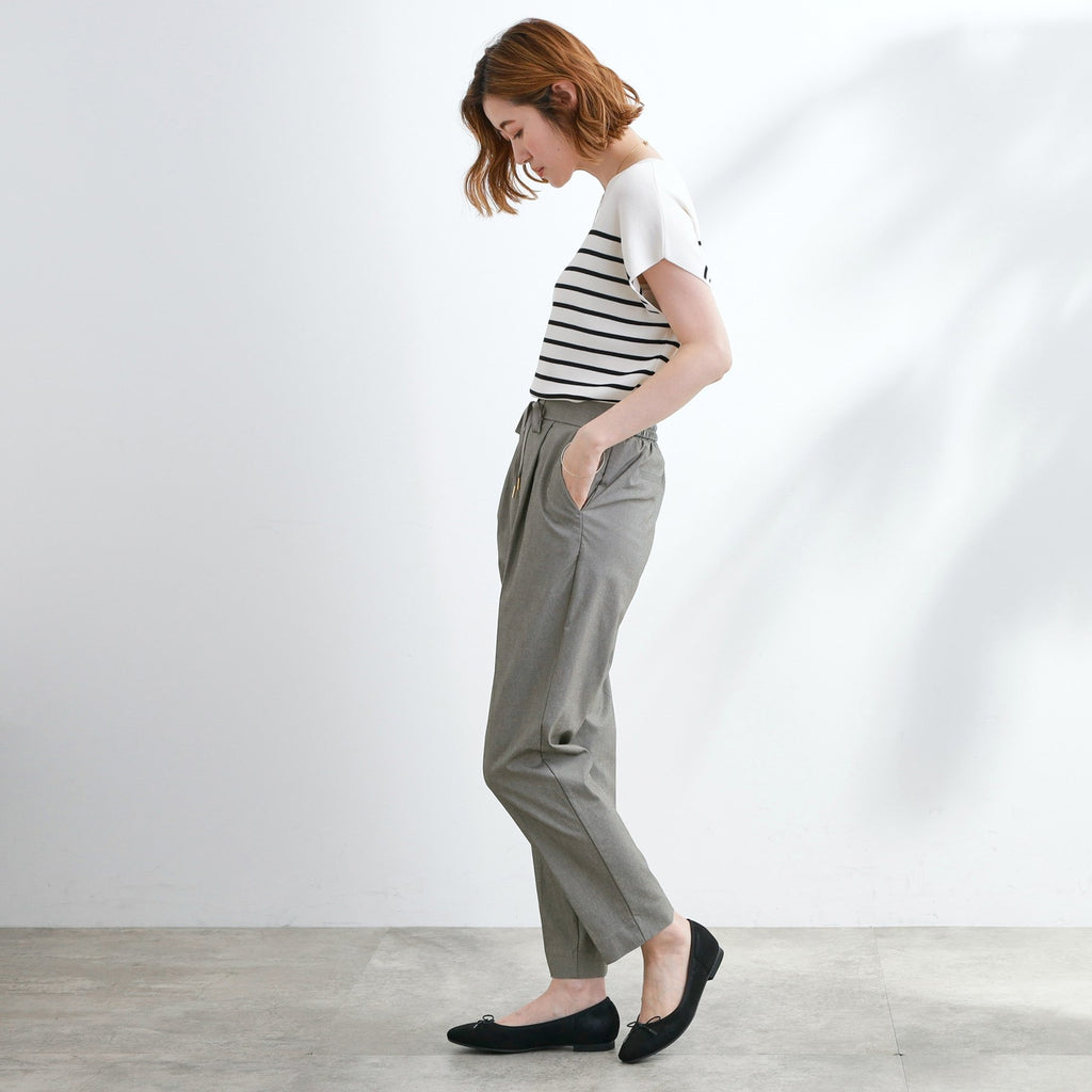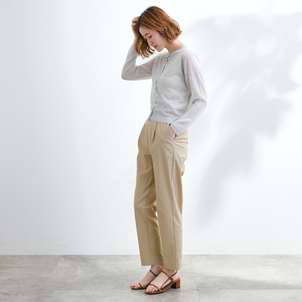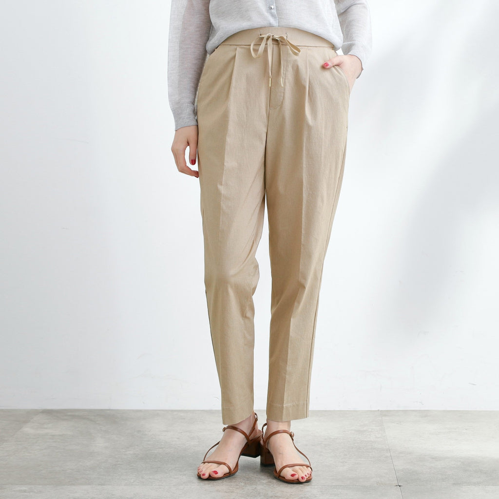 The tapered silhouette narrows towards the hem, and the design with center pleats makes the legs appear straight.
