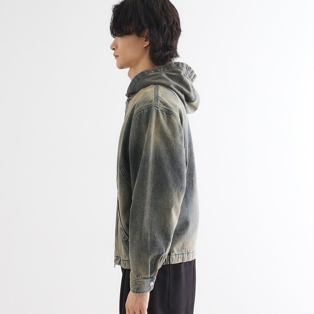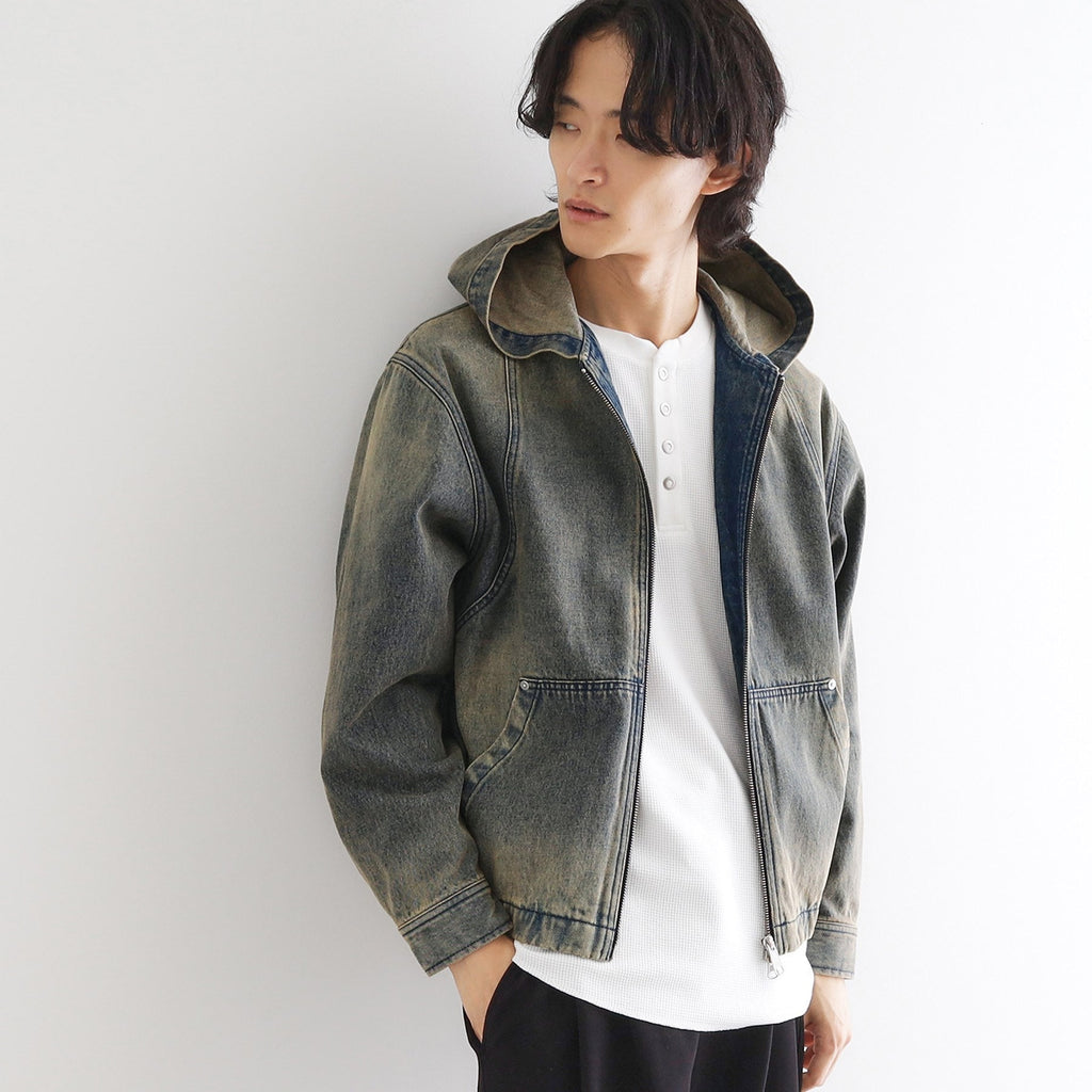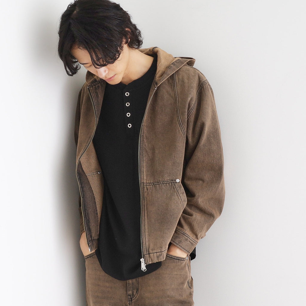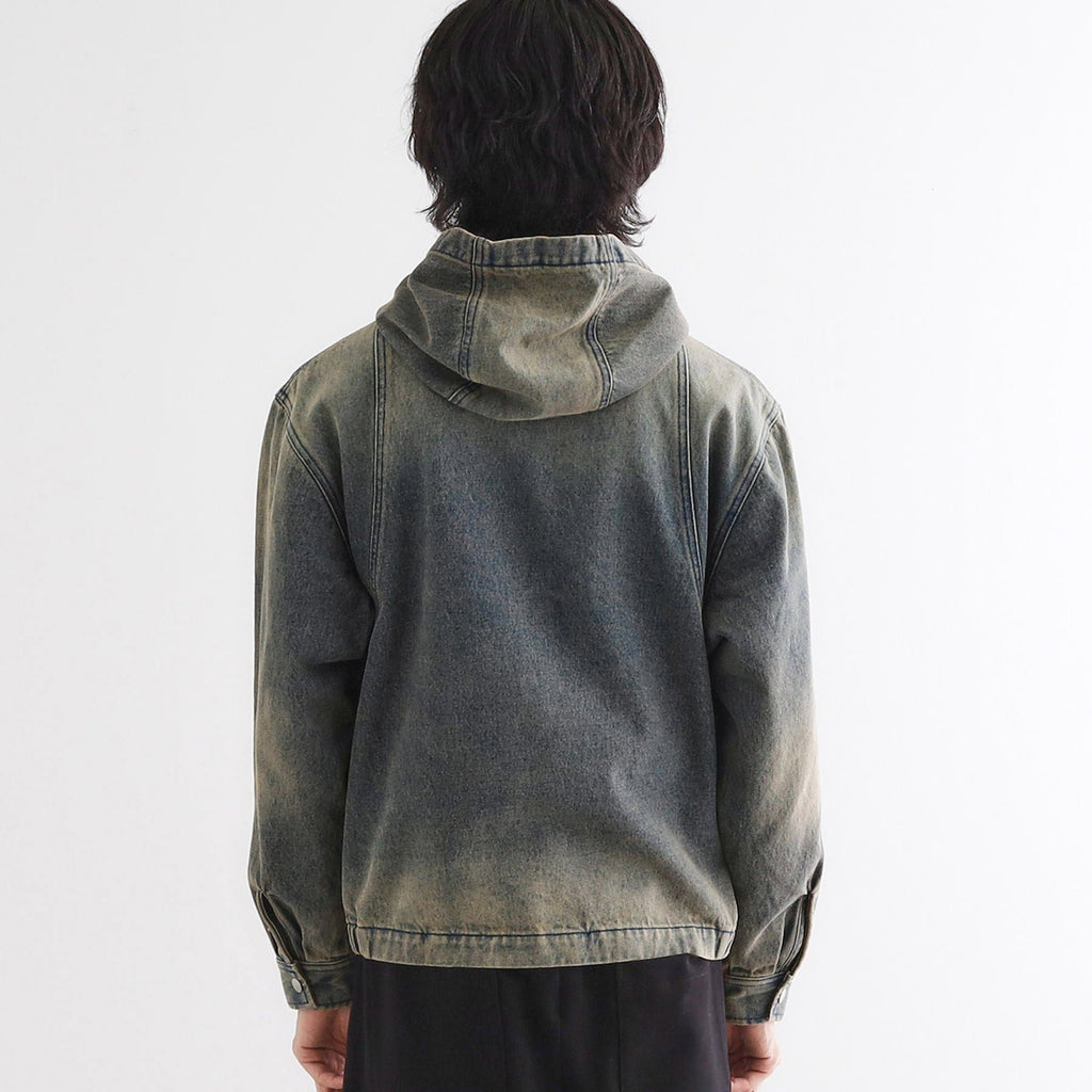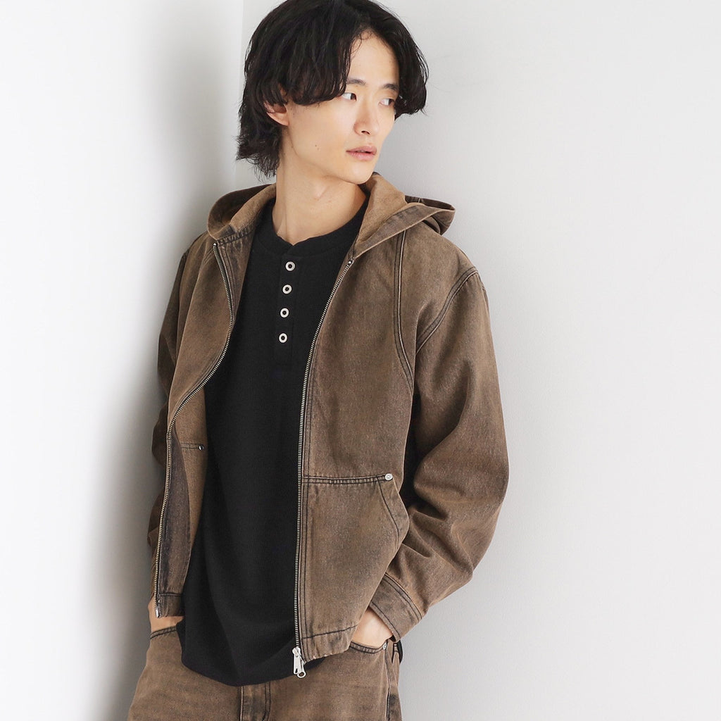 A zip hood shirt outerwear with a vintage-like processed finish.