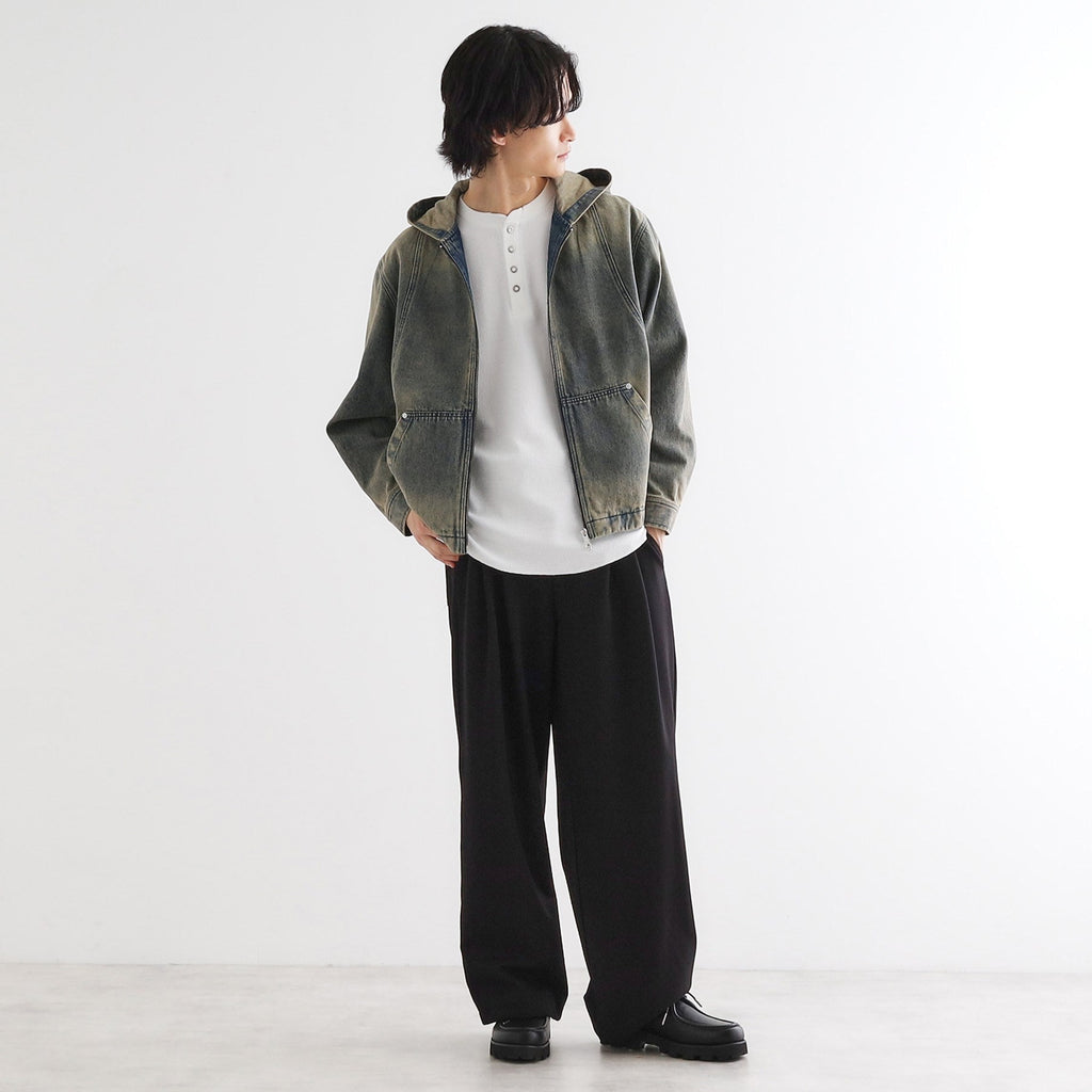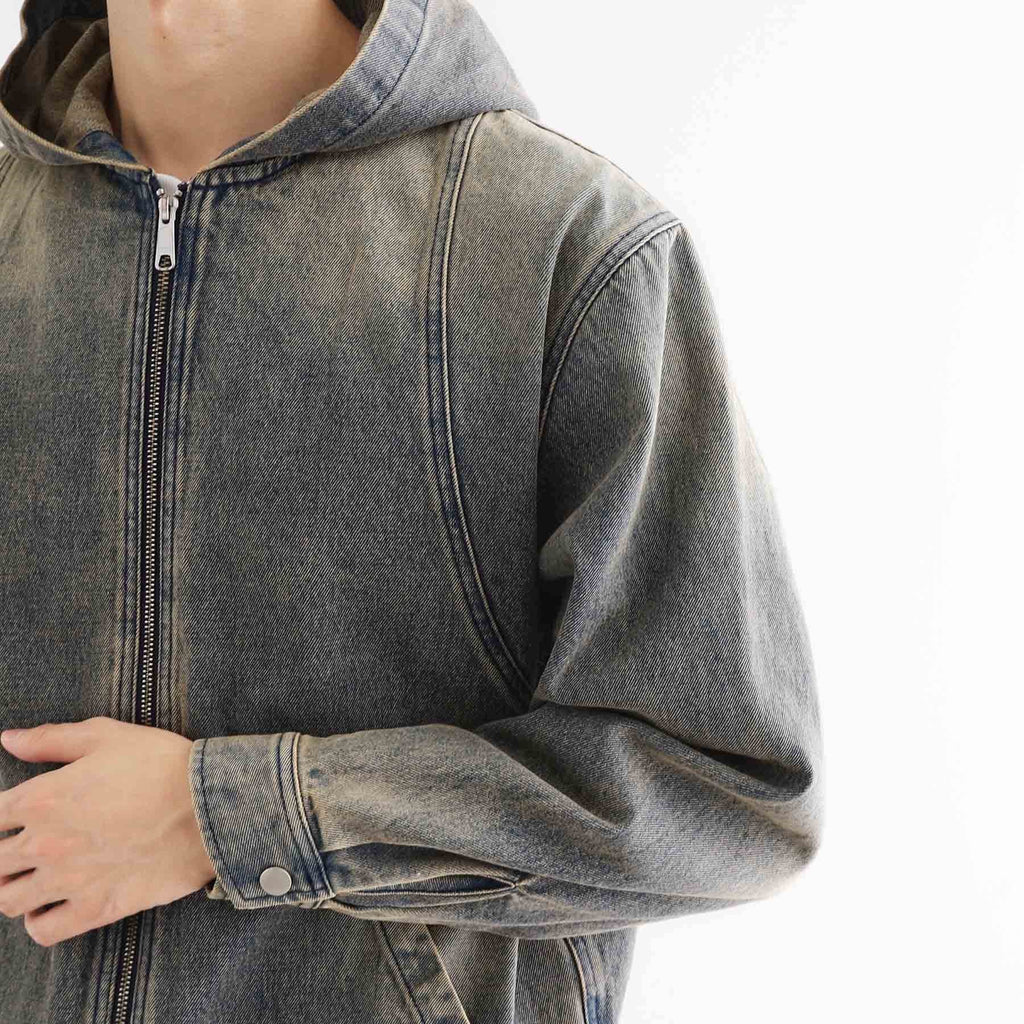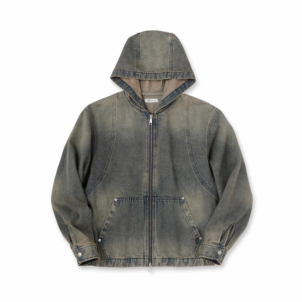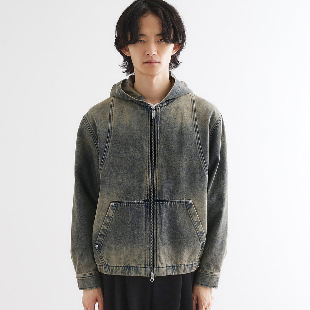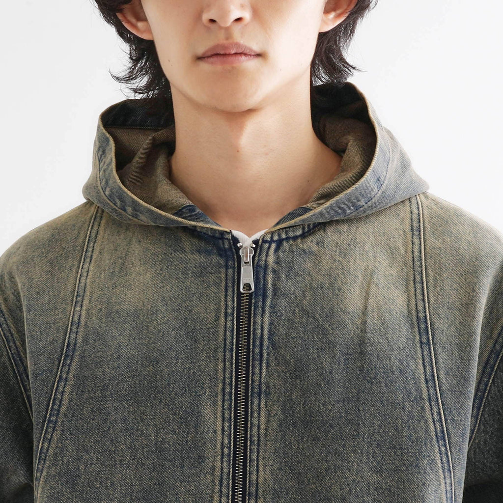 A zip hood shirt outerwear with a vintage-like processed finish.