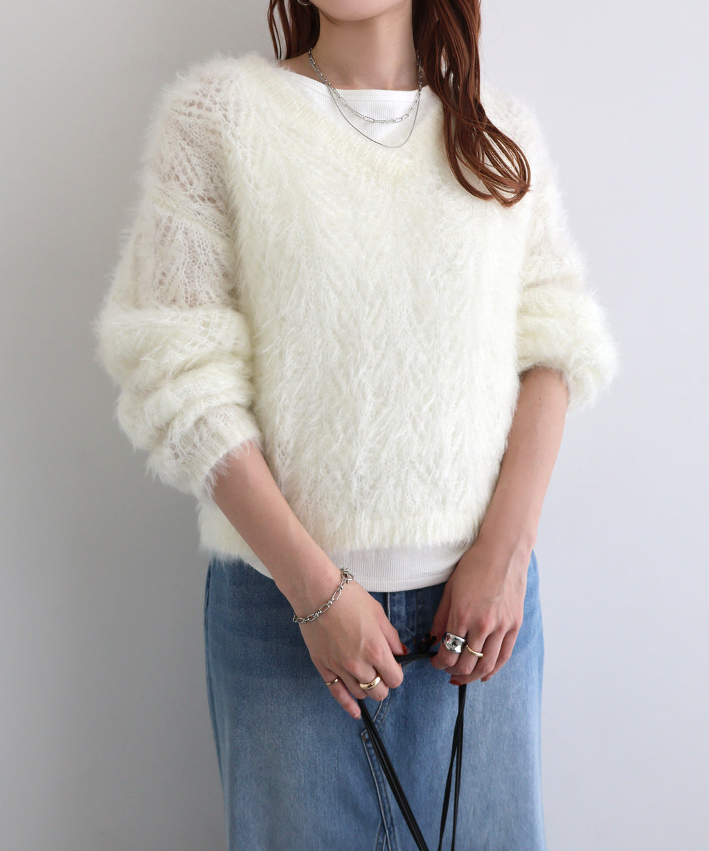 A new V-neck knit pullover featuring fluffy pile and attractive lace knitting has arrived!