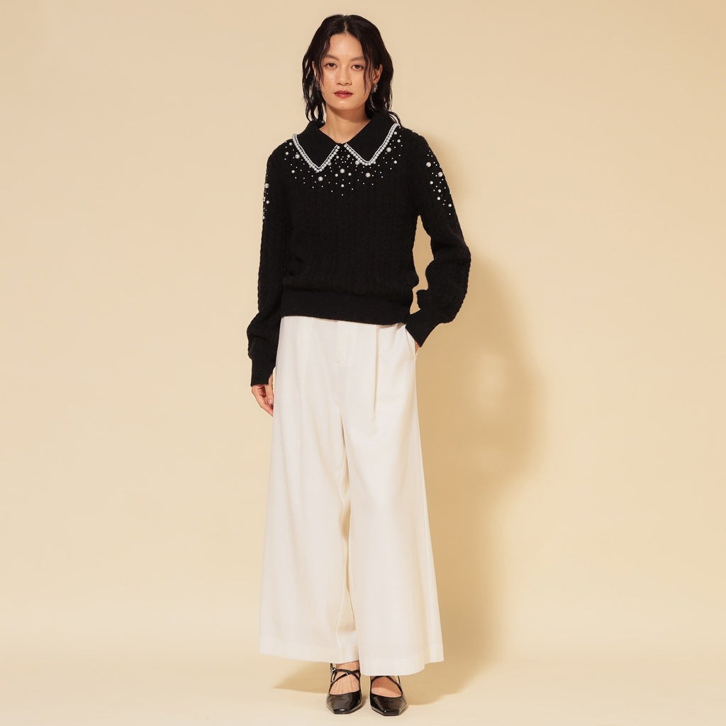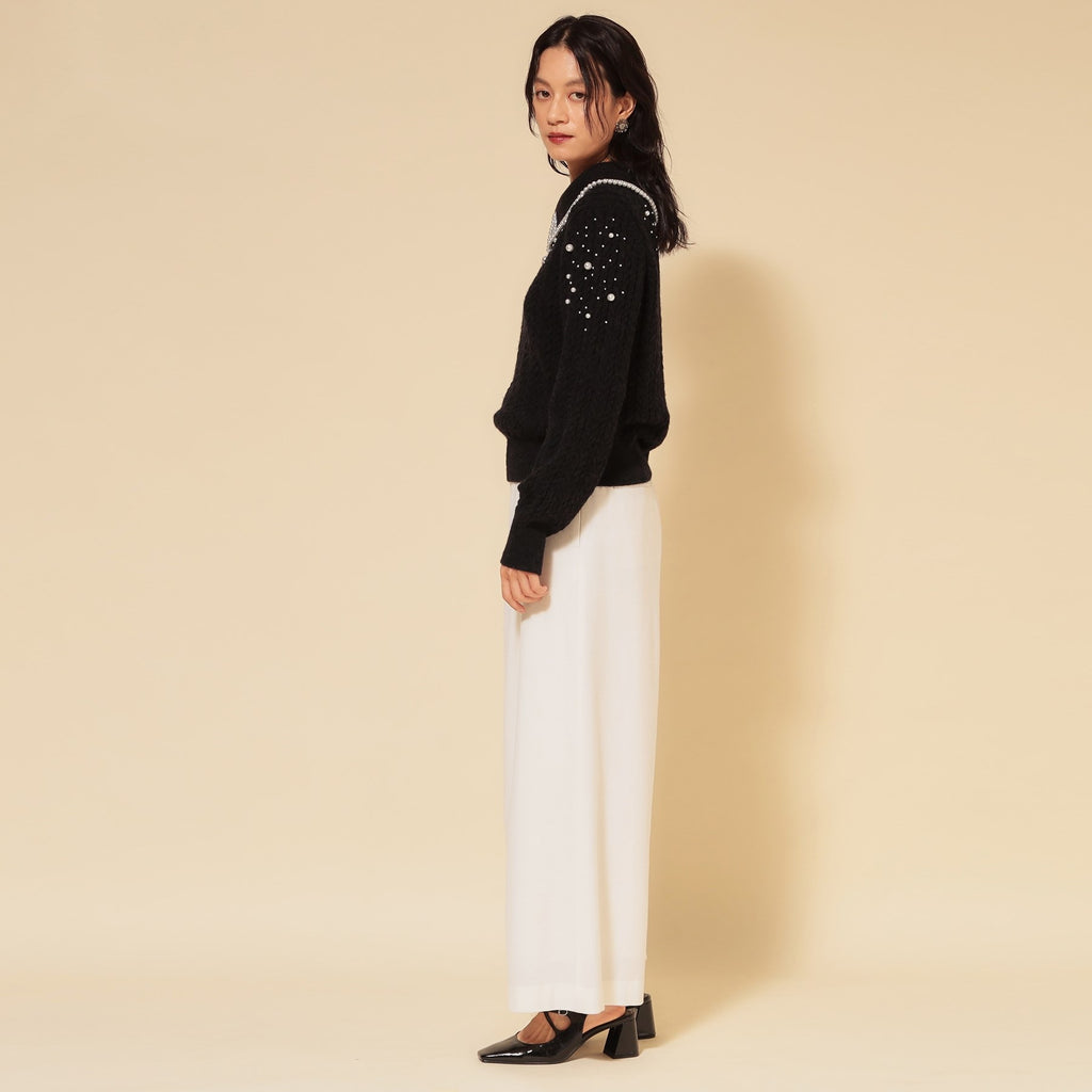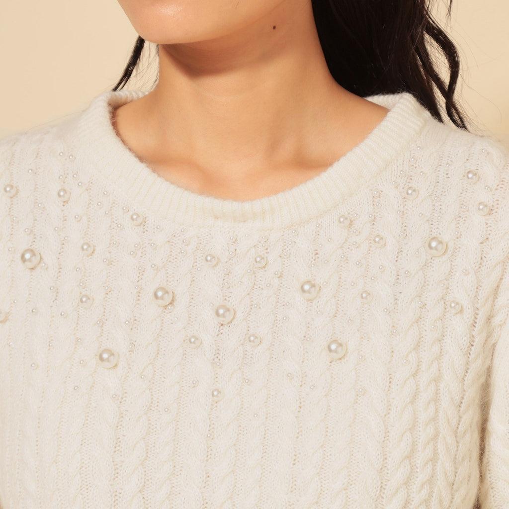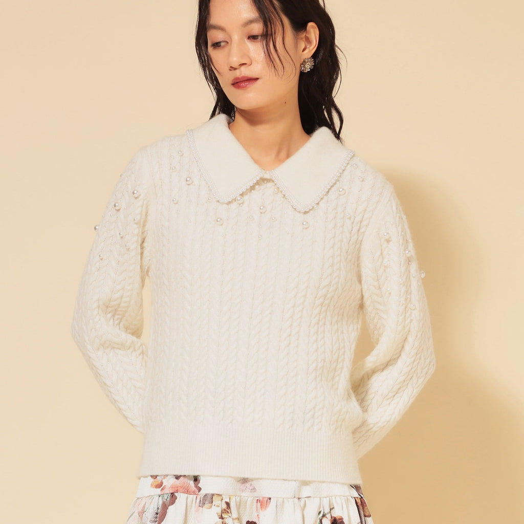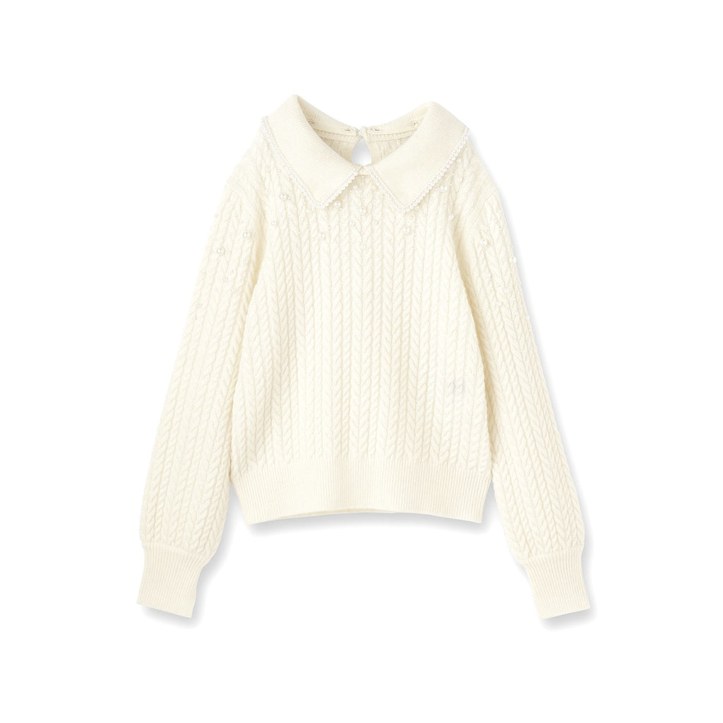 The authentic all-over cable pattern and the fake pearls applied to the collar create a feminine playfulness.