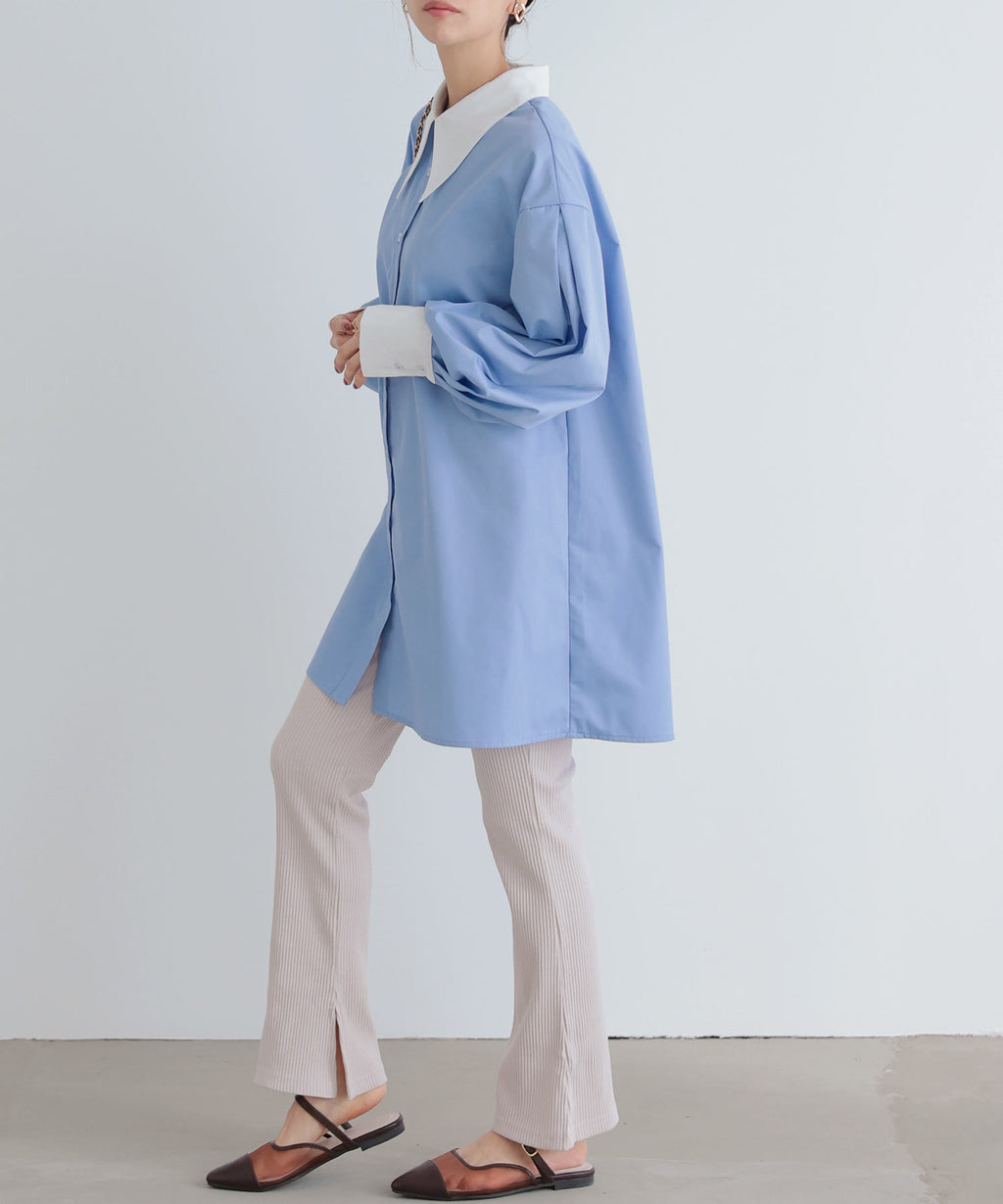 The flare silhouette that widens towards the hem can also be expected to create a leg-lengthening effect, and the side slit adds a relaxed touch to the styling.