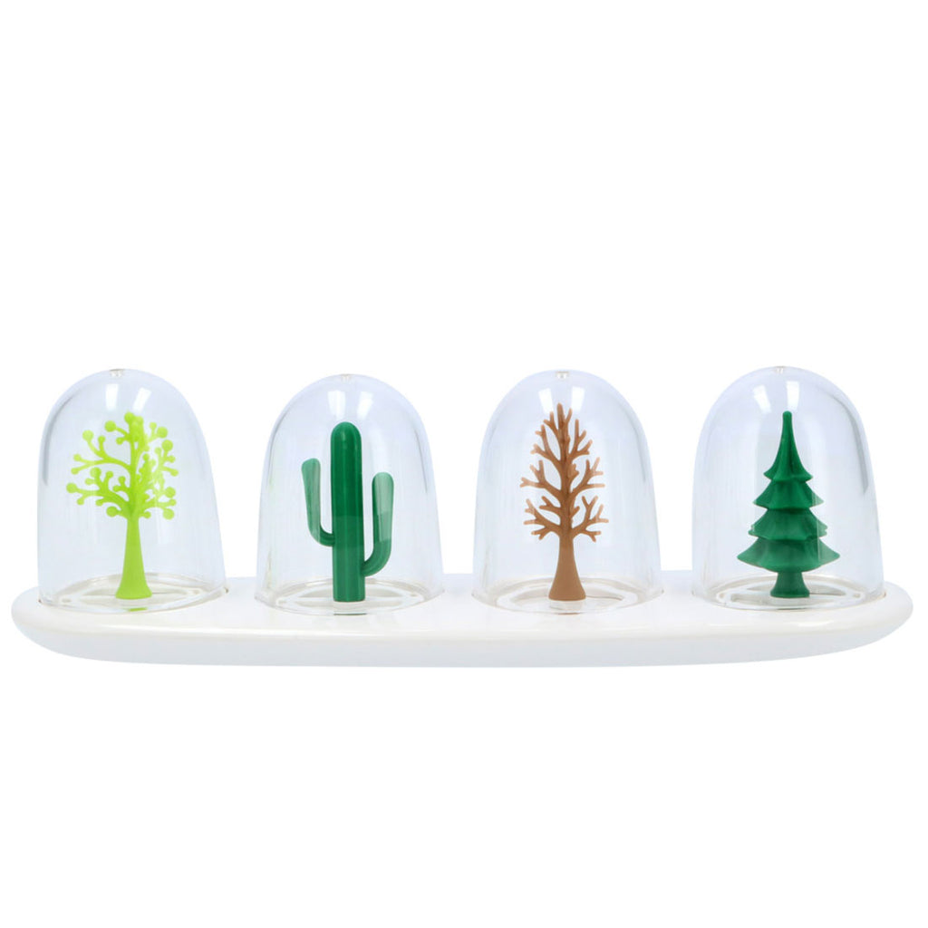 A stylish spice container with objects shaped like trees and animals inside a clear dome.