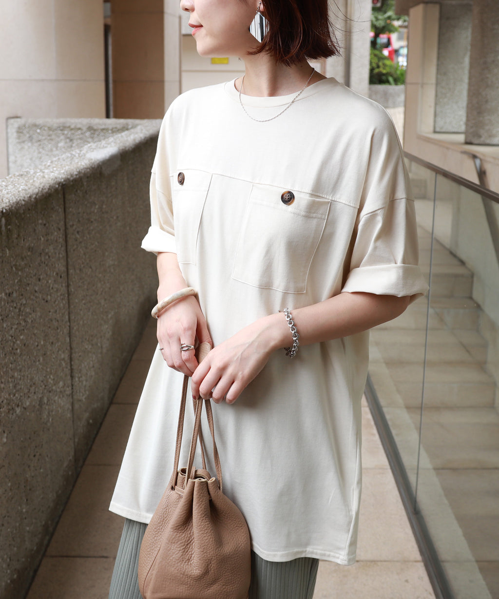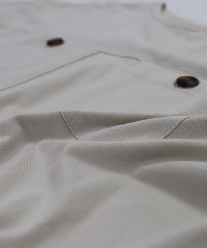 This piece features chest pockets on both sides adorned with marble buttons, giving it a trendy feel for this year. The sleeves are generously wide.