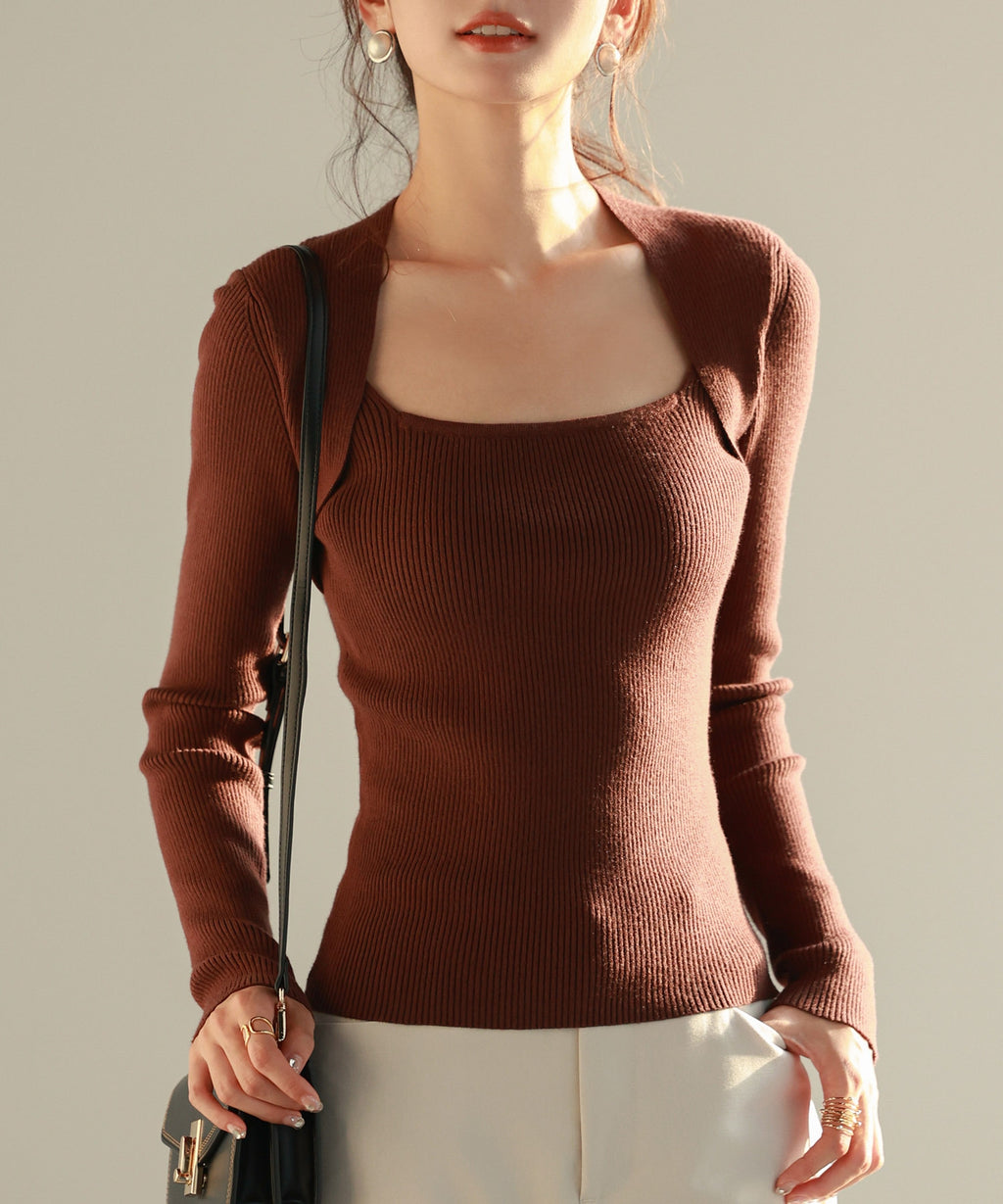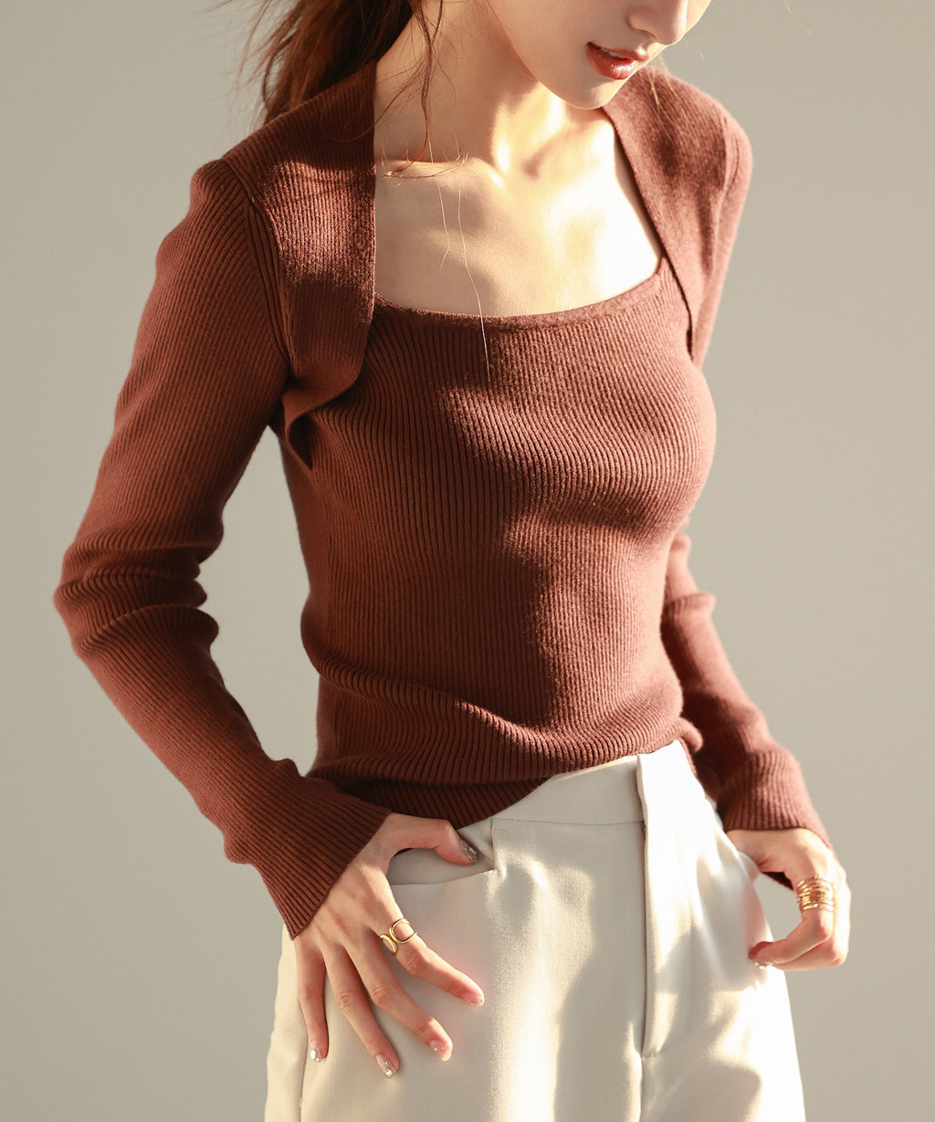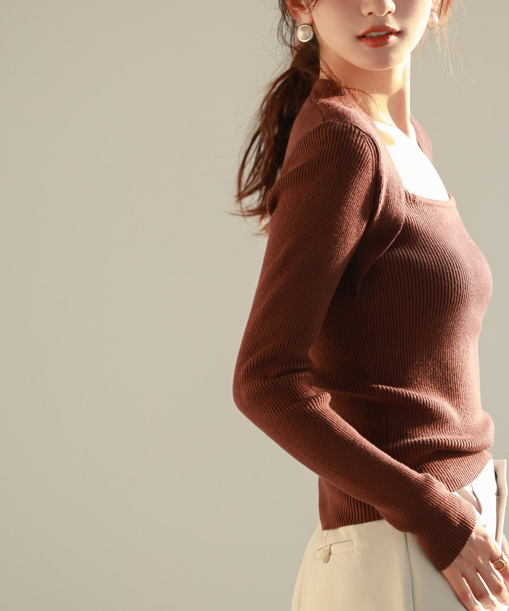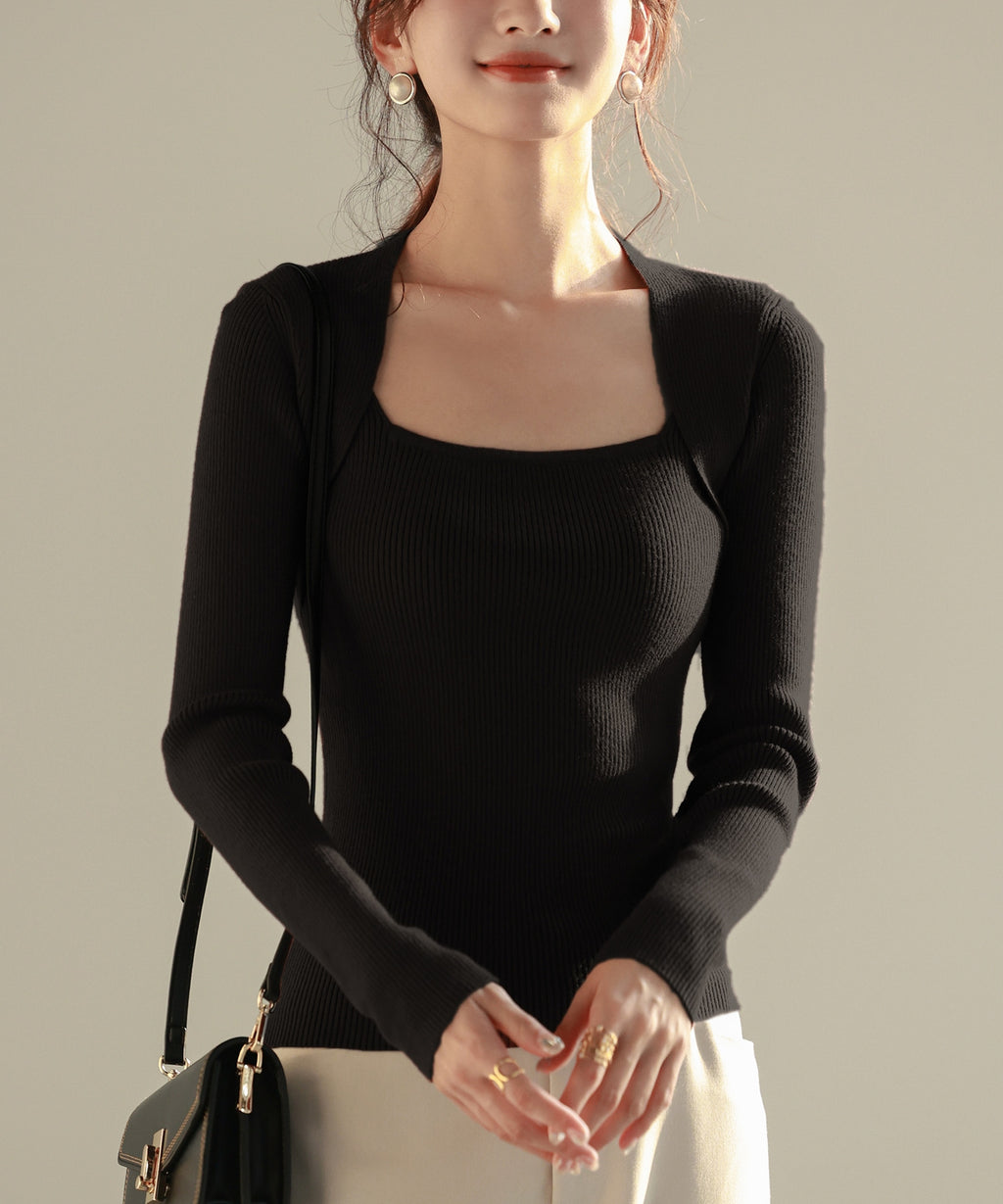 A simple ribbed knit with a layered-style square neck that opens wide at the chest adds a touch of effortless style.