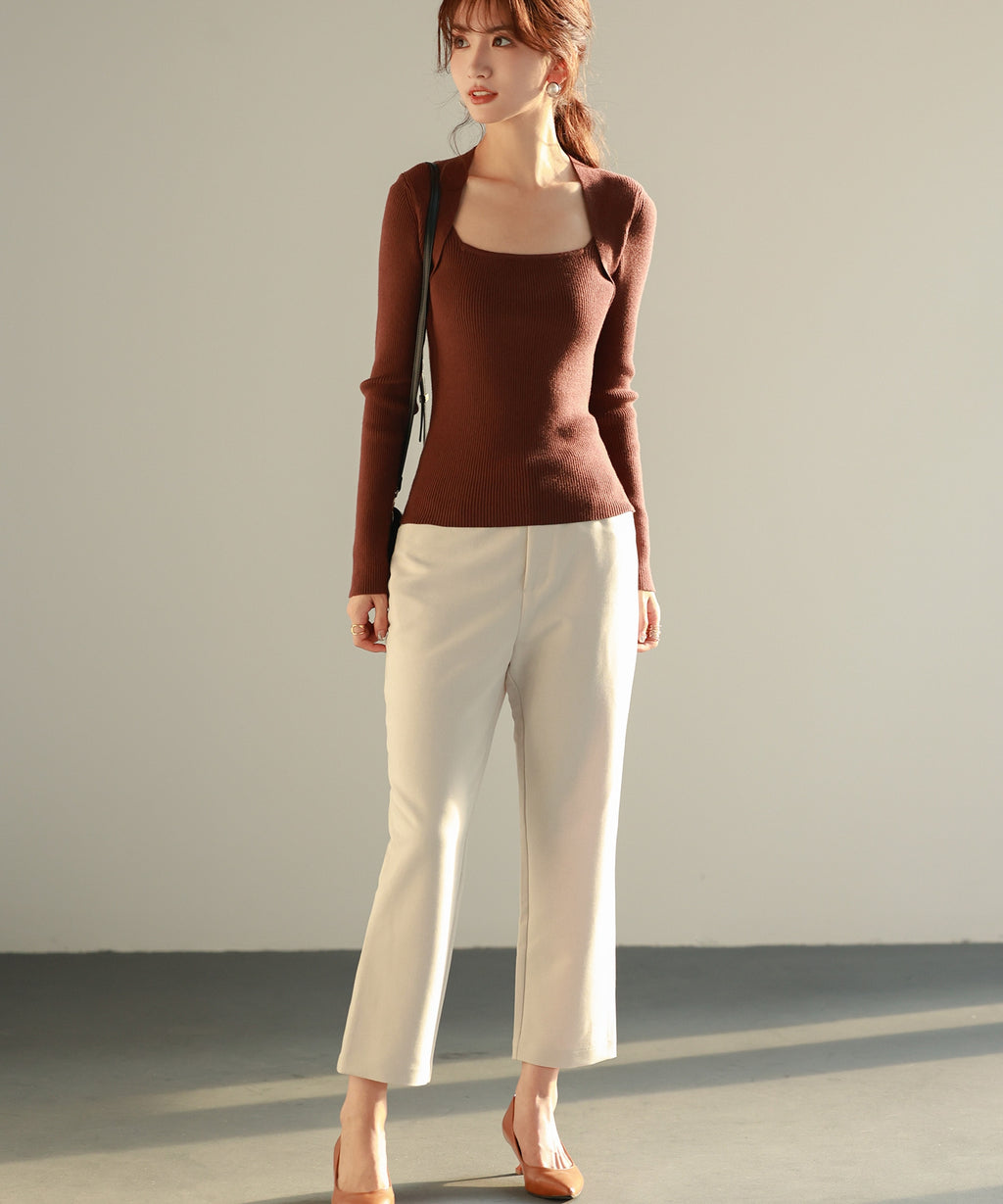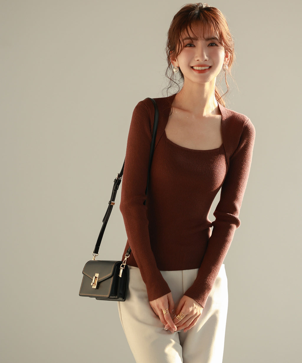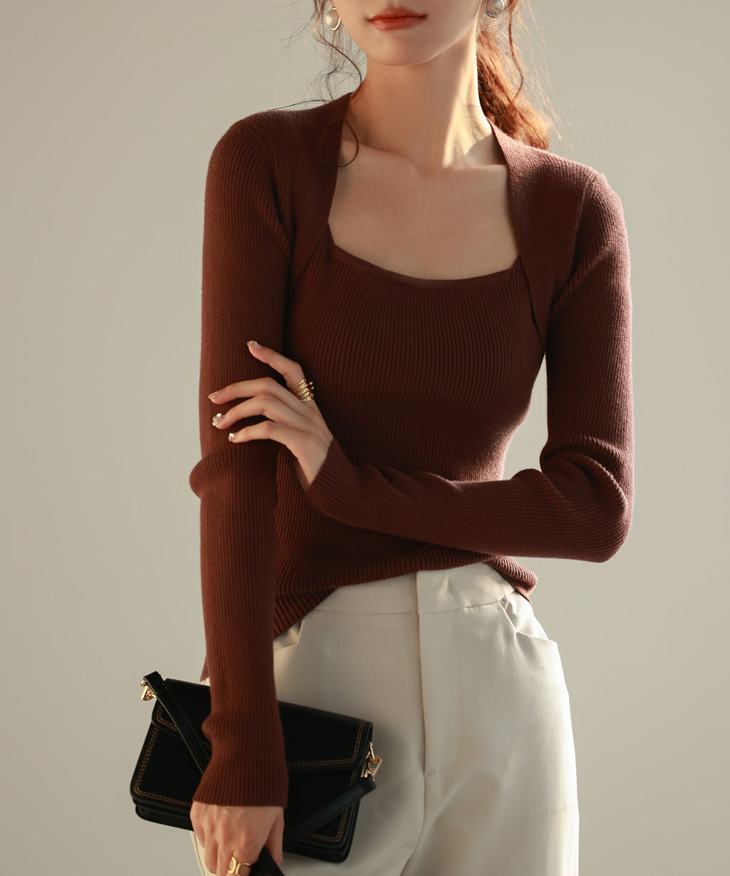 A simple ribbed knit with a layered-style square neck that opens wide at the chest adds a touch of effortless style.