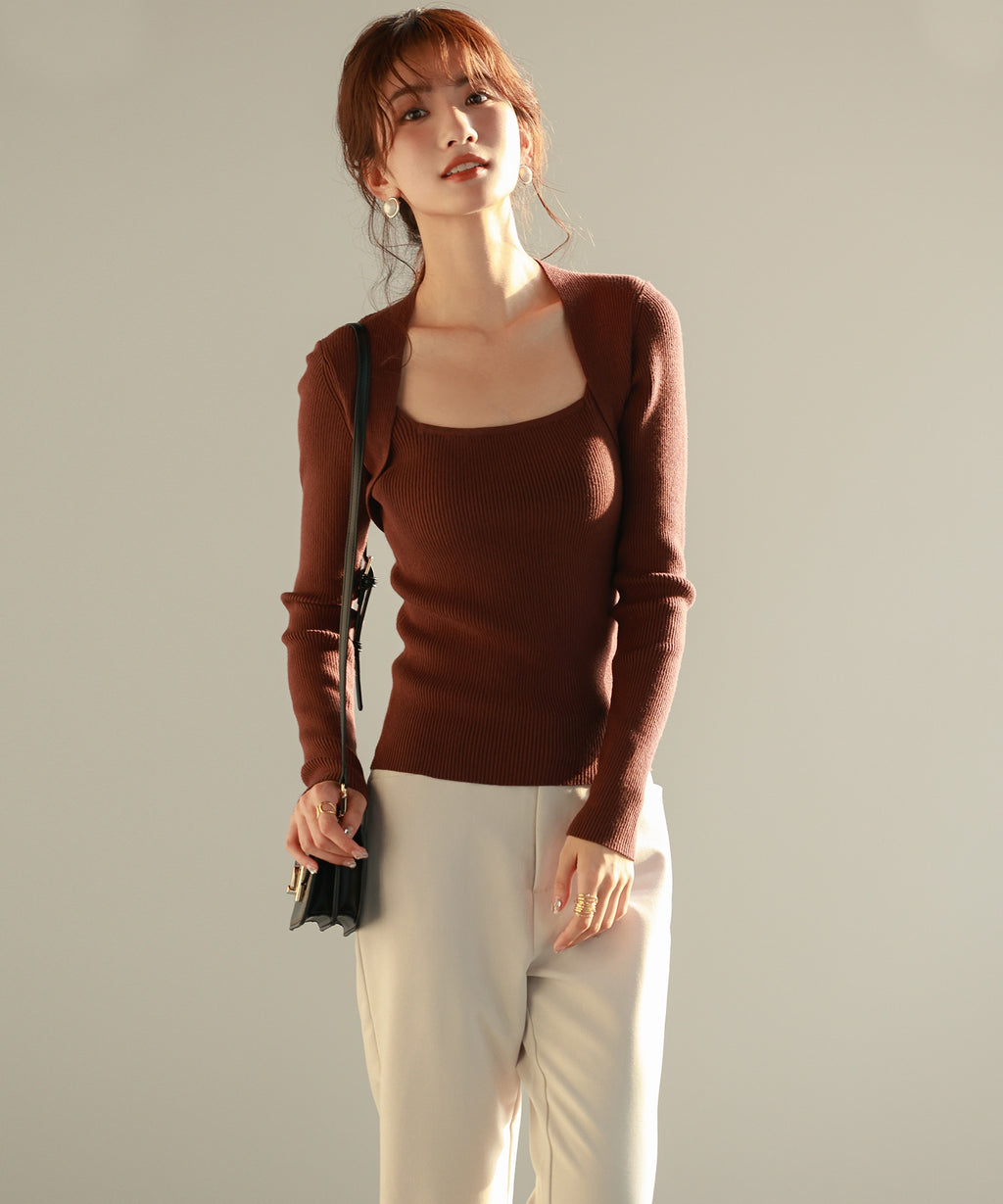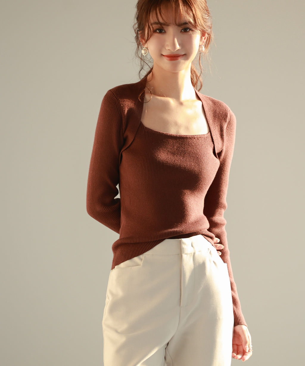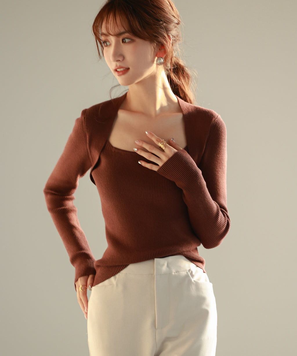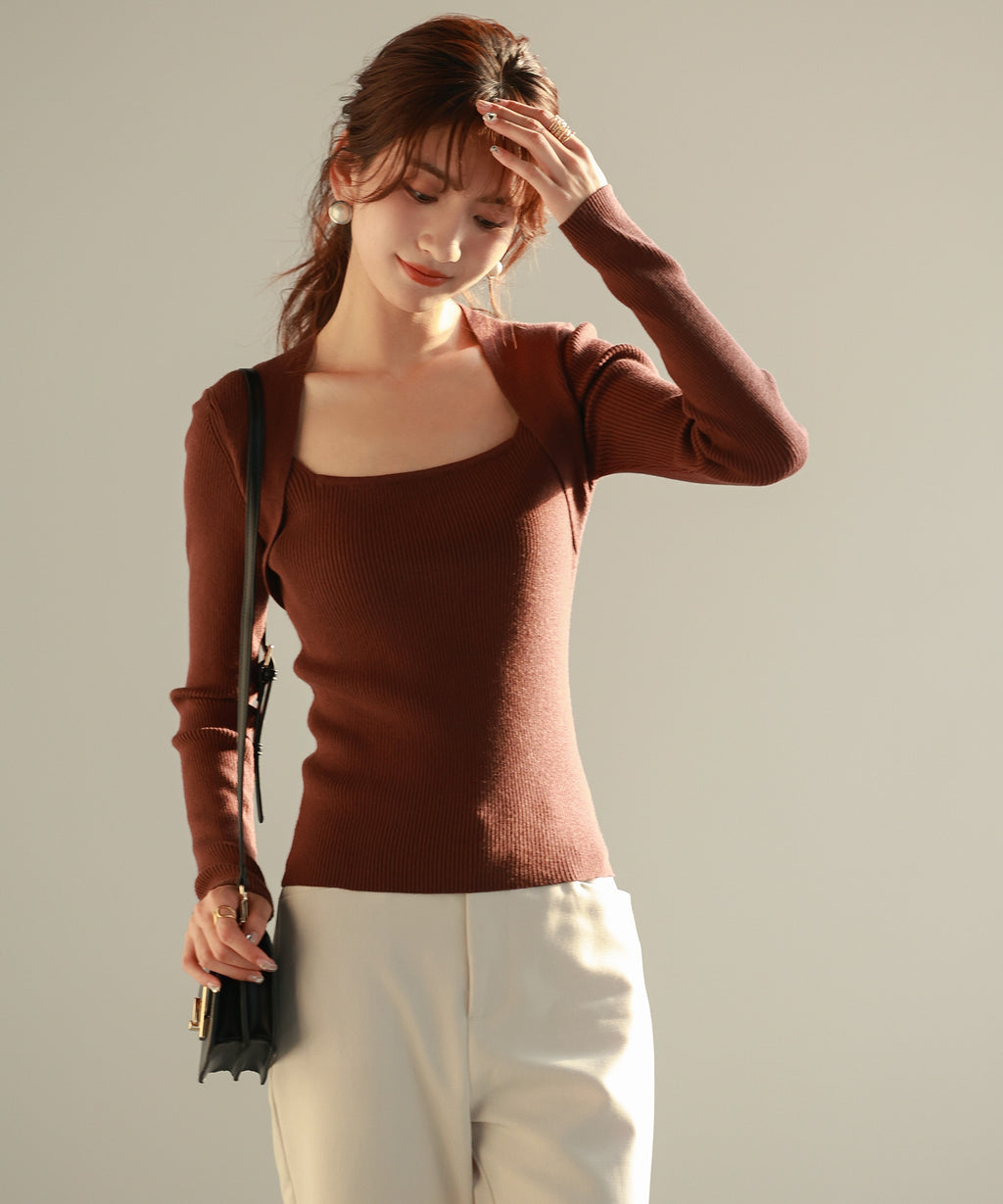 A simple ribbed knit with a layered-style square neck that opens wide at the chest adds a touch of effortless style.