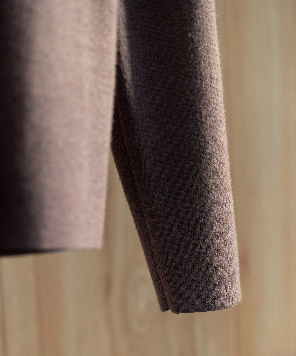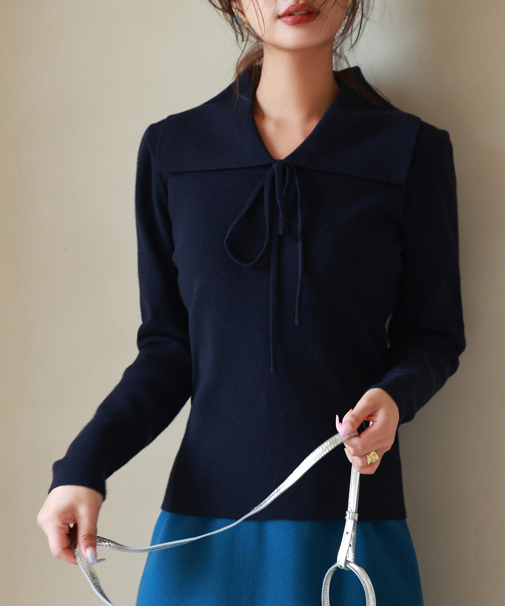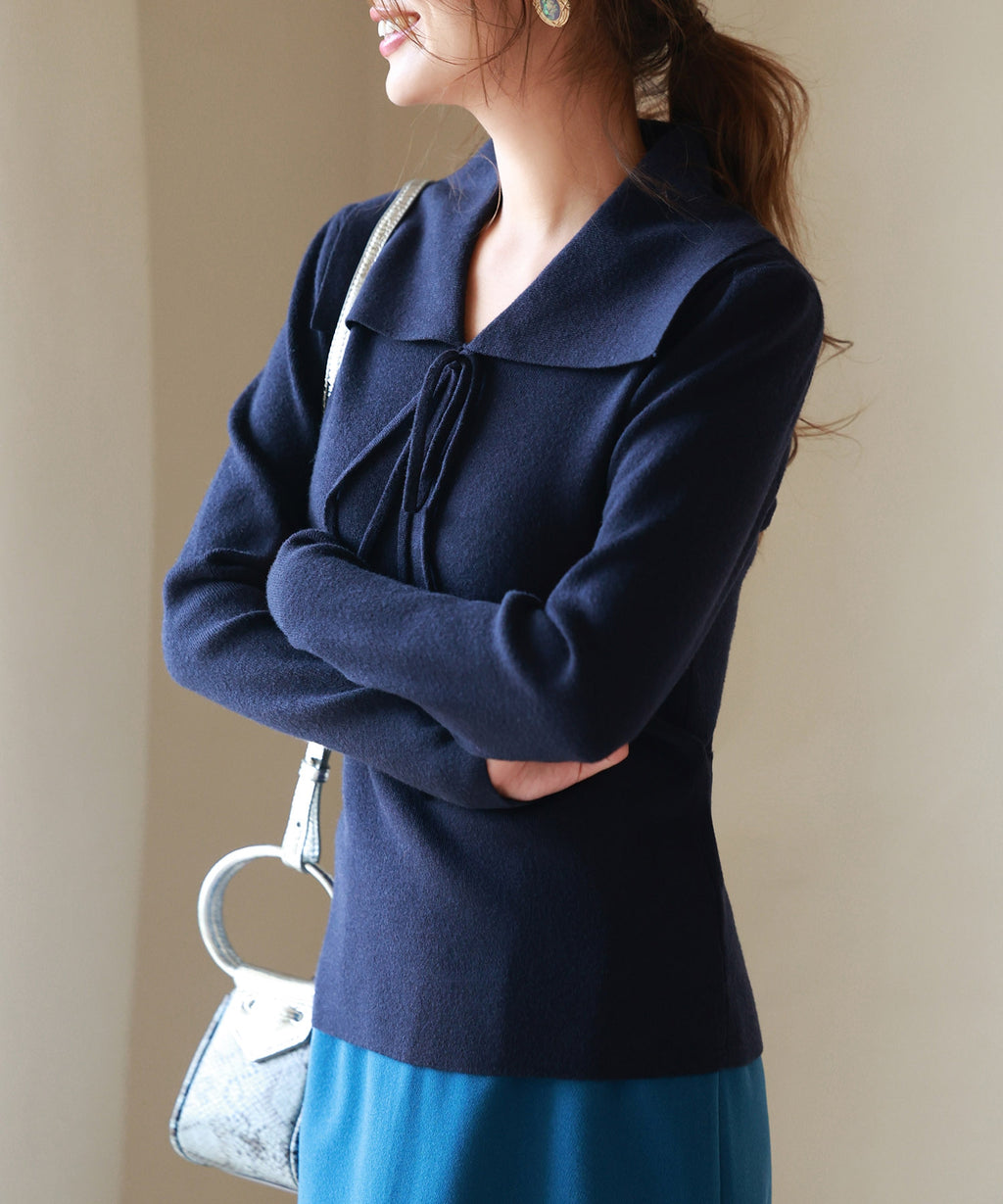 ボリューム感のあるビッグカラーが目を引くニットプルオーバー。