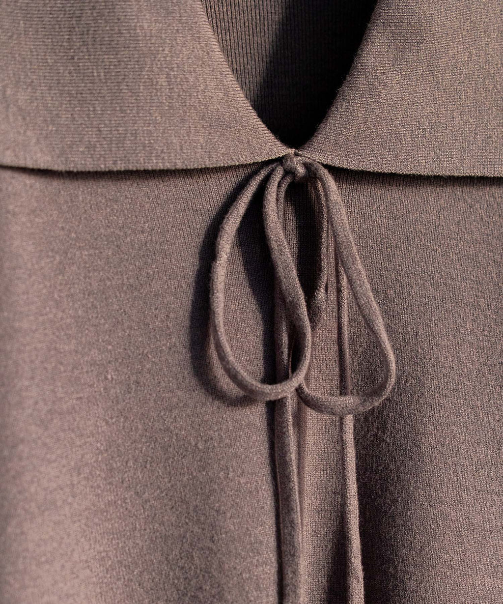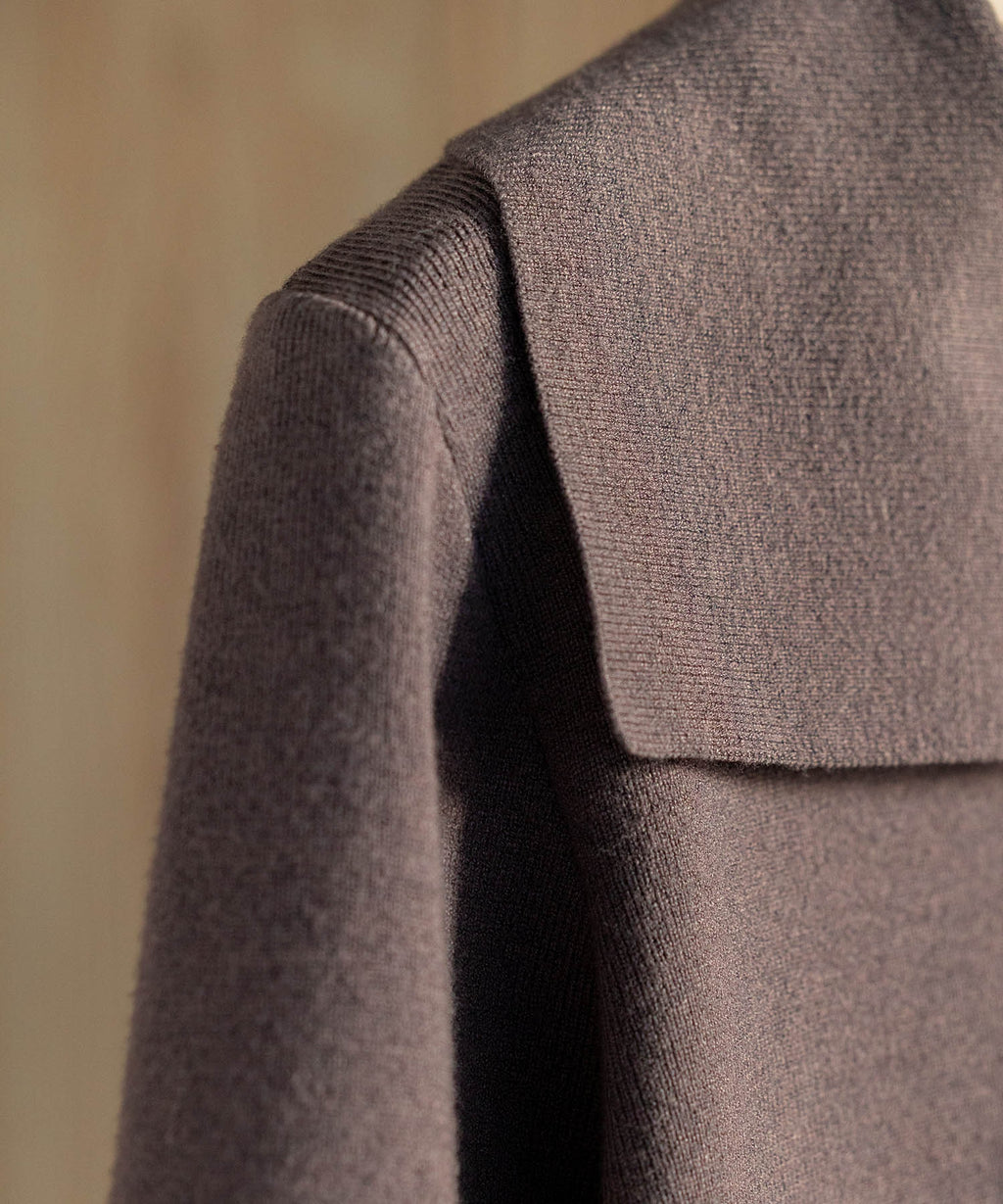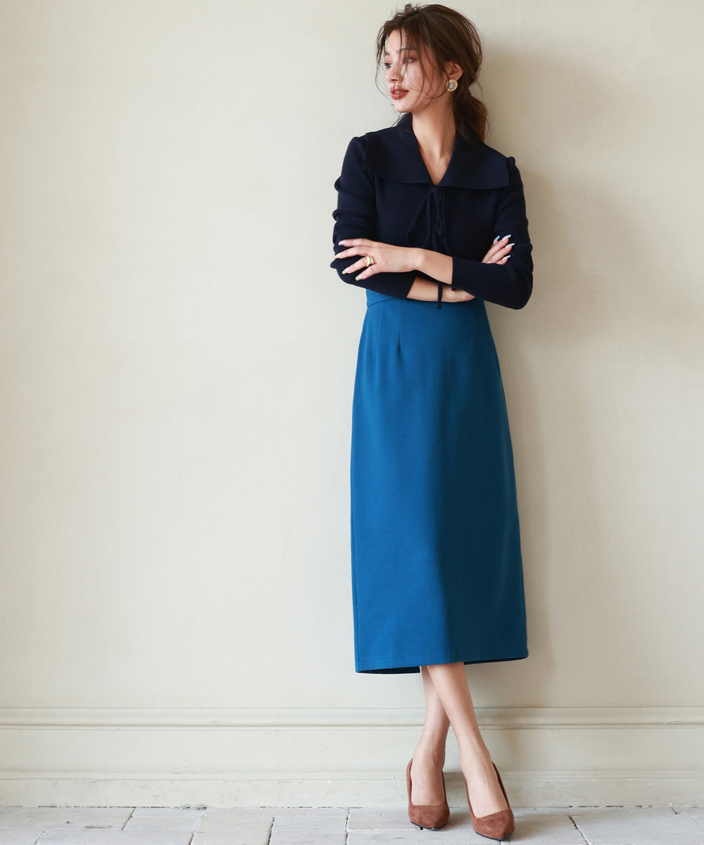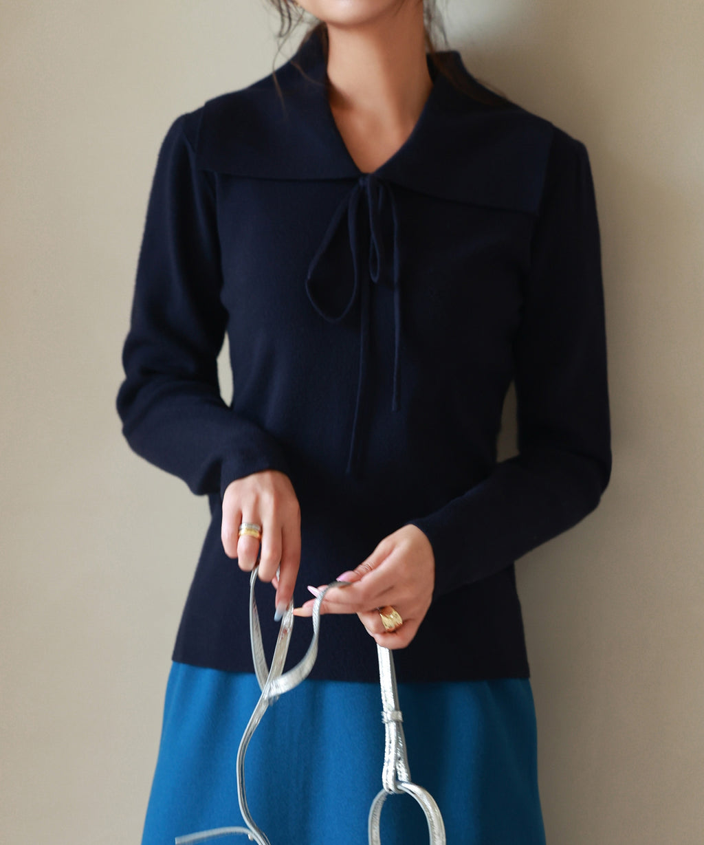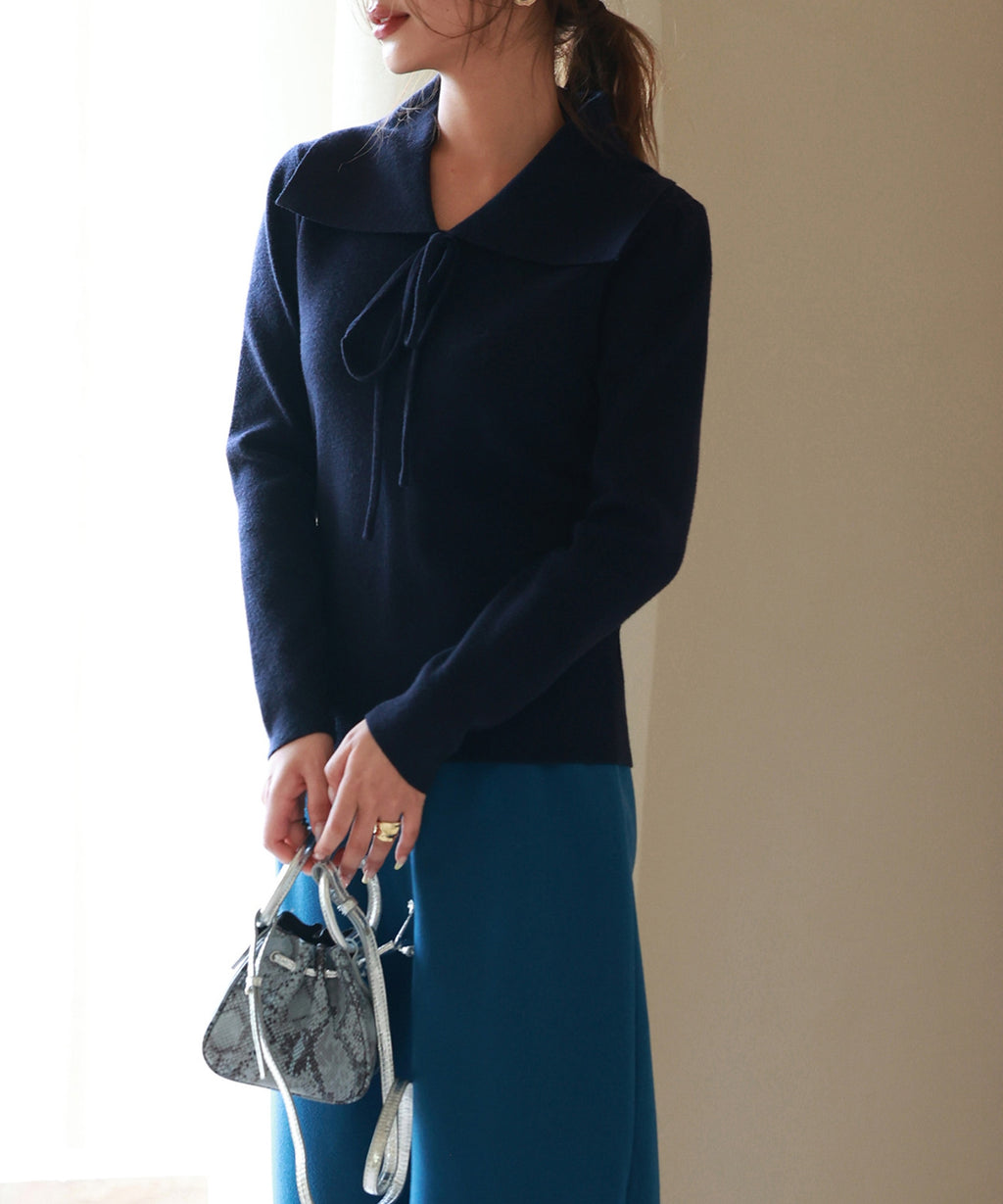 ネック周りは大胆なビッグカラーでフェミニンに。