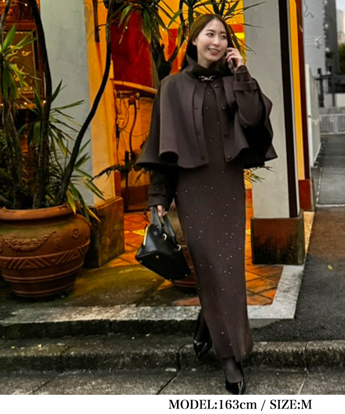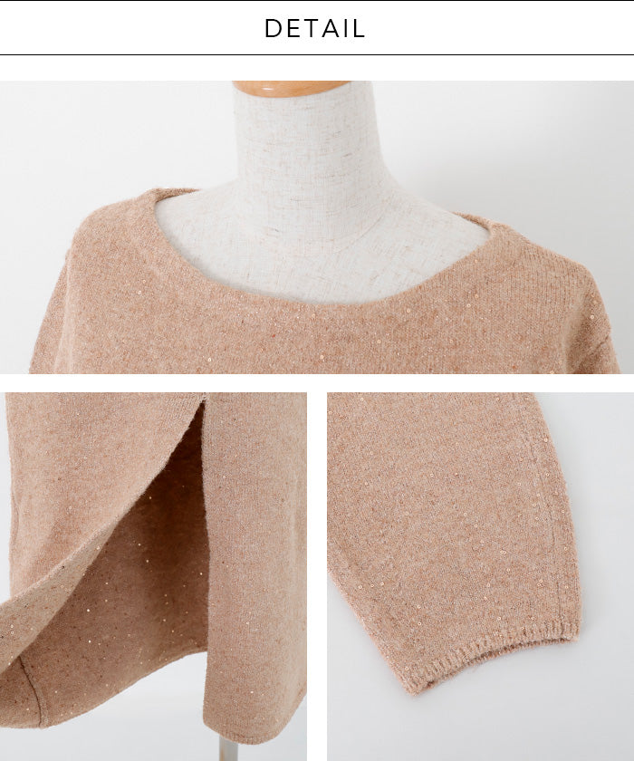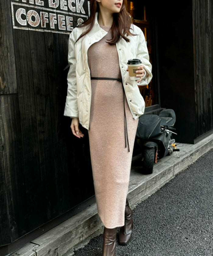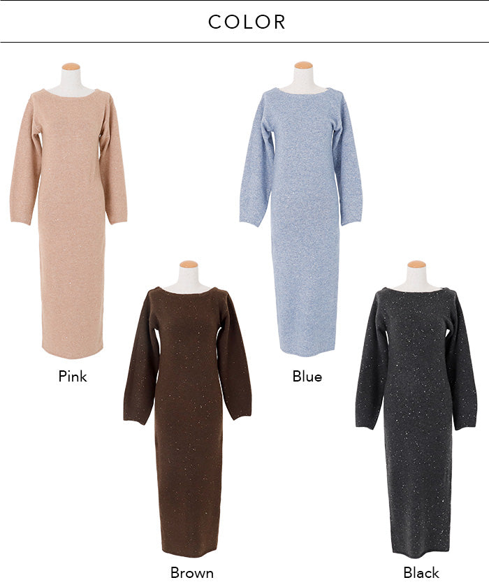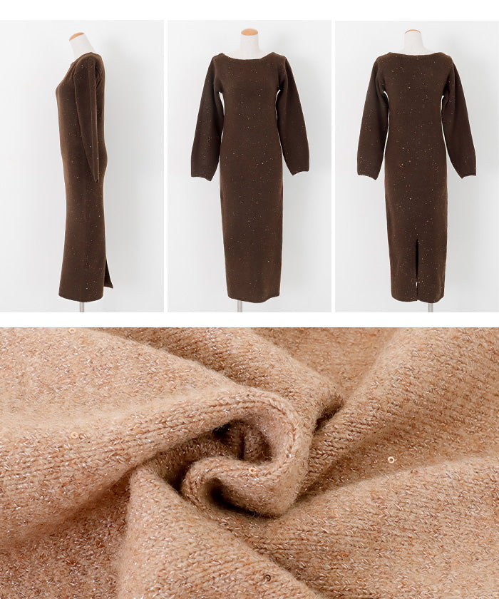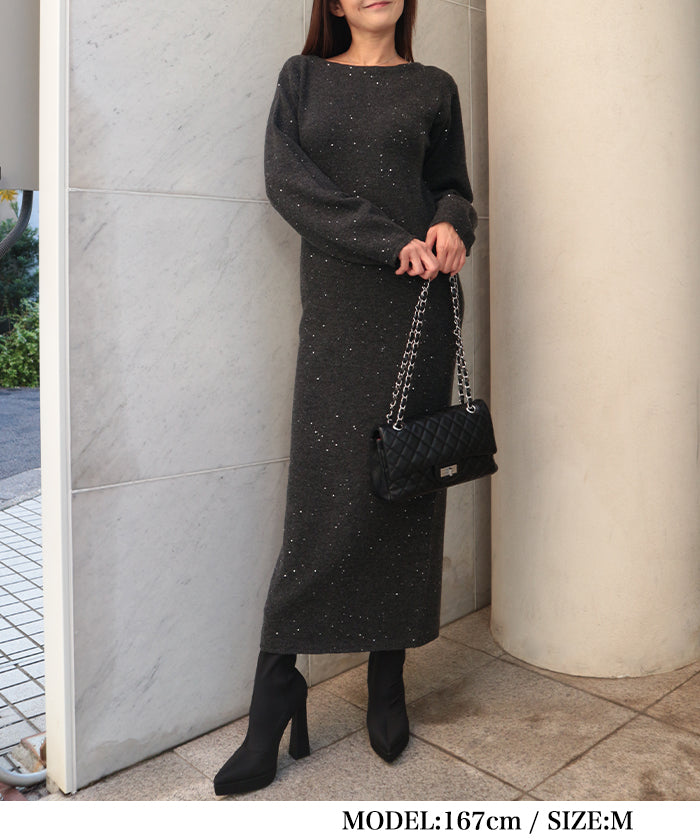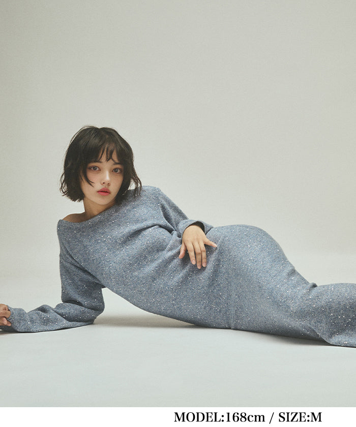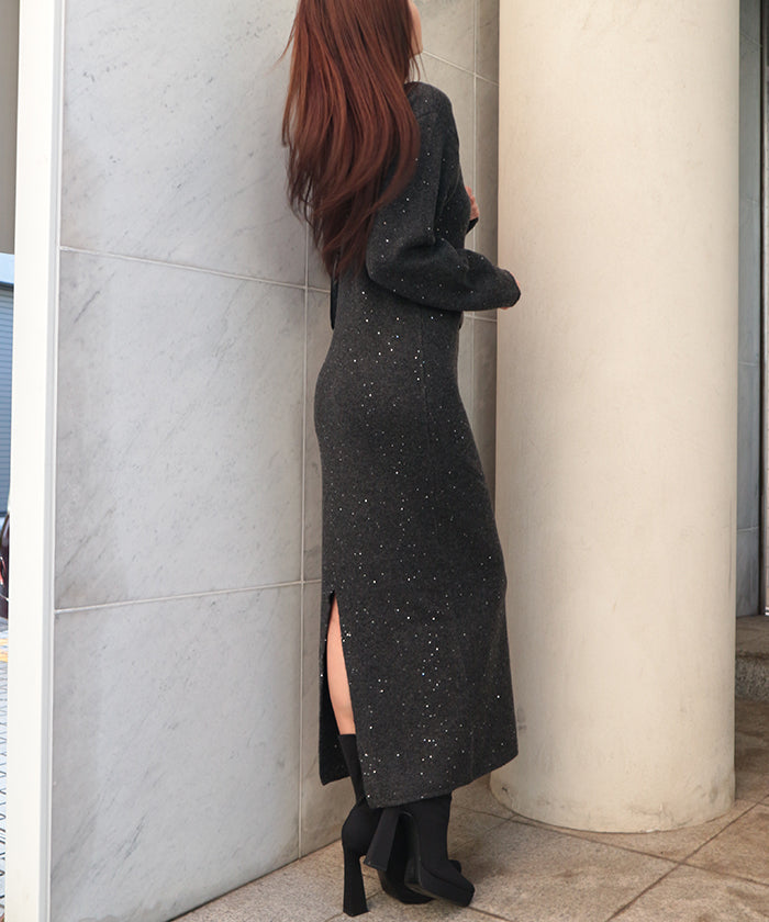 A glamorous knit long dress with a mix of mohair-touch yarn and glitter yarn, adorned with sequins scattered all over.
