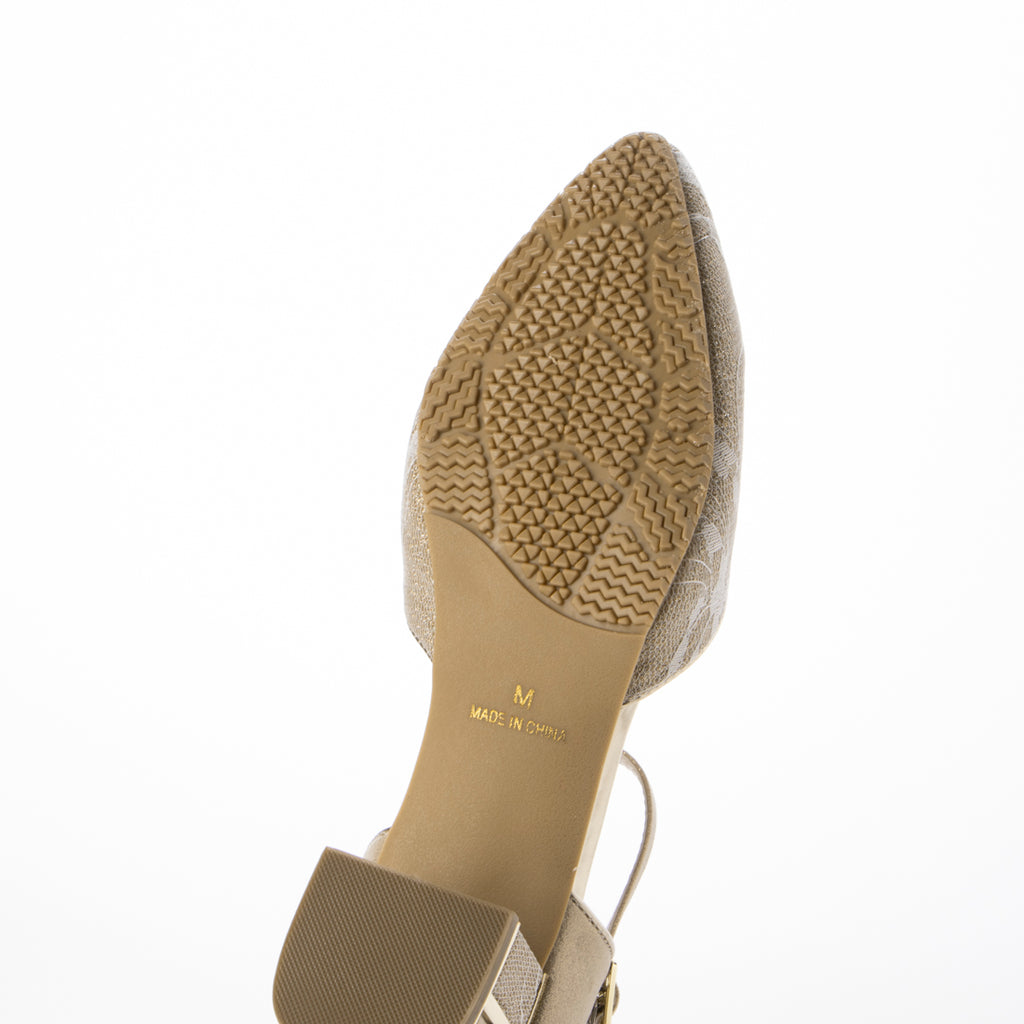 "Chunky Heel Pumps" with a striking race and glitter fabric.