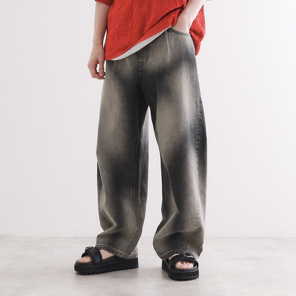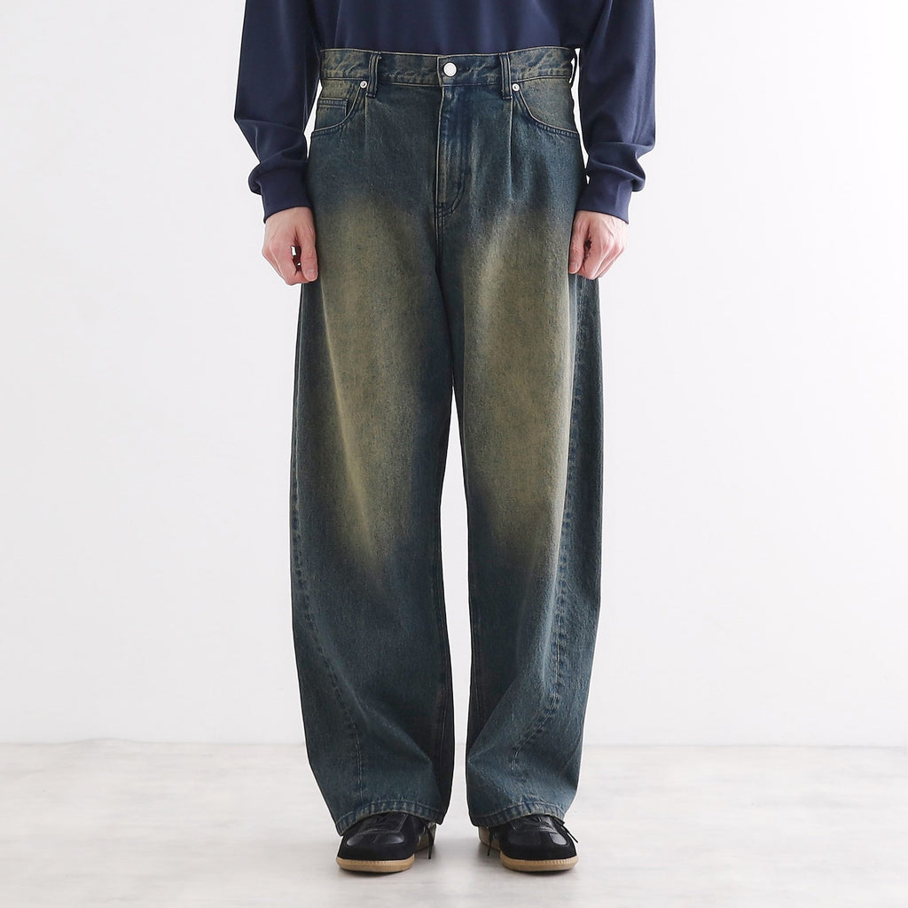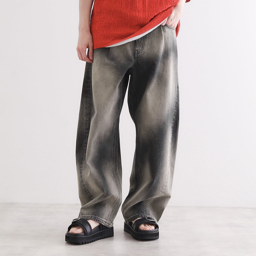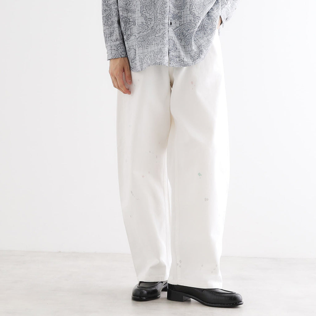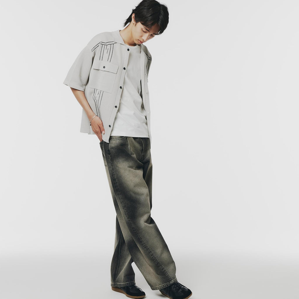 The silhouette is designed to be wide from the knees and tapering towards the hem, creating a low center of gravity and a three-dimensional effect by shifting the horizontal line forward.