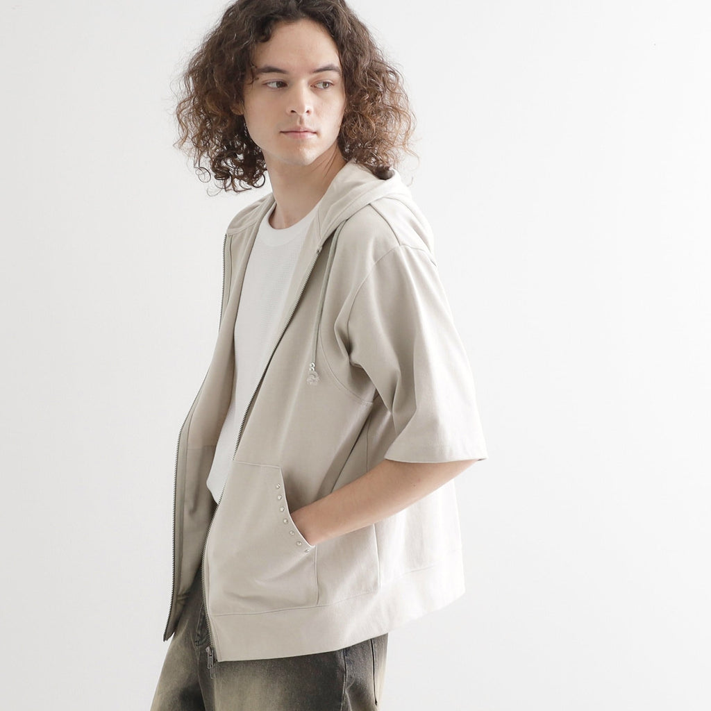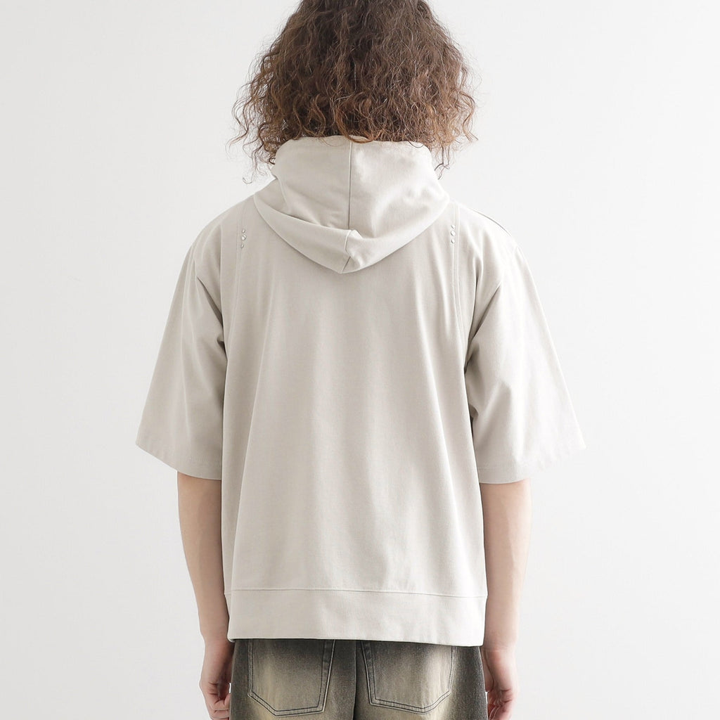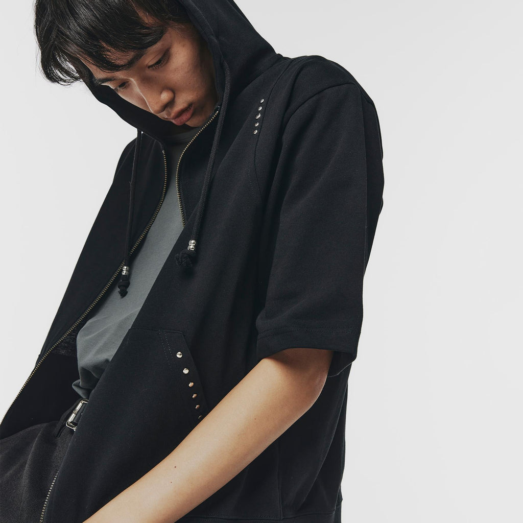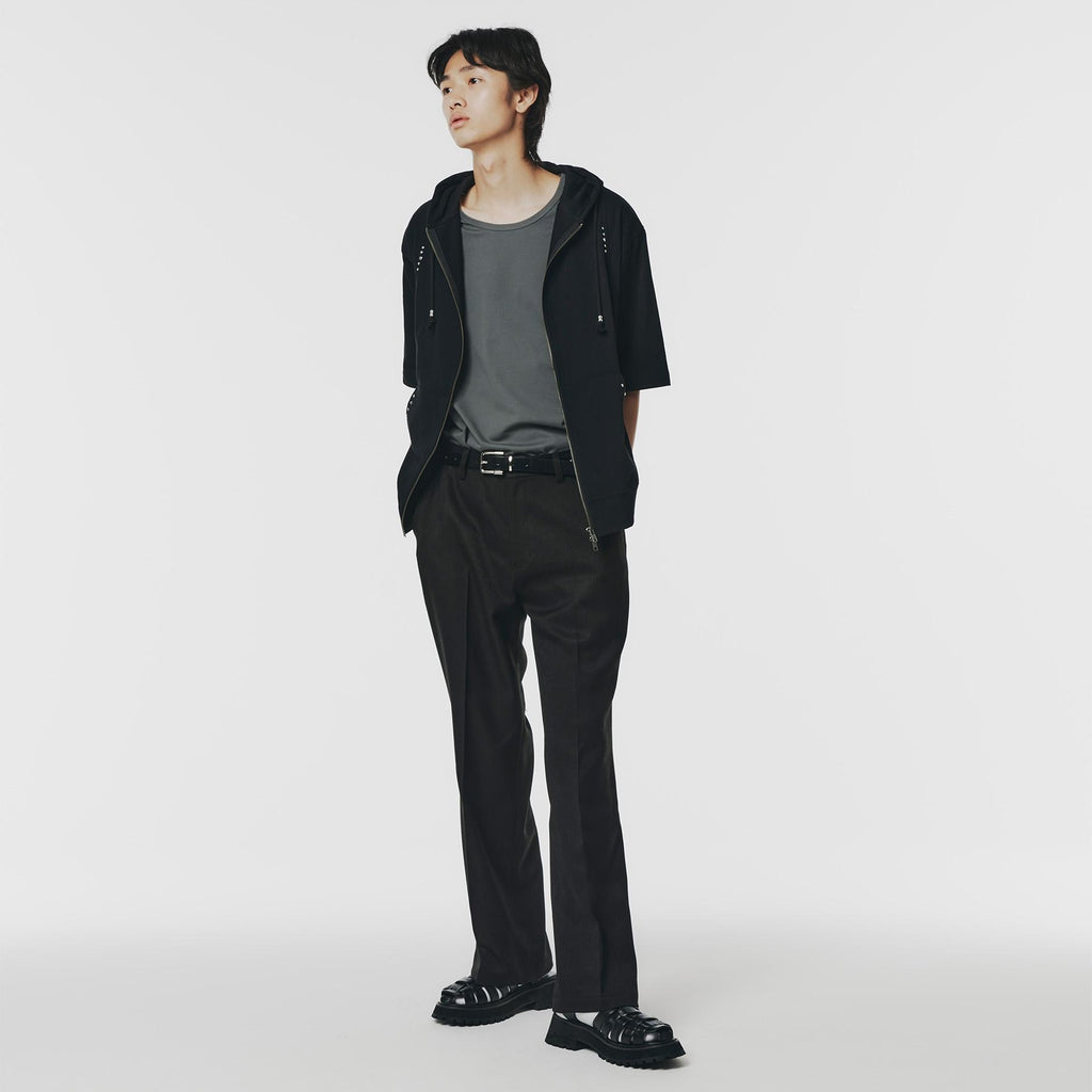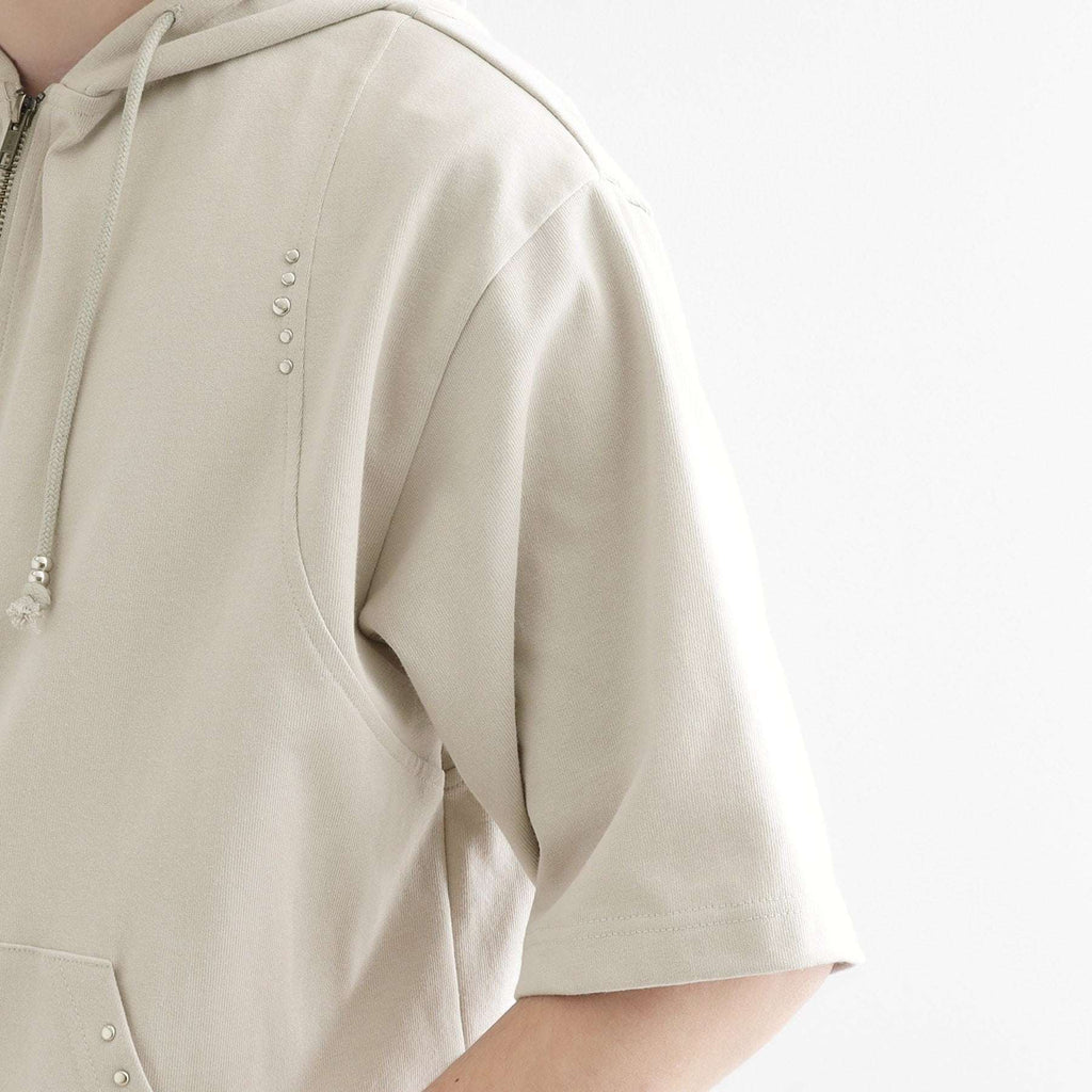 The width and shoulder width are moderately relaxed, and the length is kept short with a small overall fit, creating a compact look when worn.