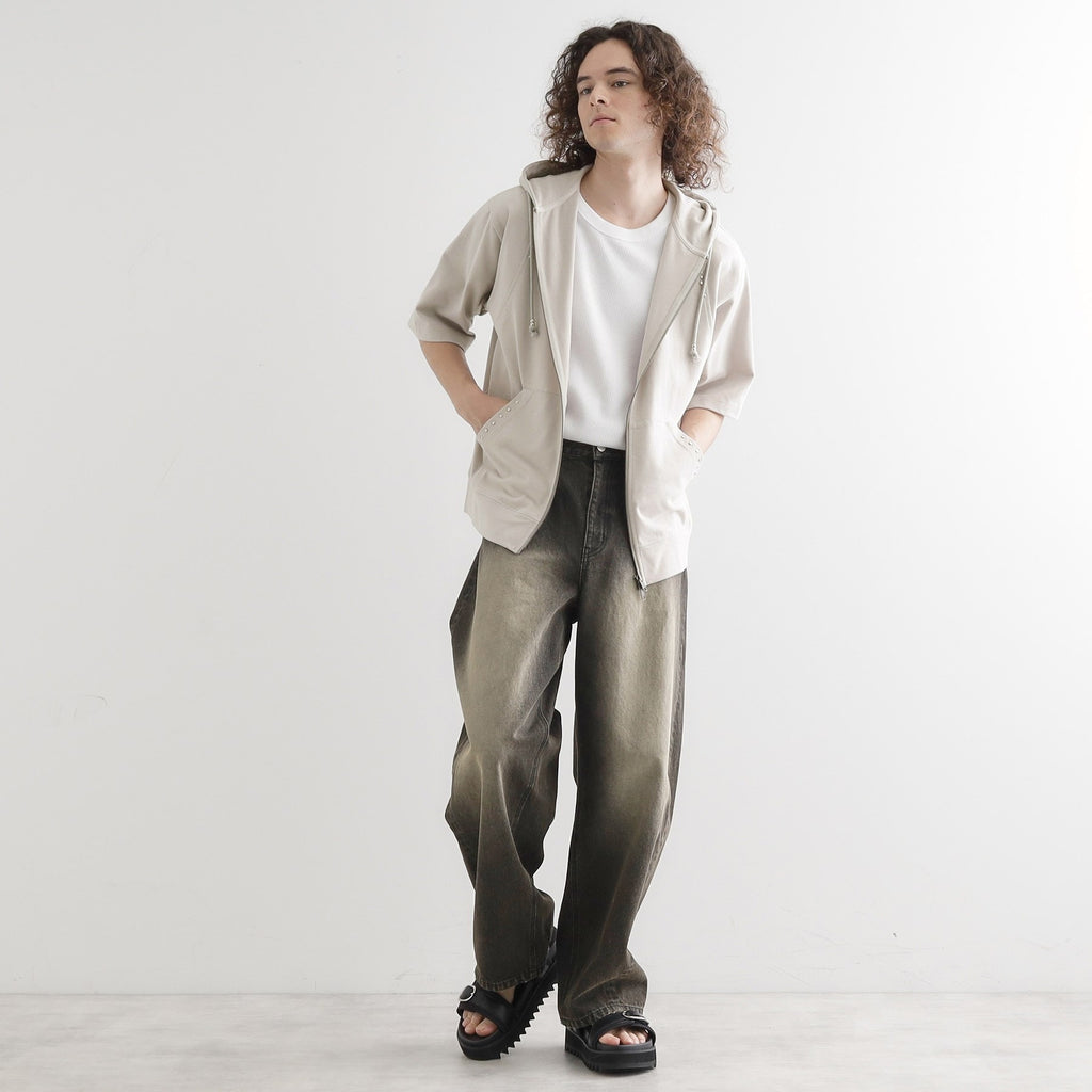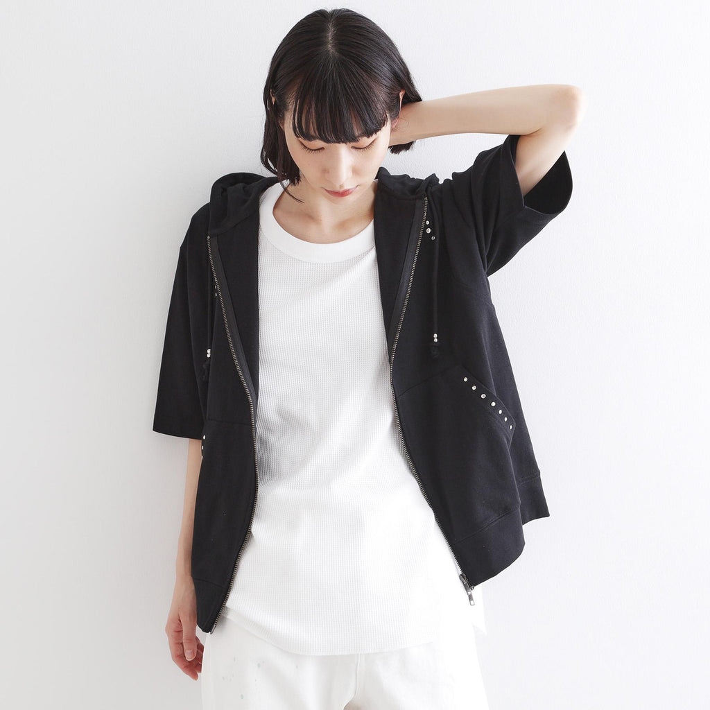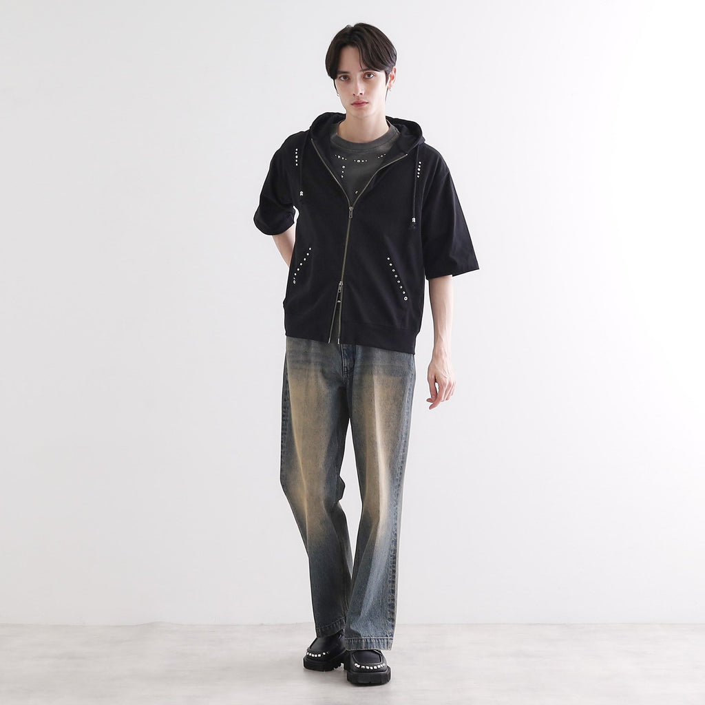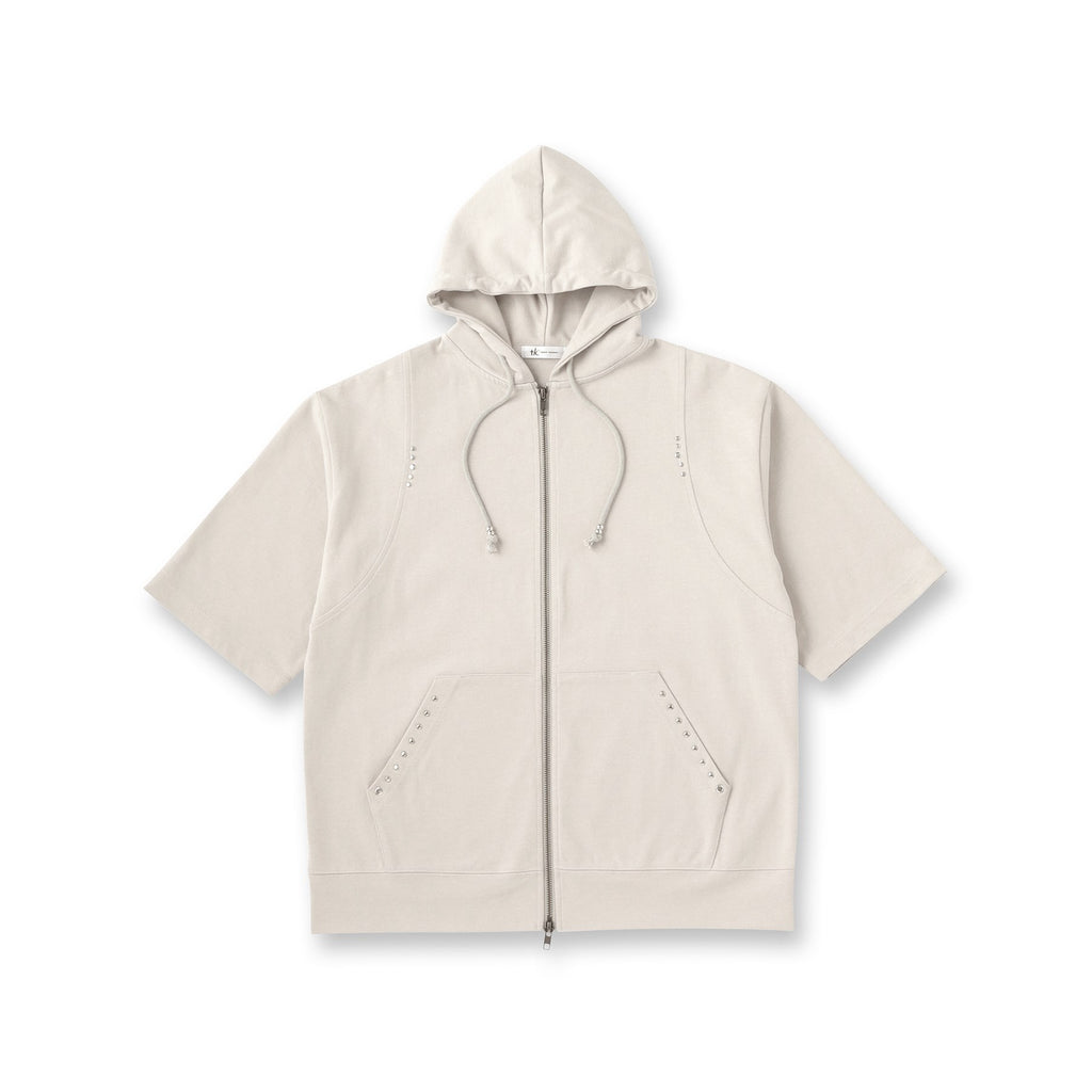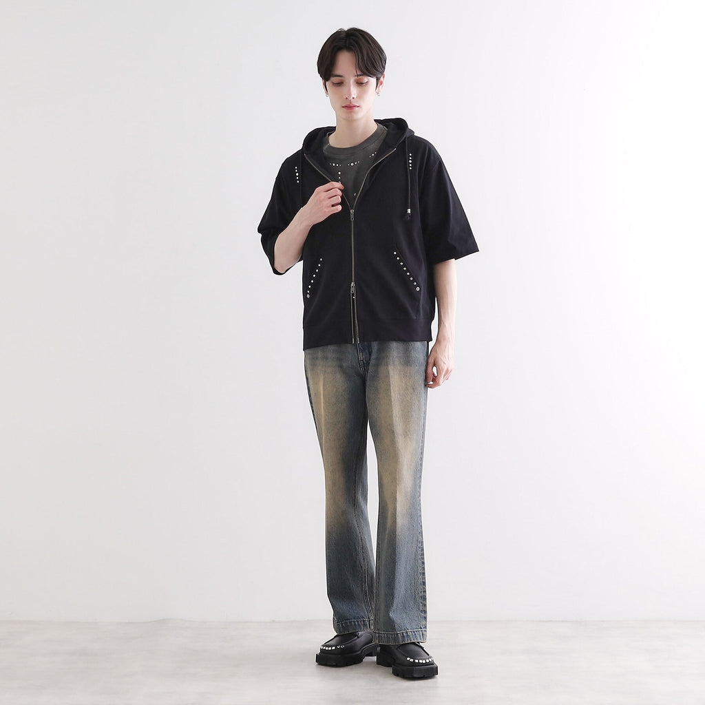 The width and shoulder width are moderately relaxed, and the length is kept short with a small overall fit, creating a compact look when worn.