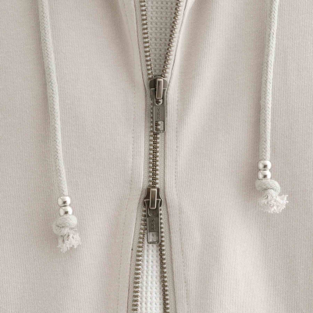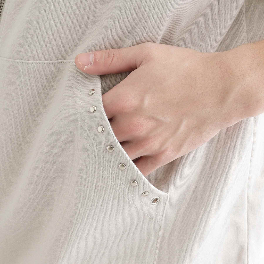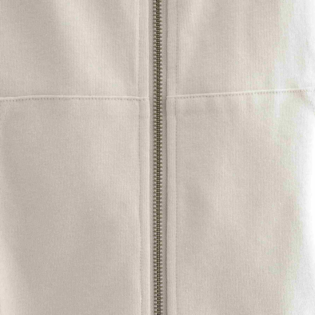 The front zipper is a reverse opening (with sliders at the top and bottom), allowing for an open-from-the-bottom style when closed.