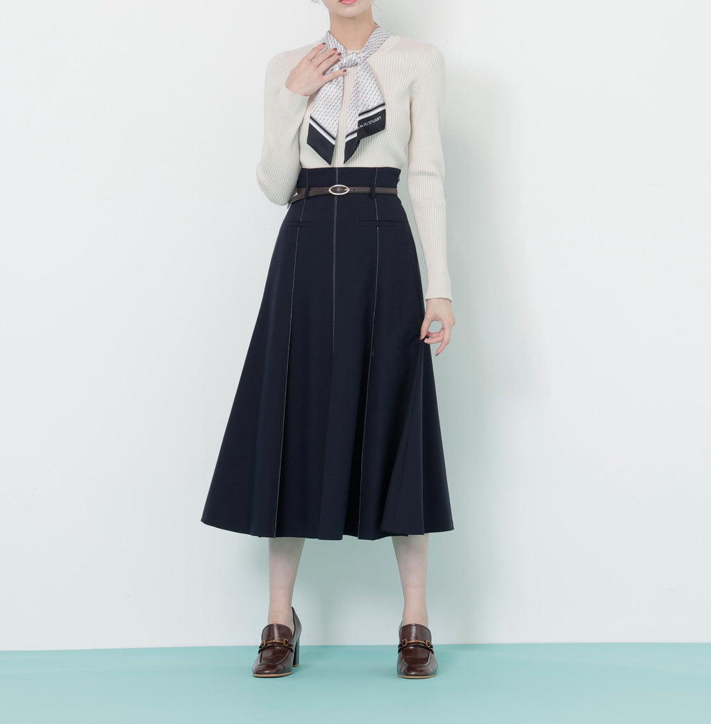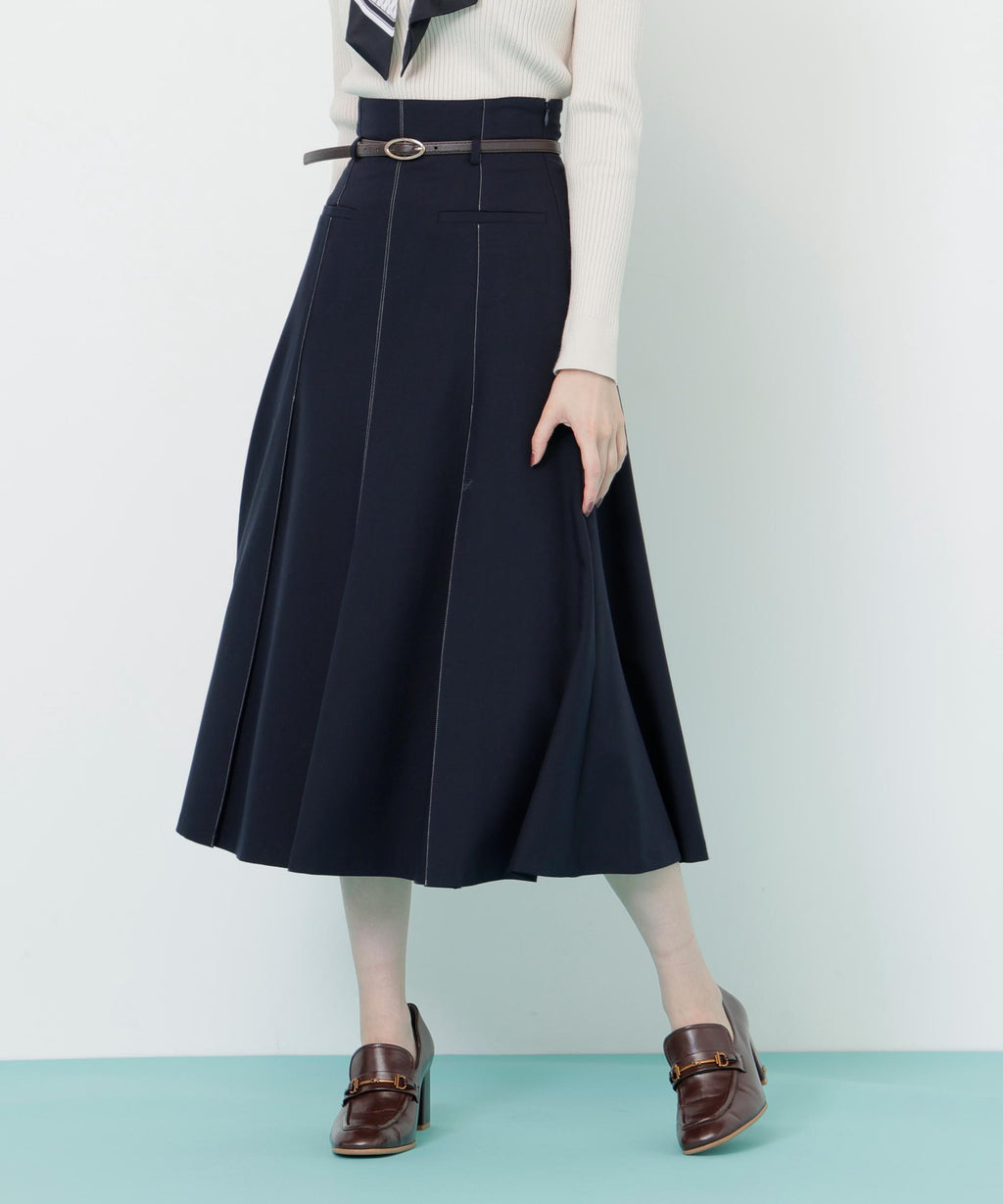 A semi-flare skirt with a high waist that creates a sleek waistline. The box pockets are decorative, contributing to a beautiful silhouette. The bicolor stitch design is also a point of interest. The belt, which is a fall/winter trend, features an oval buckle for a high-end look. It comes with a faux leather belt matching the color of the skirt. *Please note that the color may appear different due to lighting during photography.*