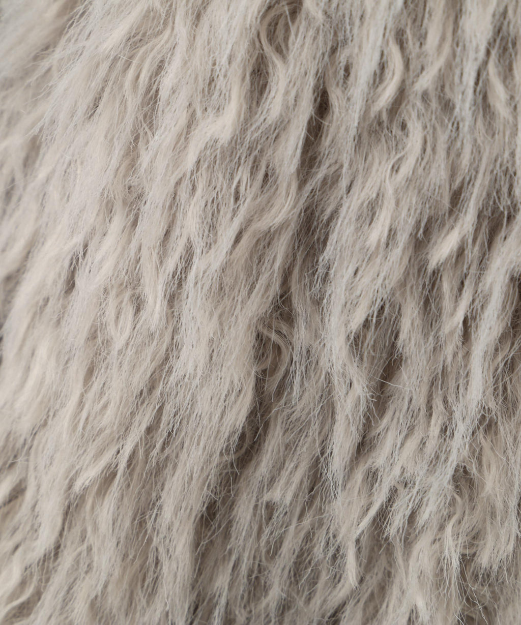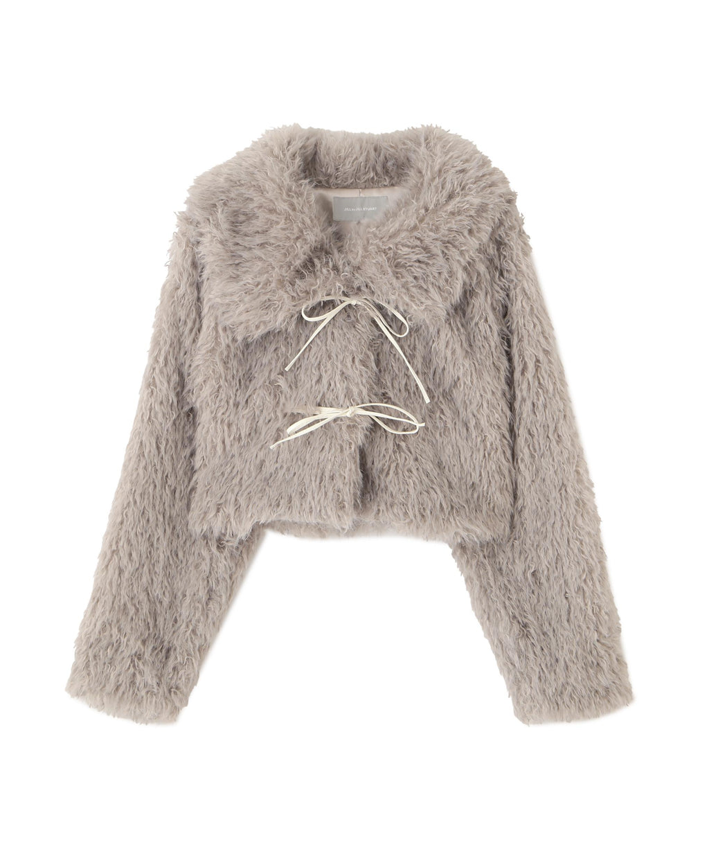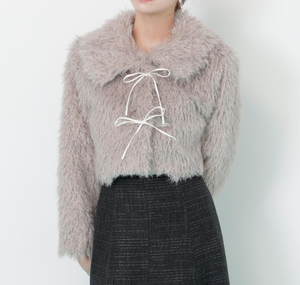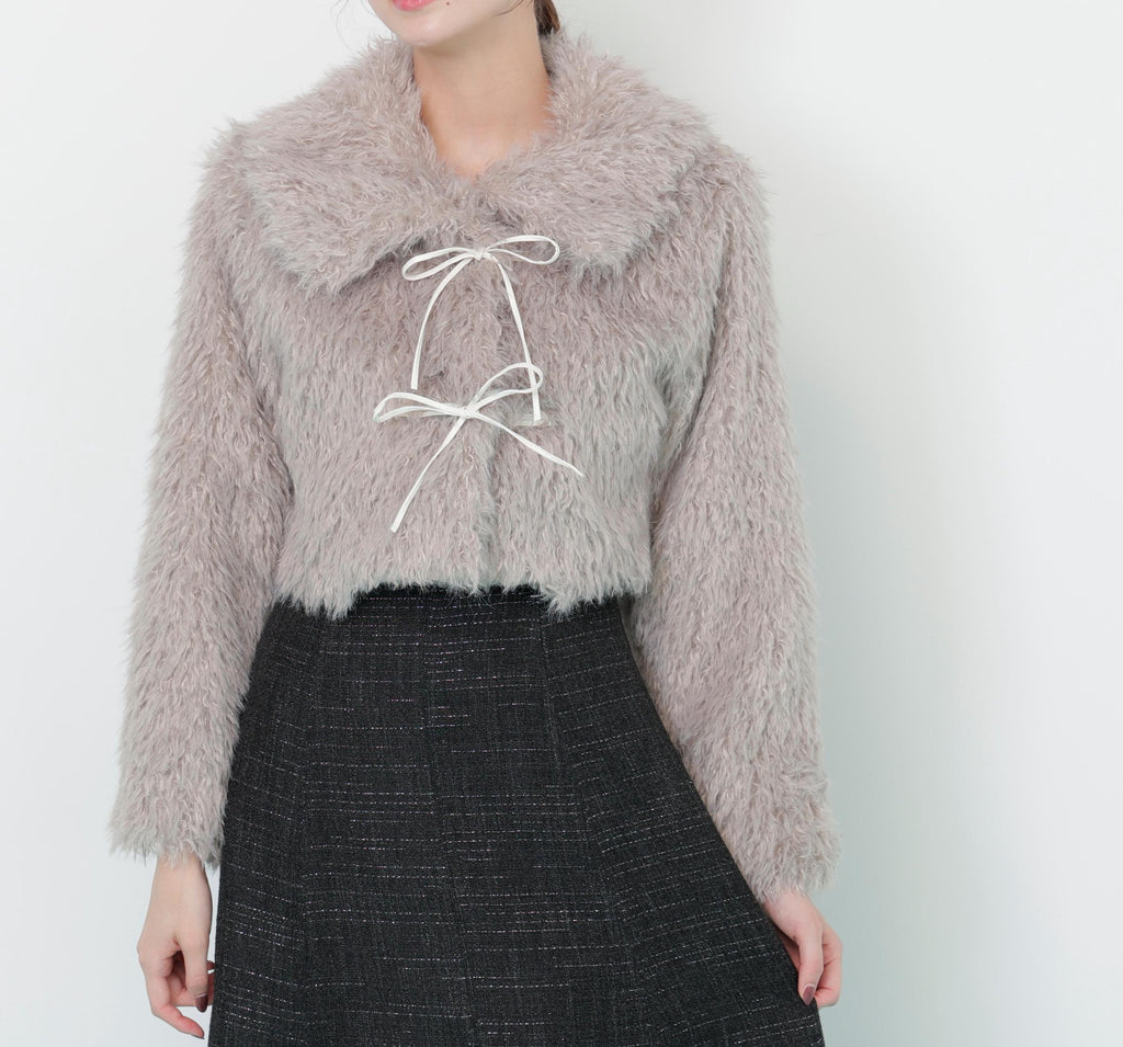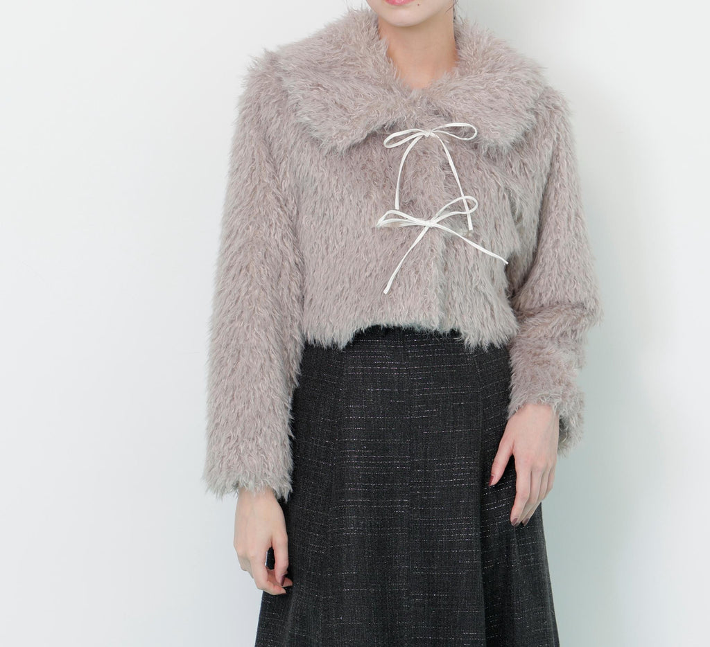 A short blazer made with trendy, long-haired, curly faux fur. It features a faux leather ribbon detail in a duffle coat style design. The faux leather ribbon is decorative, and the front buttons make it easy to put on and take off. The large collar is designed to create a face-enhancing effect. To prevent it from looking bulky, it has a compact silhouette. *Please note that the color may appear different due to lighting during photography.*